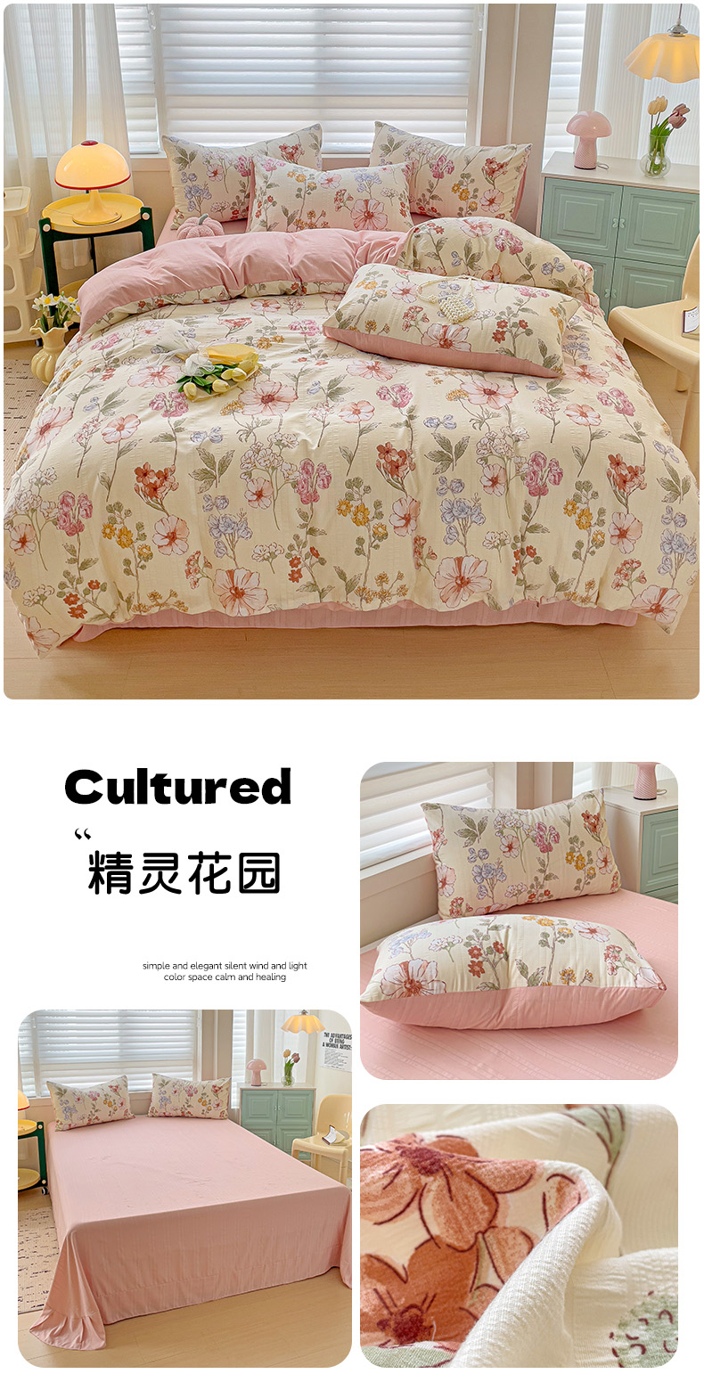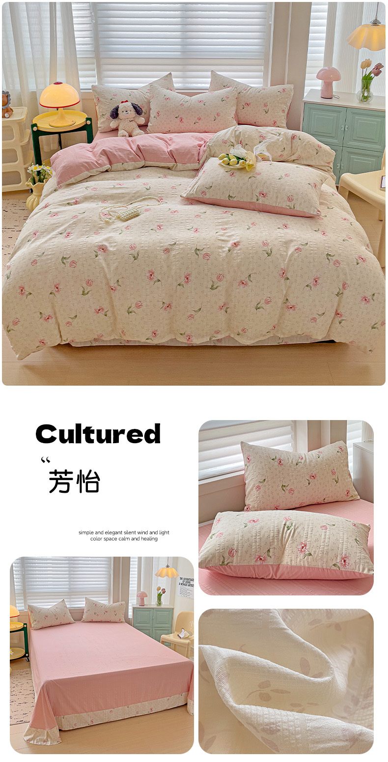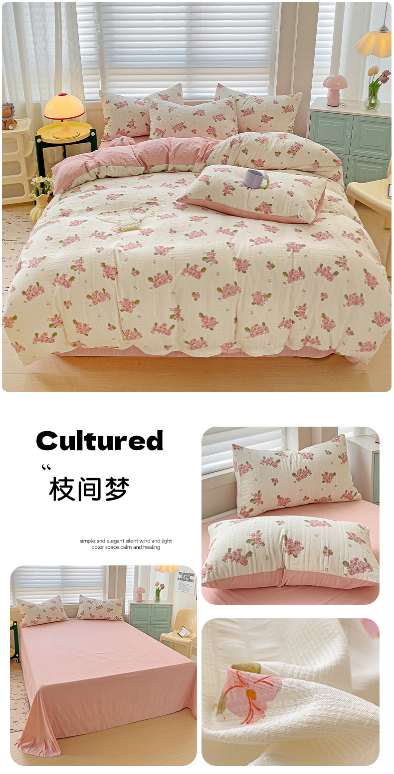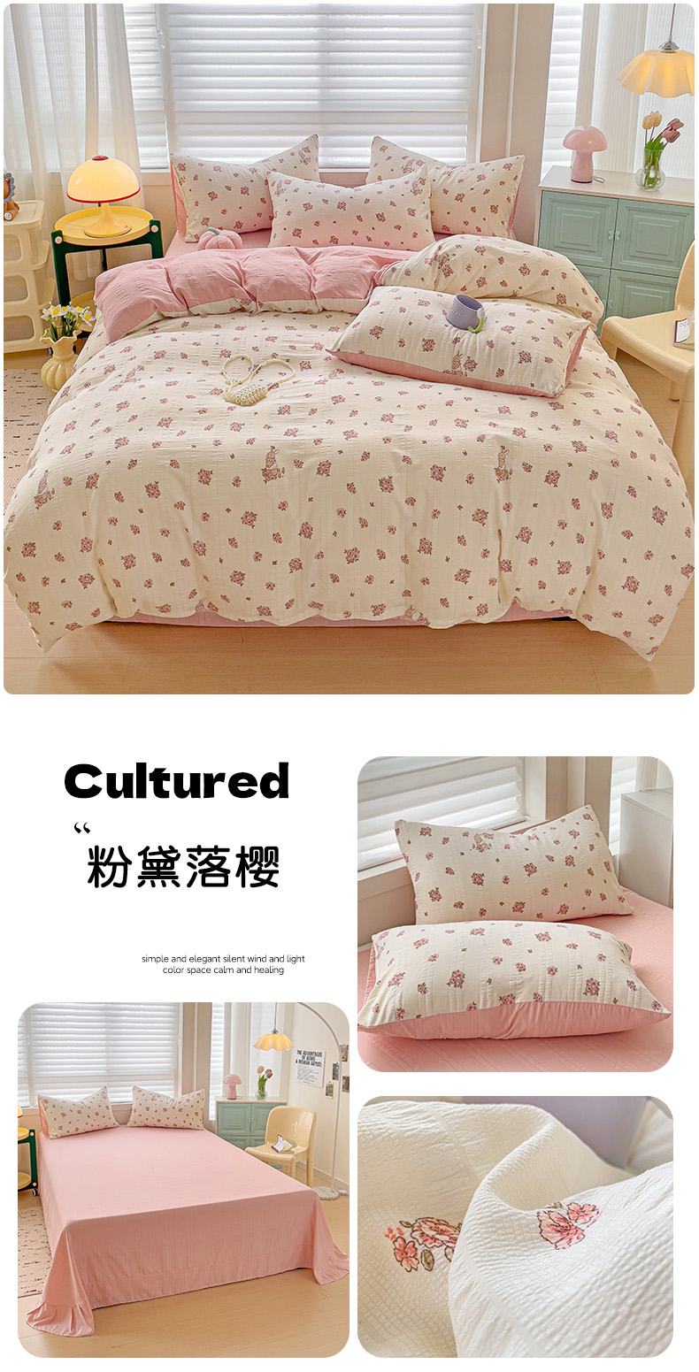 优选良品 2025新款韩版轻奢皱皱纱水洗棉拼色床单床笠四件套三件套-黛粉,黛粉
