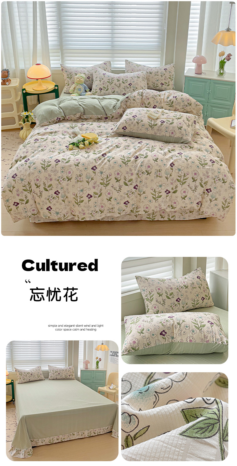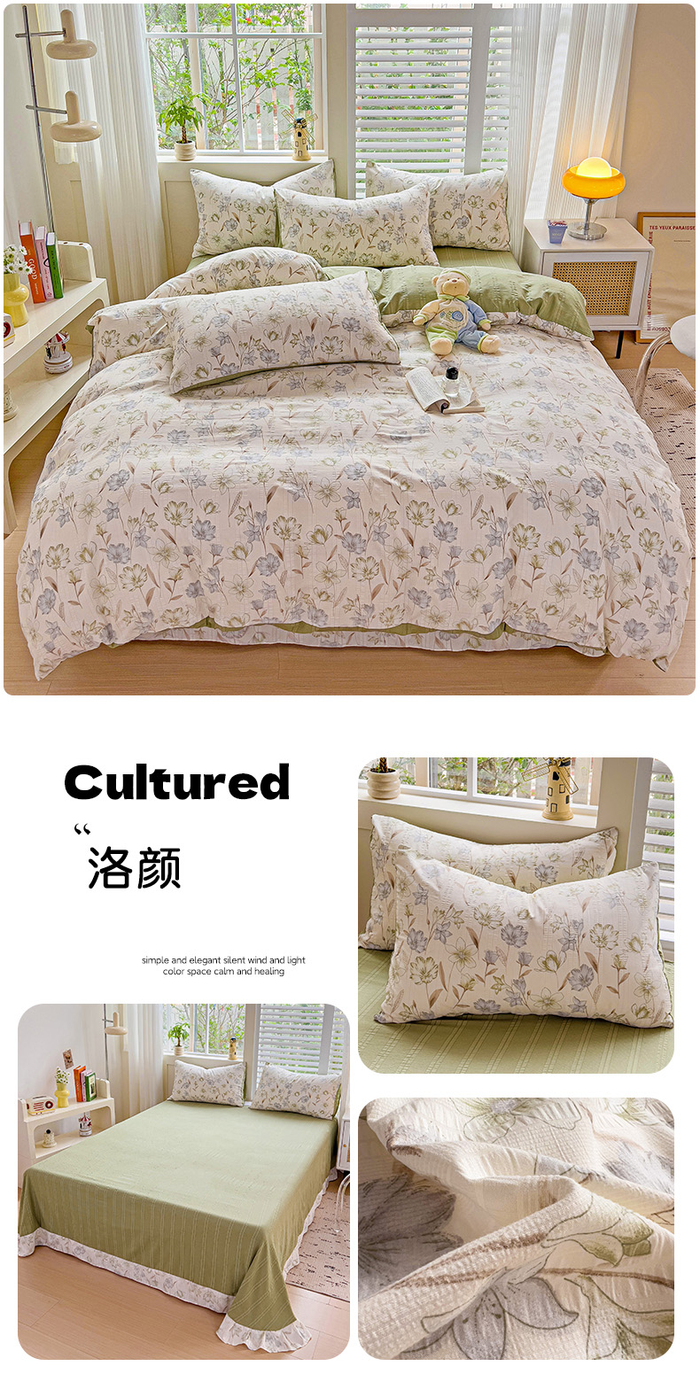 优选良品 2025新款韩版轻奢皱皱纱水洗棉拼色床单床笠四件套三件套-抹茶绿,抹茶绿