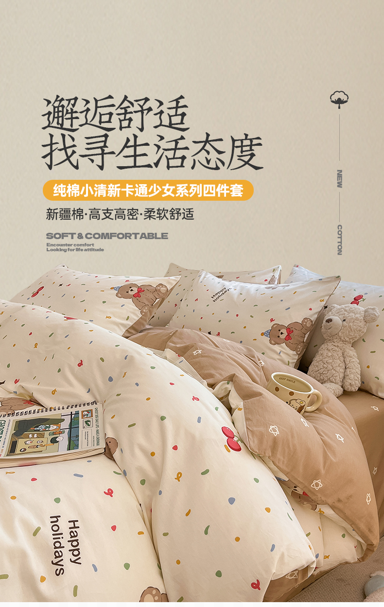 桃子家居 2024新款纯棉小清新卡通少女13372系列四件套 棉-玩偶熊