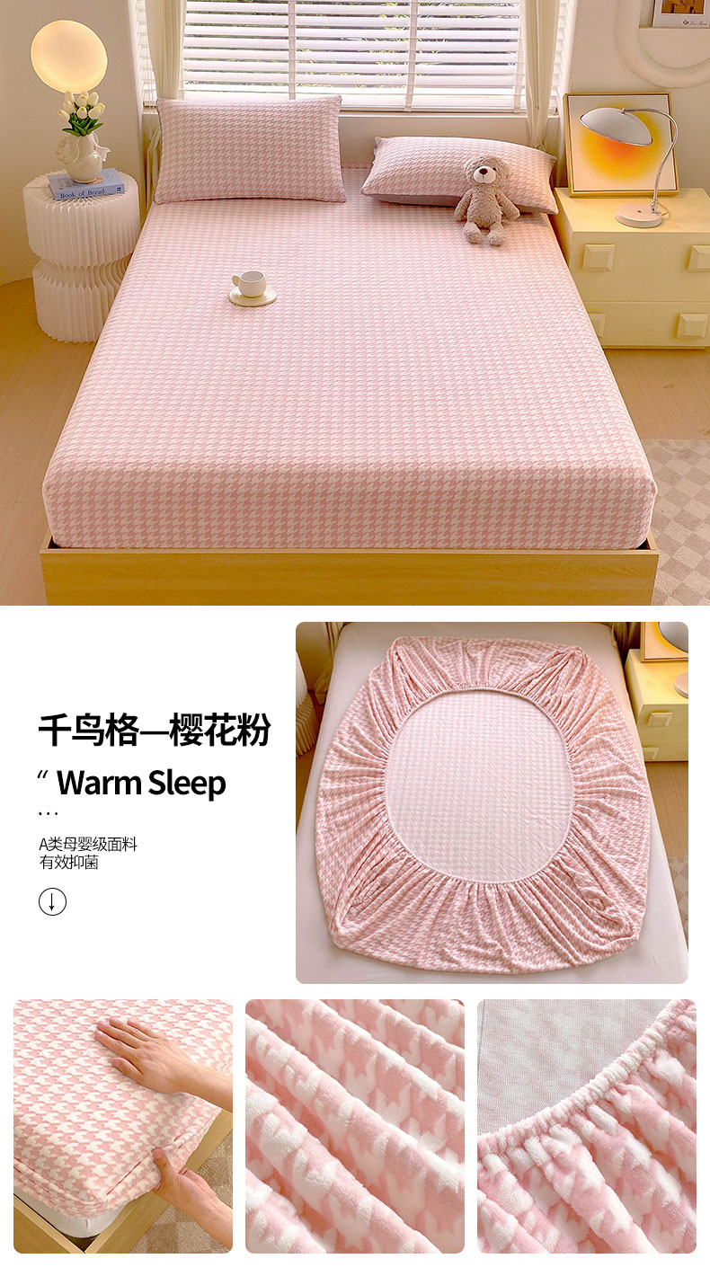 • 91家纺网 家纺一手货源 找家纺 莱米家纺 2024新款秋冬华夫格加密千鸟格牛奶绒床笠 千鸟格-樱花粉
