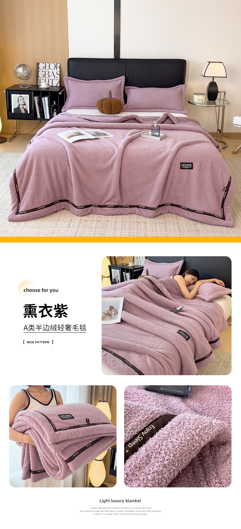 当前位置: 91家纺网 > 商品网购 > 毛毯休闲毯绒毯 > 毛毯 > 慕木家纺 2025新款纯色A类轻奢半边绒多功能毛毯直播爆款 熏衣紫
