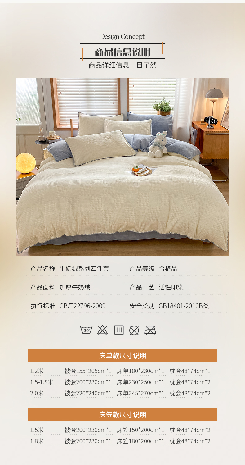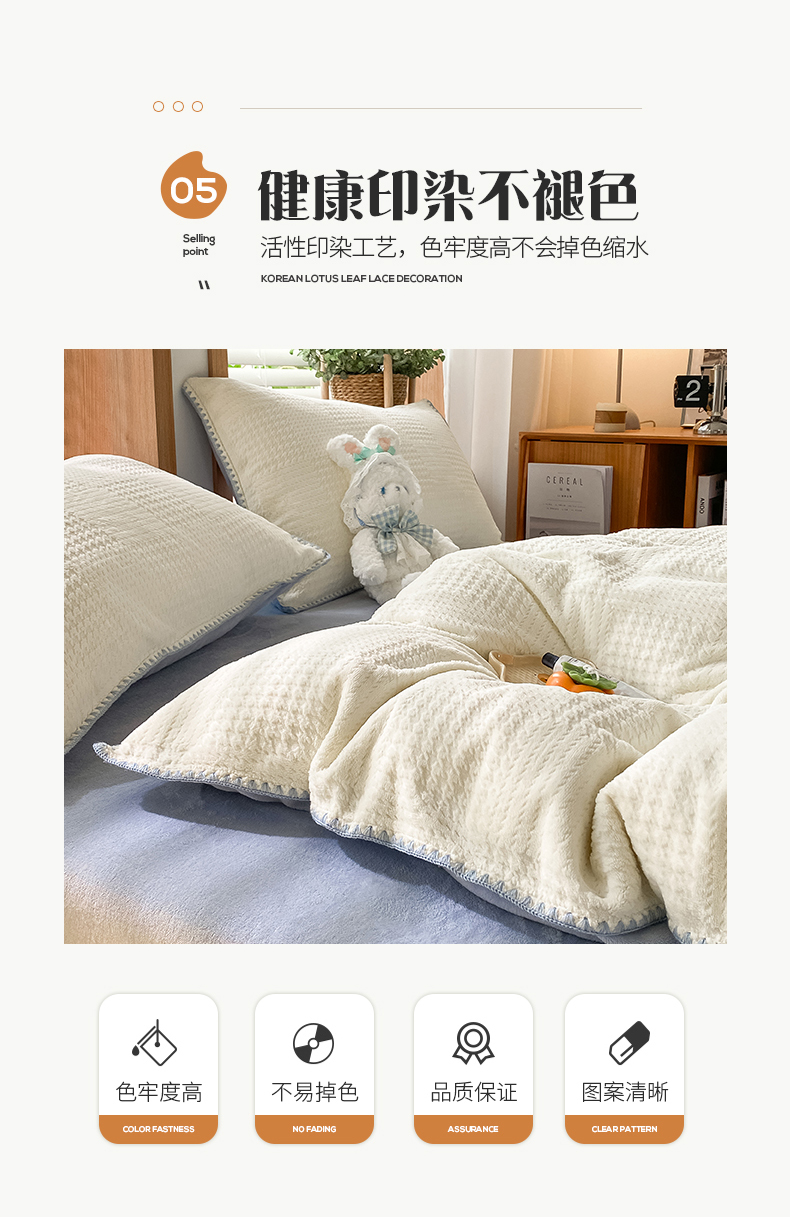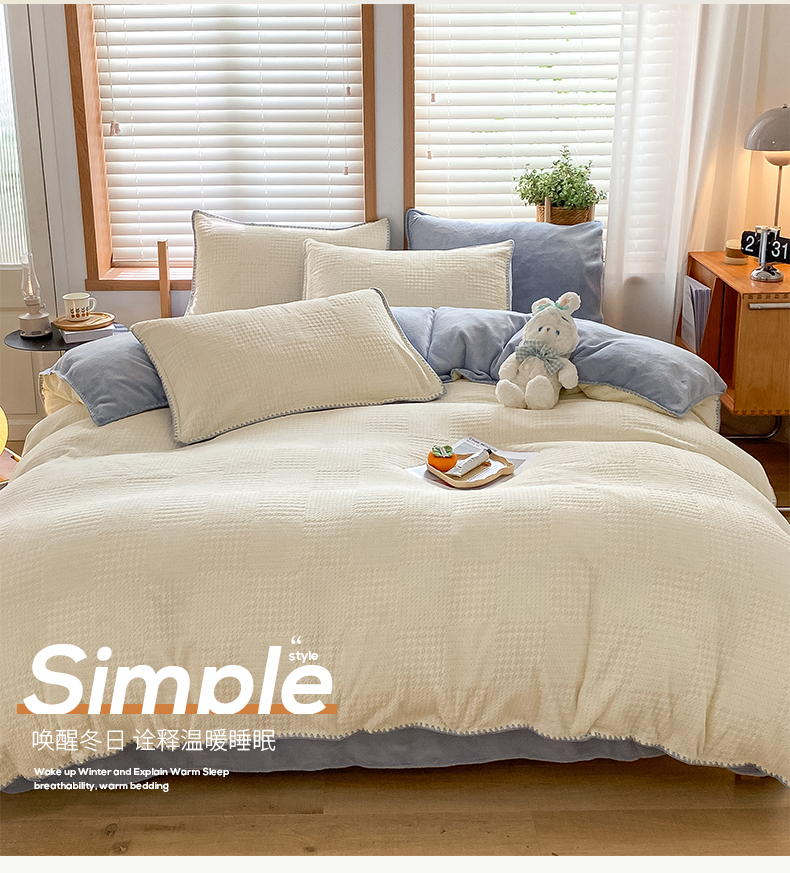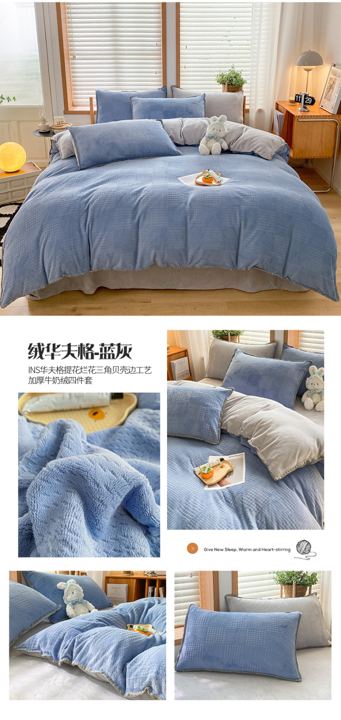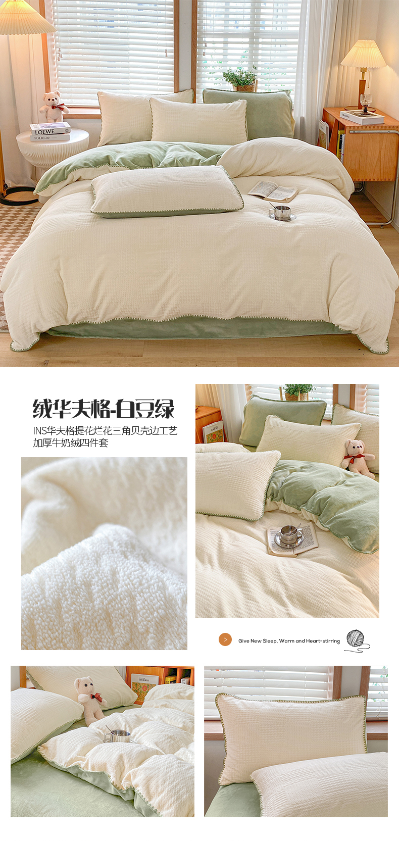 当前位置: 91家纺网 > 商品网购 > 床品套件 > 四件套 > 牛奶绒四件套 > 桃子家居 2024新款A类无印ins华夫格提花烂花雕花剪花三角贝壳边工艺加厚牛奶绒四件套单品 绒华夫格-白兰