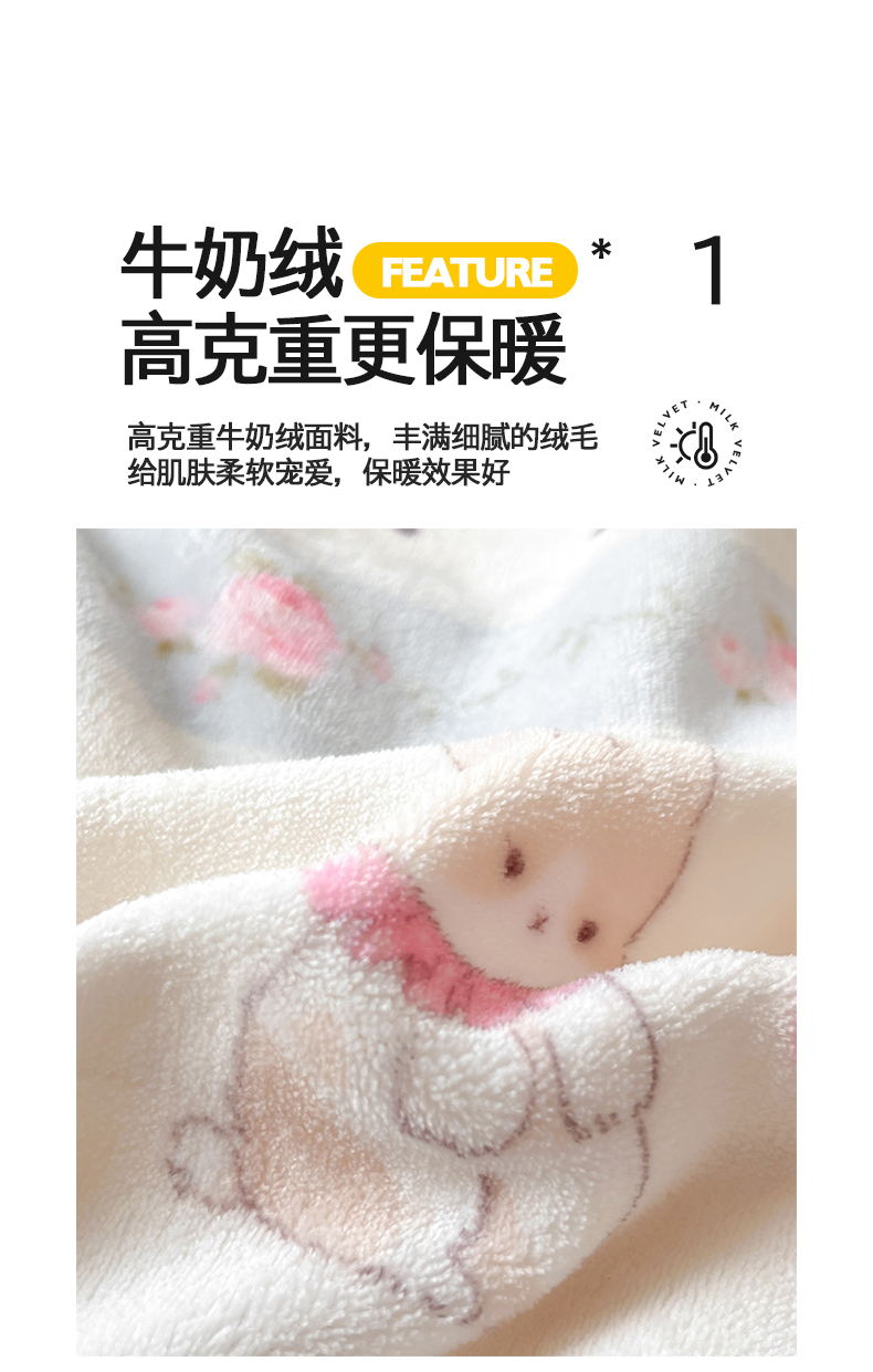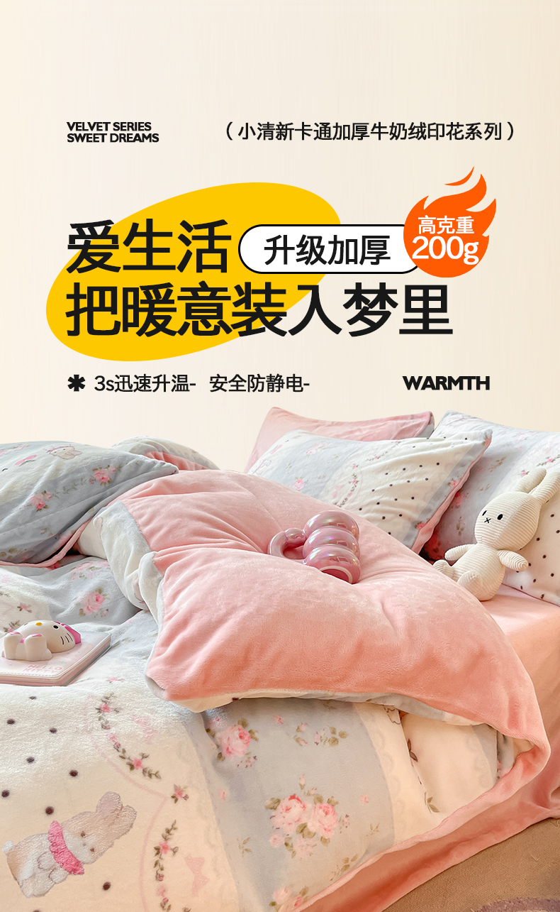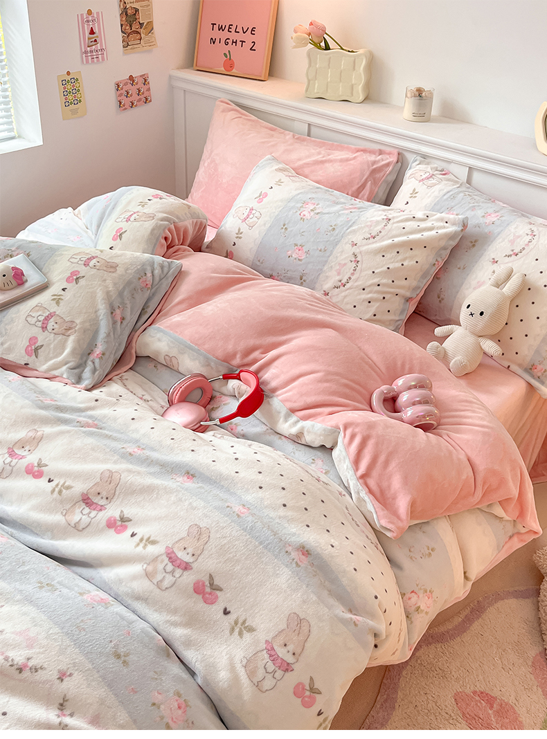 商品名称:桃子家居 2024新款小清新卡通加厚牛奶绒全工艺200克印花牛奶绒系列四件套 绒-乖乖兔