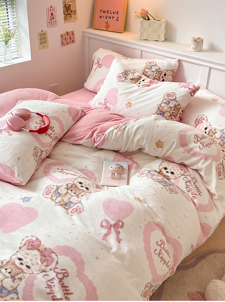桃子家居 2024新款小清新卡通加厚牛奶绒全工艺200克印花牛奶绒系列四件套 绒-木偶熊