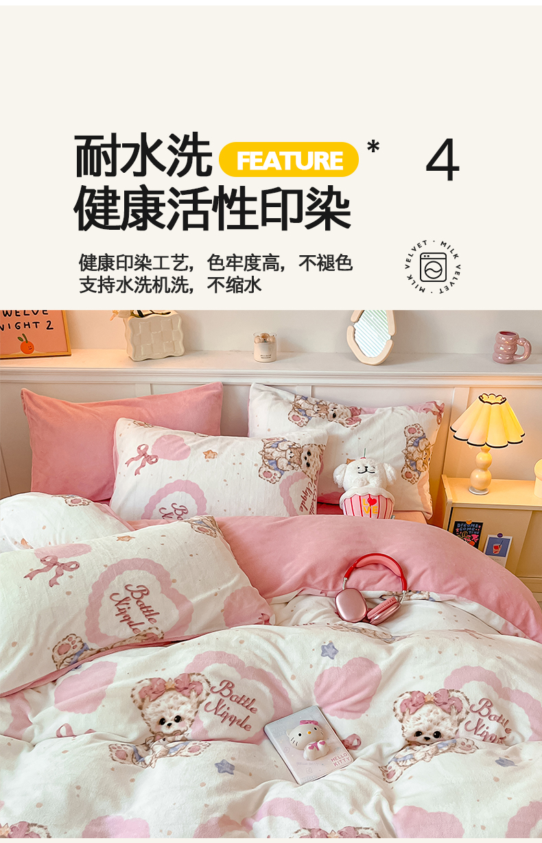 商品名称:桃子家居 2024新款小清新卡通加厚牛奶绒全工艺200克印花牛奶绒系列四件套 绒-木偶熊