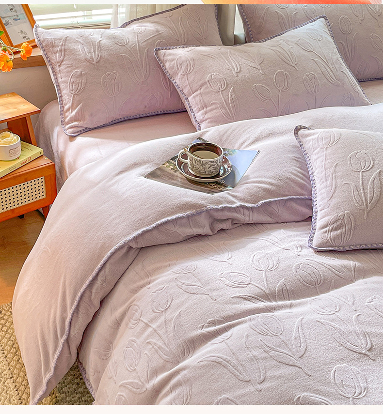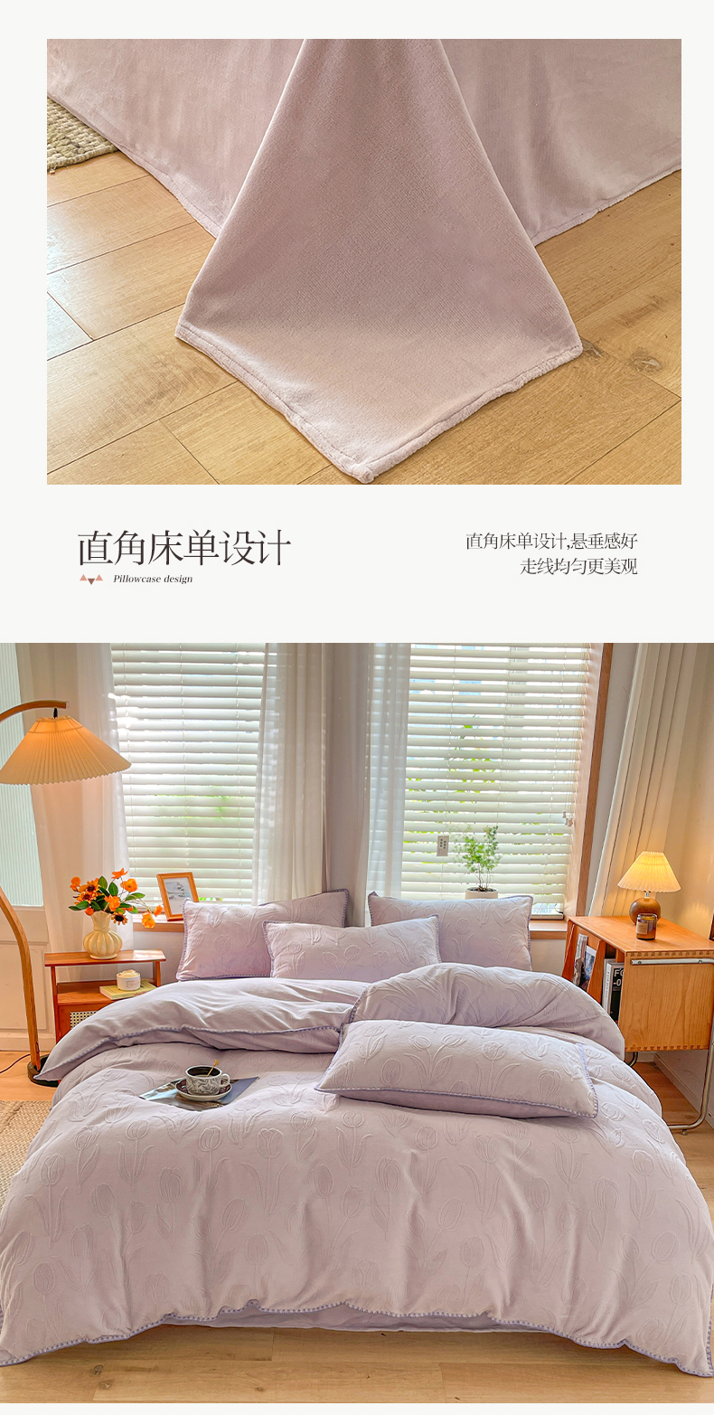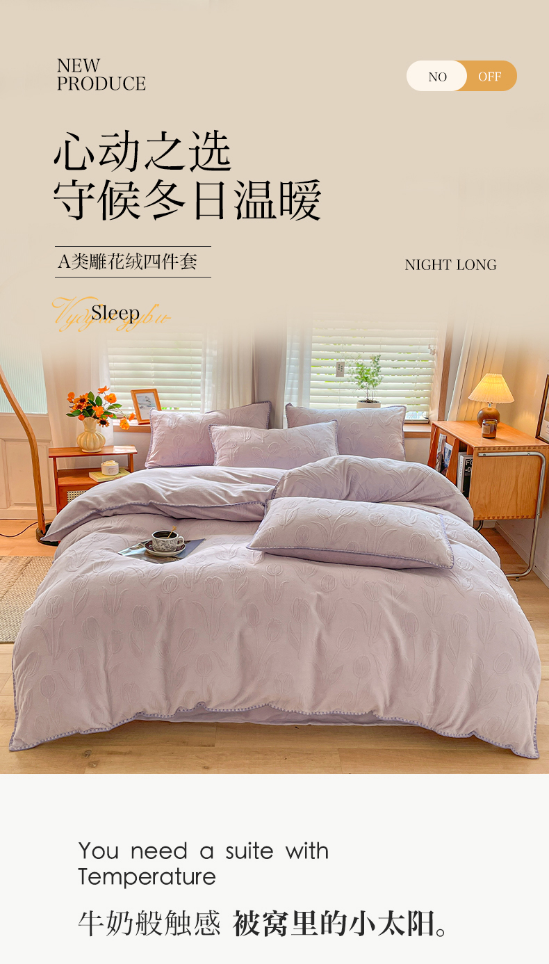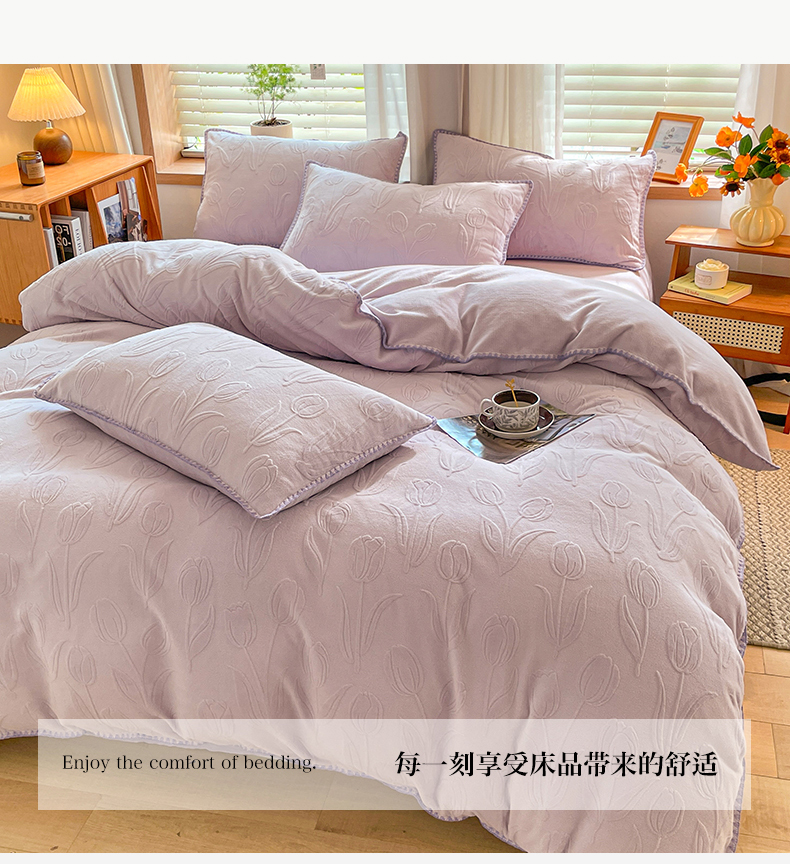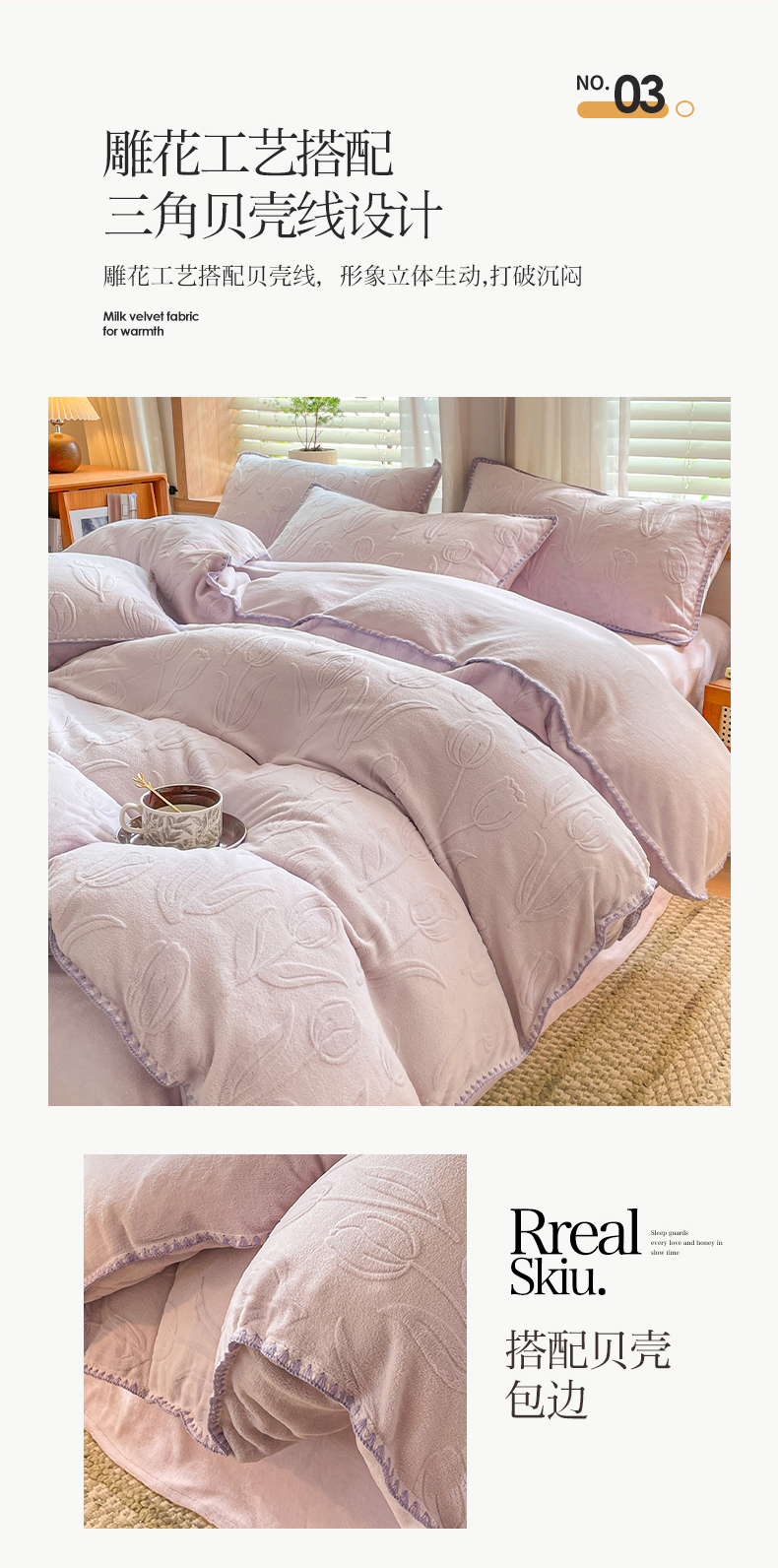 商品名称:2025新款A类烂花雕花高克重加厚牛奶绒四件套三角贝壳边(有买家秀提供)向阳而生-帛紫