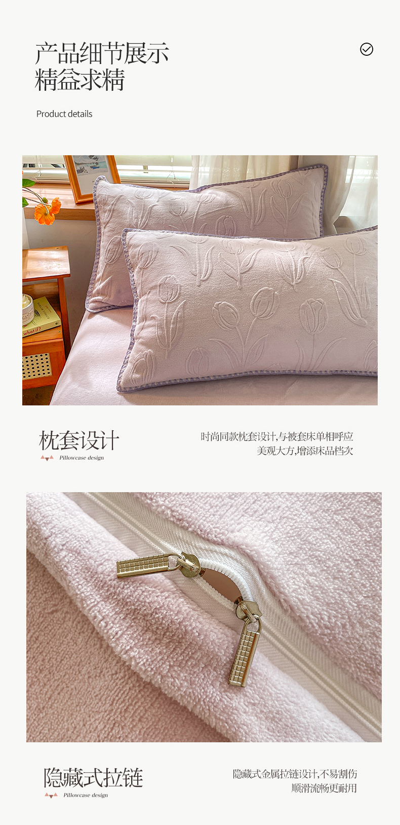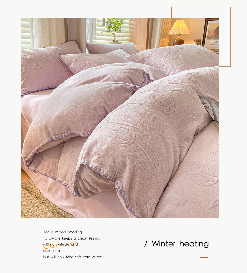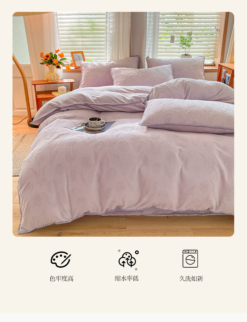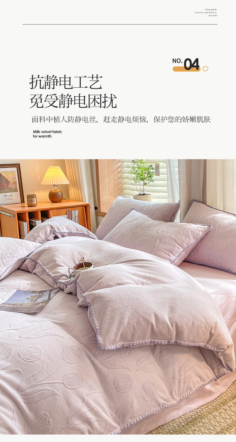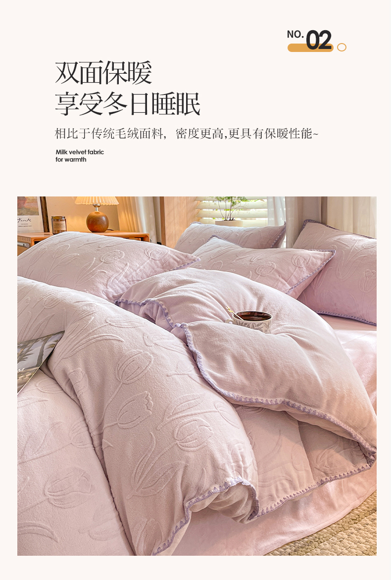 商品名称:2025新款A类烂花雕花高克重加厚牛奶绒四件套三角贝壳边(有买家秀提供)向阳而生-帛紫