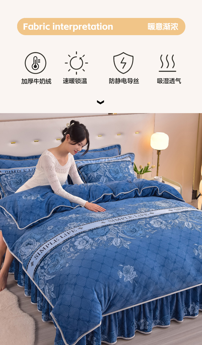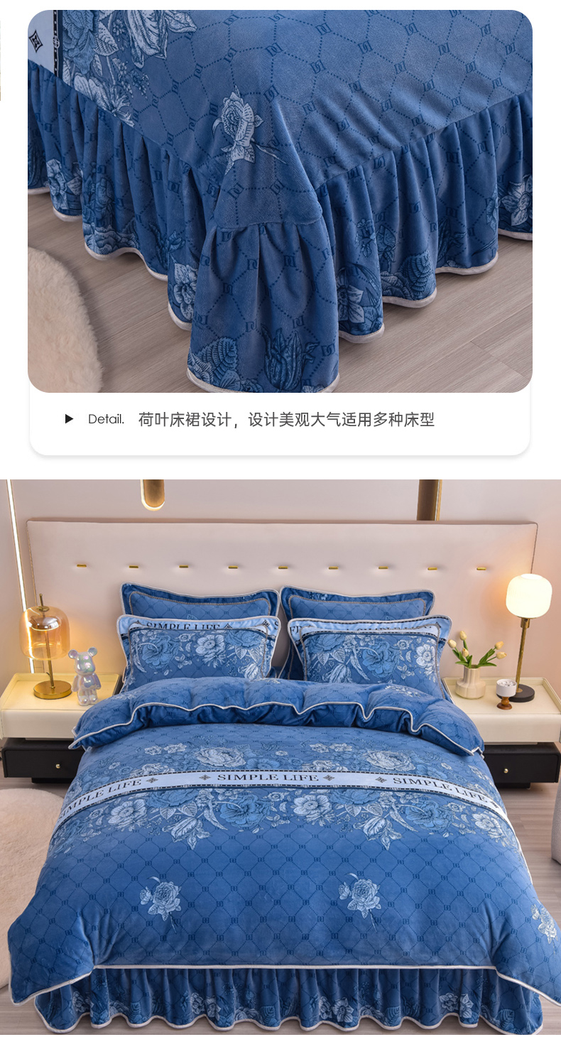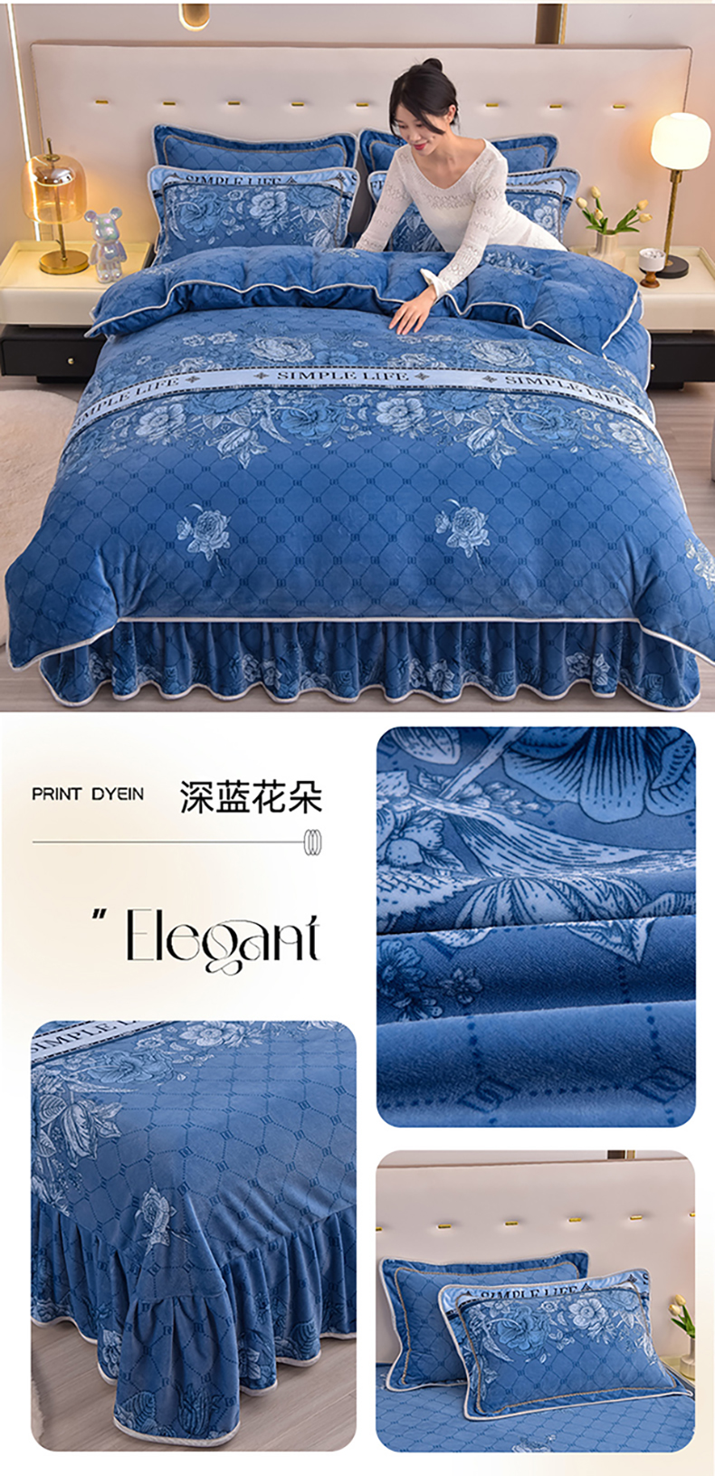 商品名称:晚静家纺 2024新款8.5斤牛奶绒金貂法莱绒床裙款保暖绒四件套 深蓝花朵