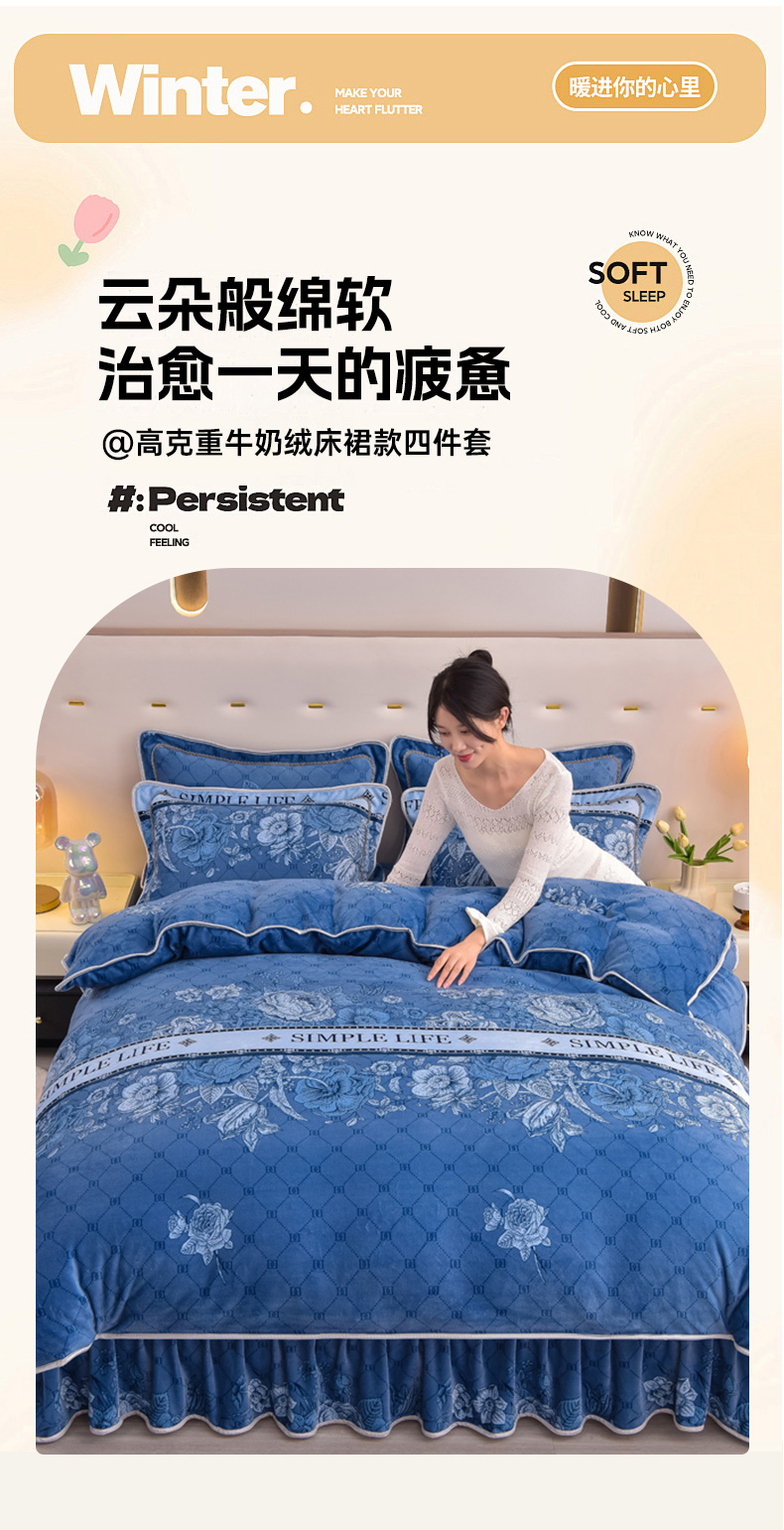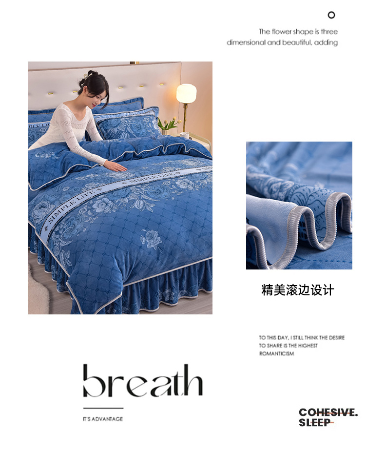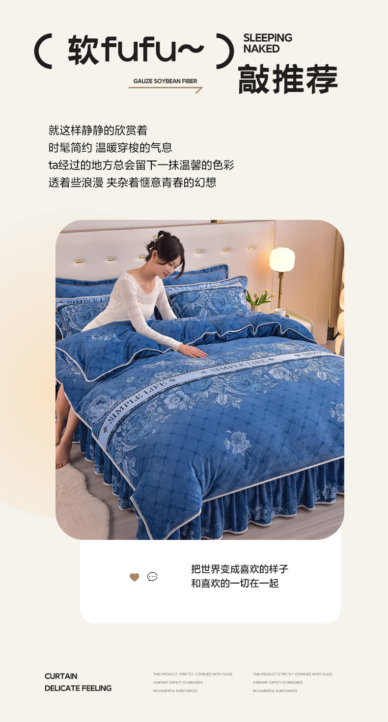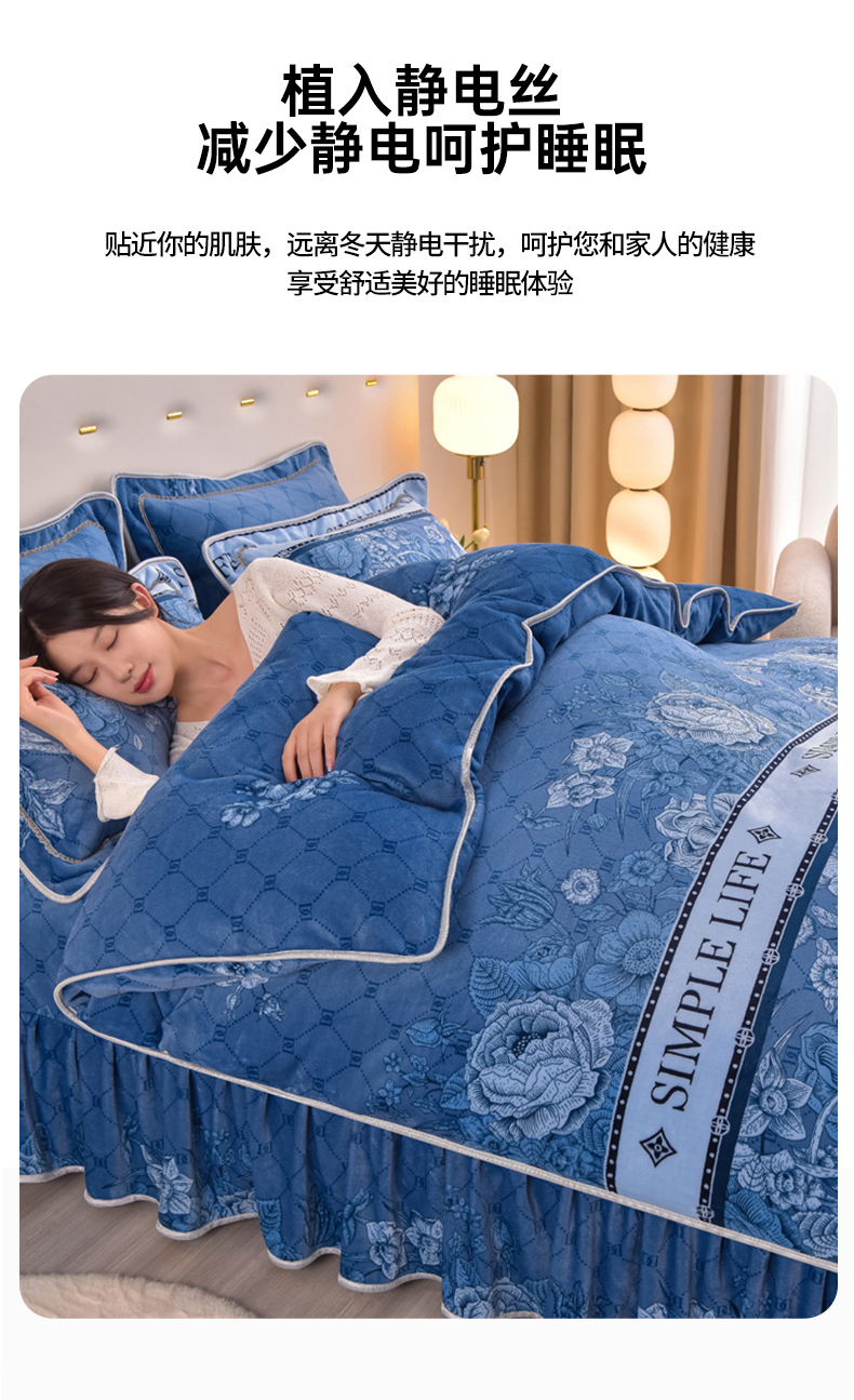 商品名称:晚静家纺 2024新款8.5斤牛奶绒金貂法莱绒床裙款保暖绒四件套 深蓝花朵