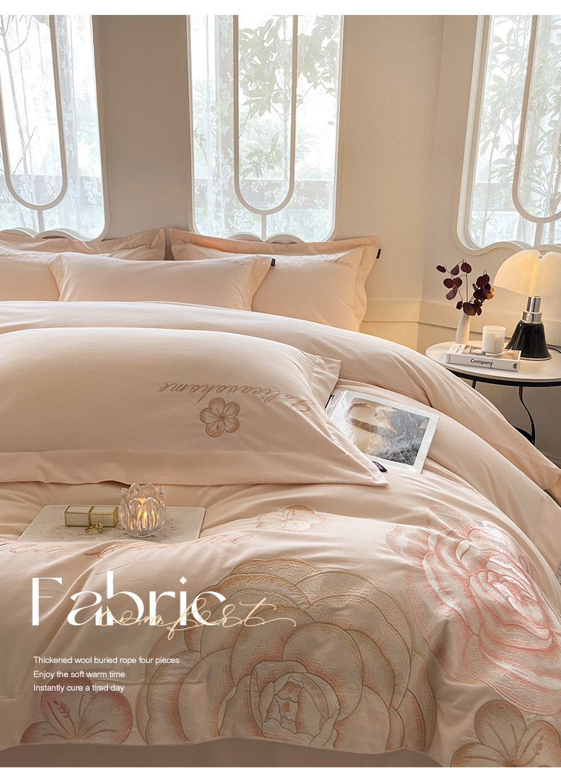 【秋冬爆款】A类母婴级全棉磨毛四件套纯棉重工刺绣花轻奢风床单床笠款新疆棉高奢床上用品 缇菲-白桃