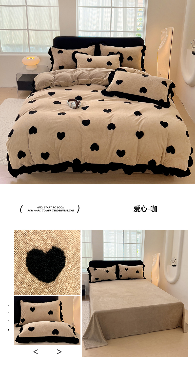 商品名称:米莱家纺 2024新款高克重剪花雕花阳离子牛奶绒四件套 爱心-咖