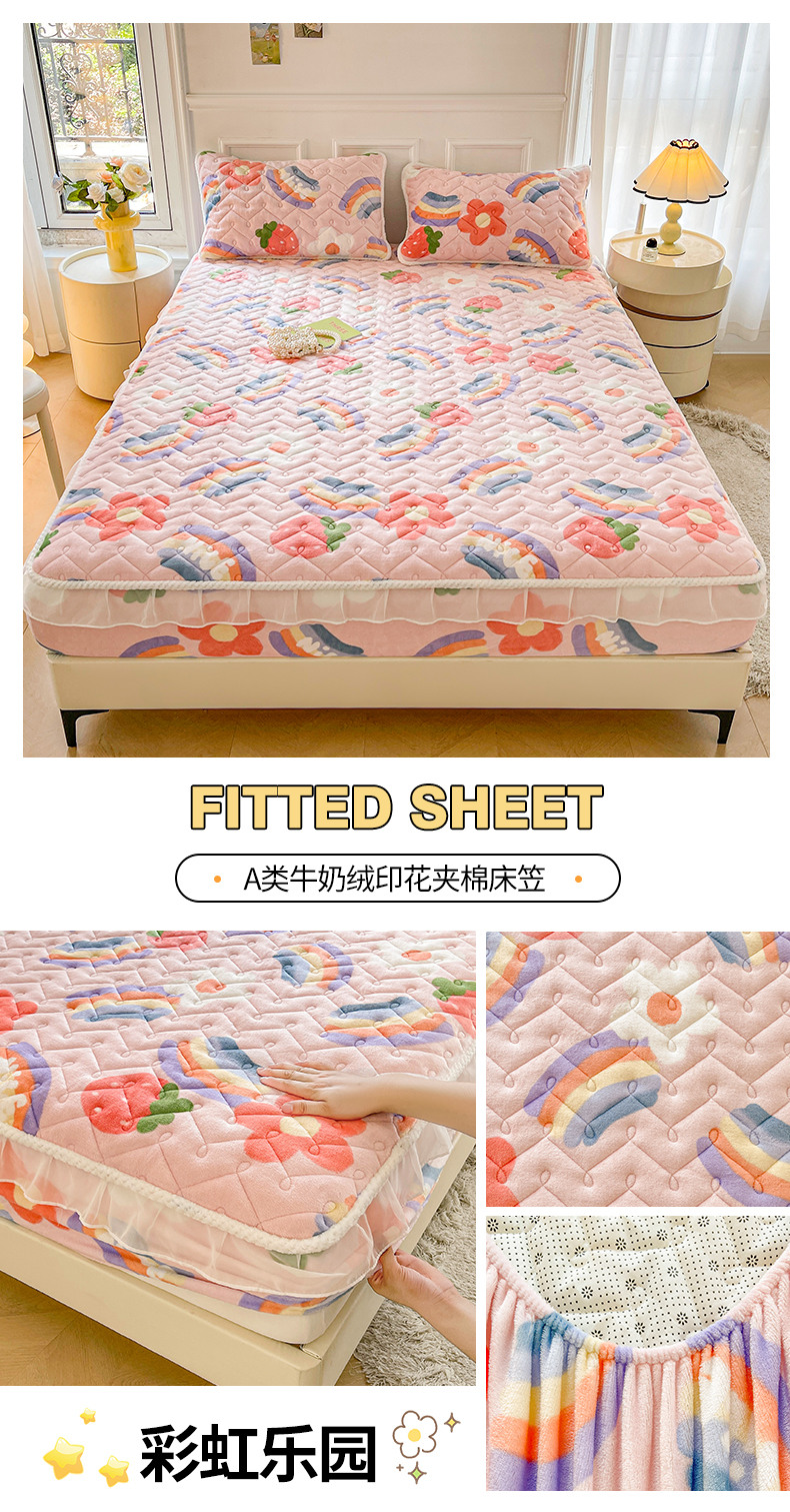 商品名称:小萌虎 2024新款牛奶绒夹棉花边床笠 彩虹乐园