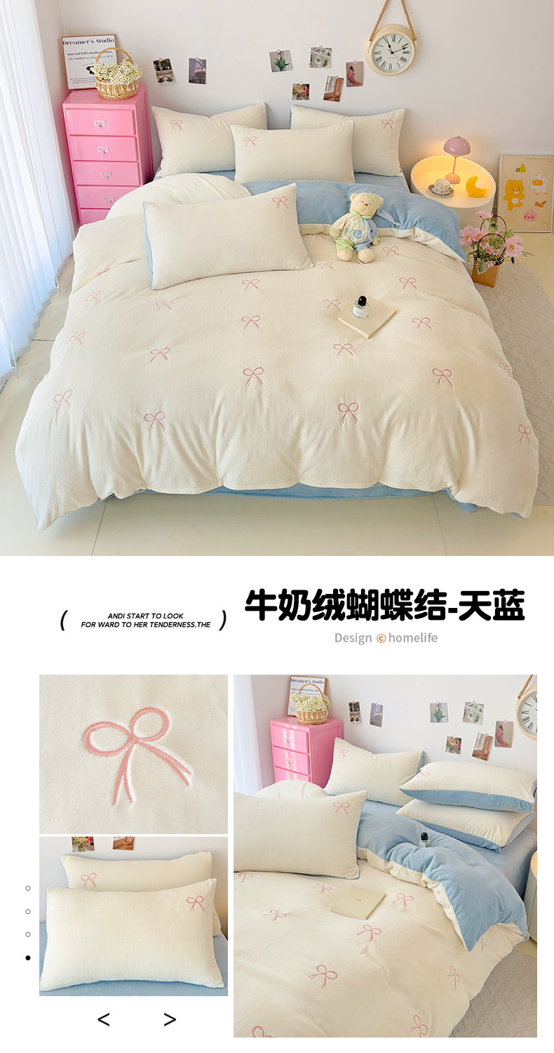 商品名称:海岛哥哥 2024新款小清新刺绣牛奶绒四件套 牛奶绒蝴蝶结-天蓝
