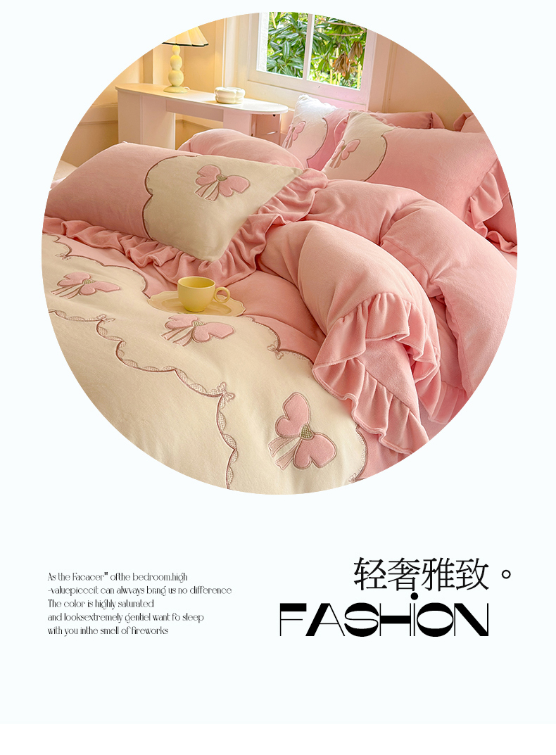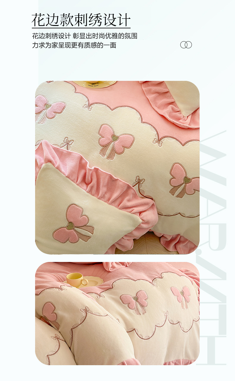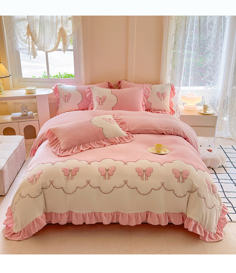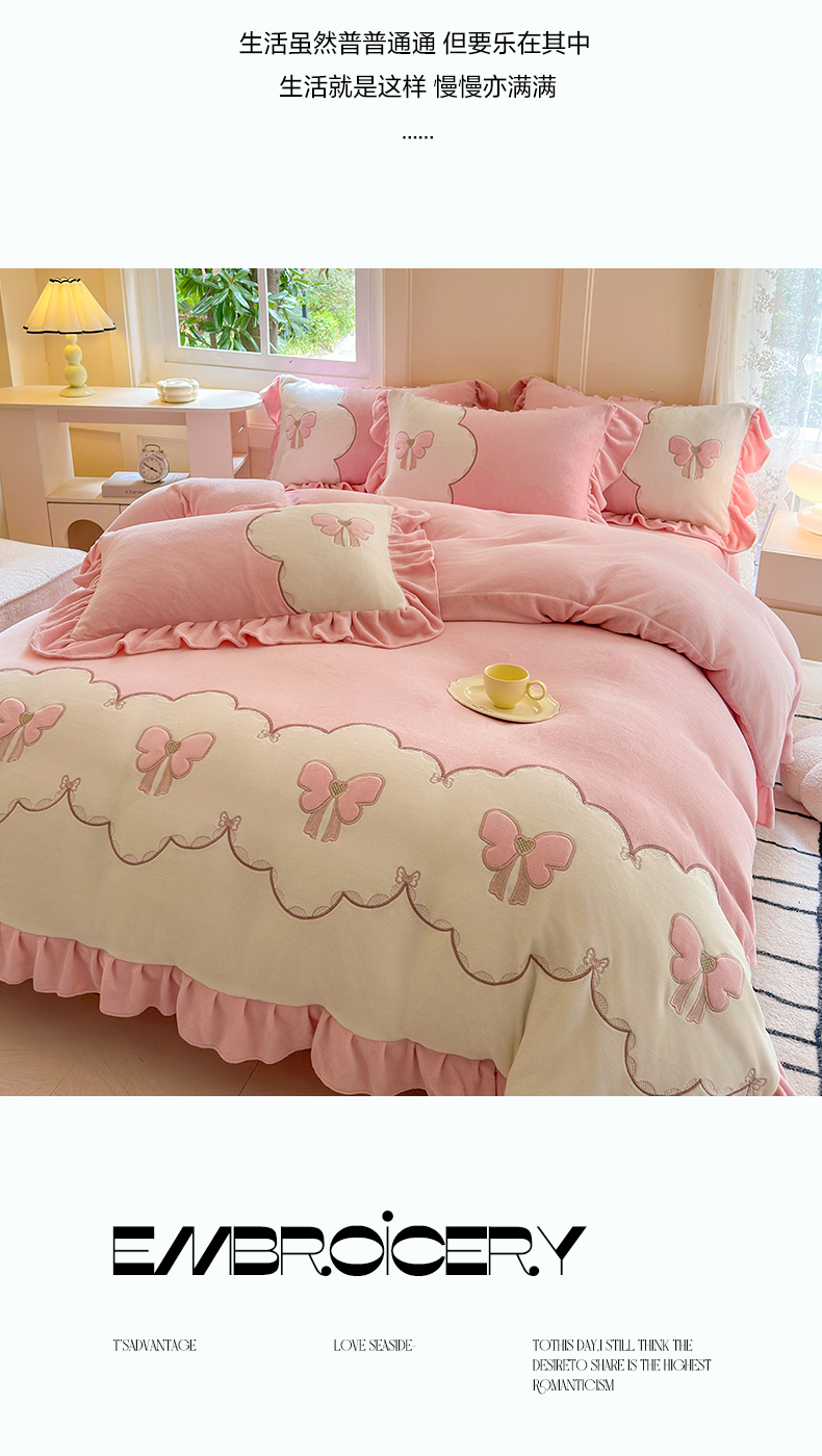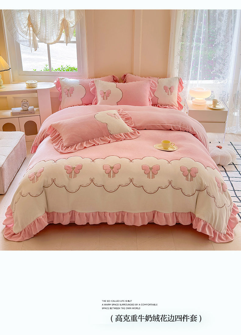 当前位置: 91家纺网 > 商品网购 > 床品套件 > 四件套 > 牛奶绒四件套 > 豪美鑫 2025新款牛奶绒刺绣韩版花边四件套-蝴蝶仙子 蝴蝶仙子-淡粉