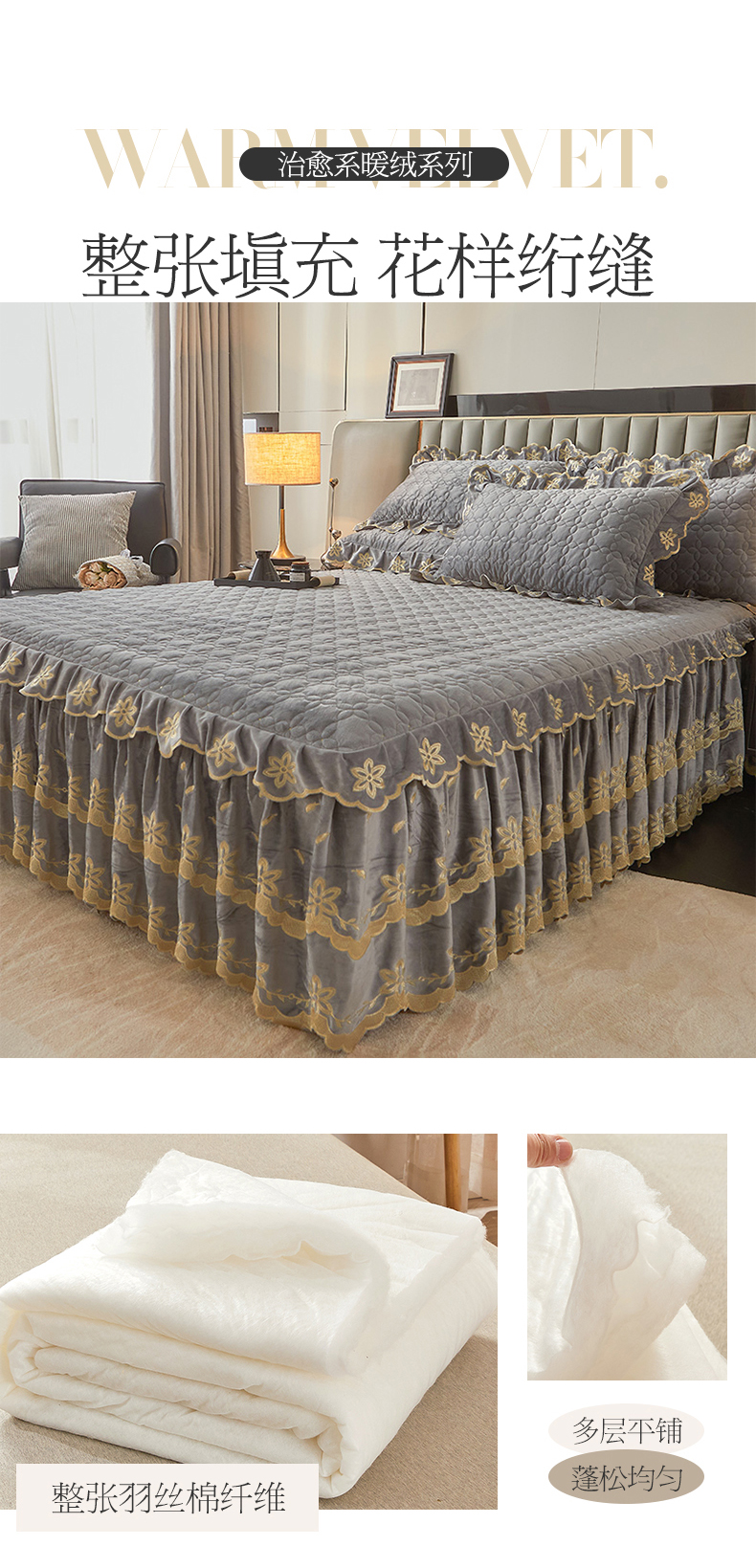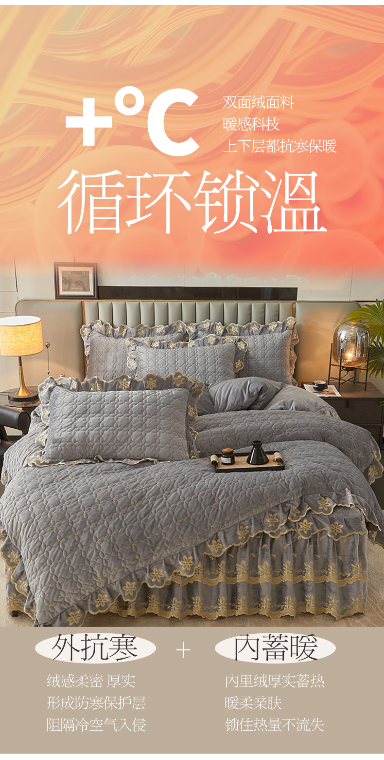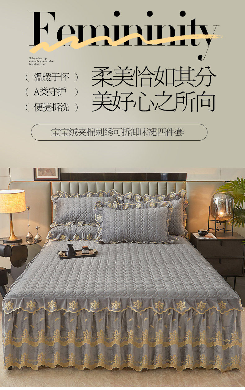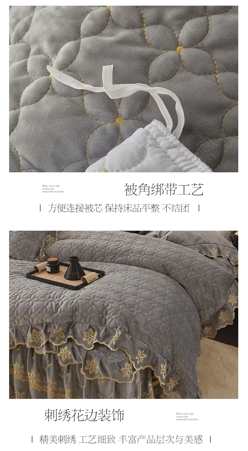 当前位置: 91家纺网 > 商品网购 > 床品套件 > 四件套 > 牛奶绒四件套 > 锦格 2024新款浪漫宝宝绒夹棉可拆洗床裙四件套 盛世芳华 梦灰