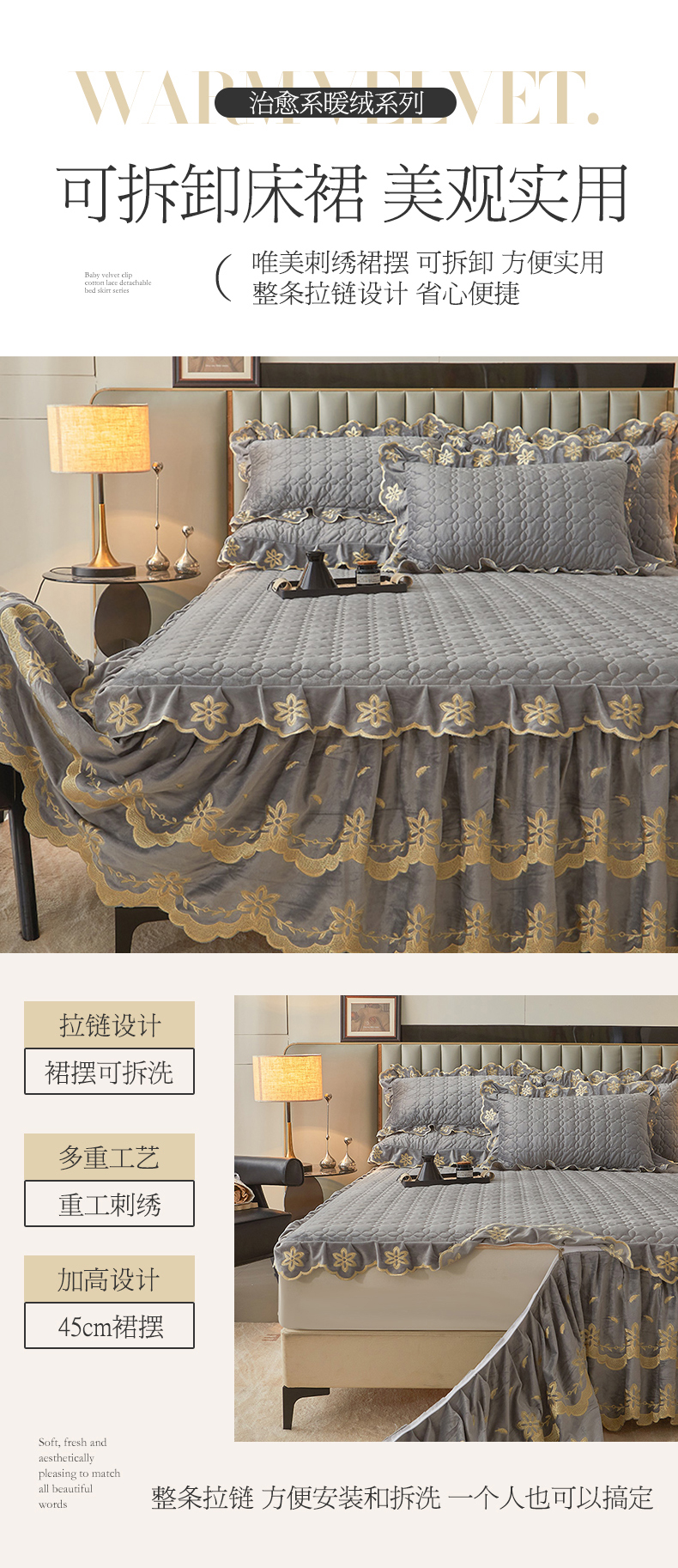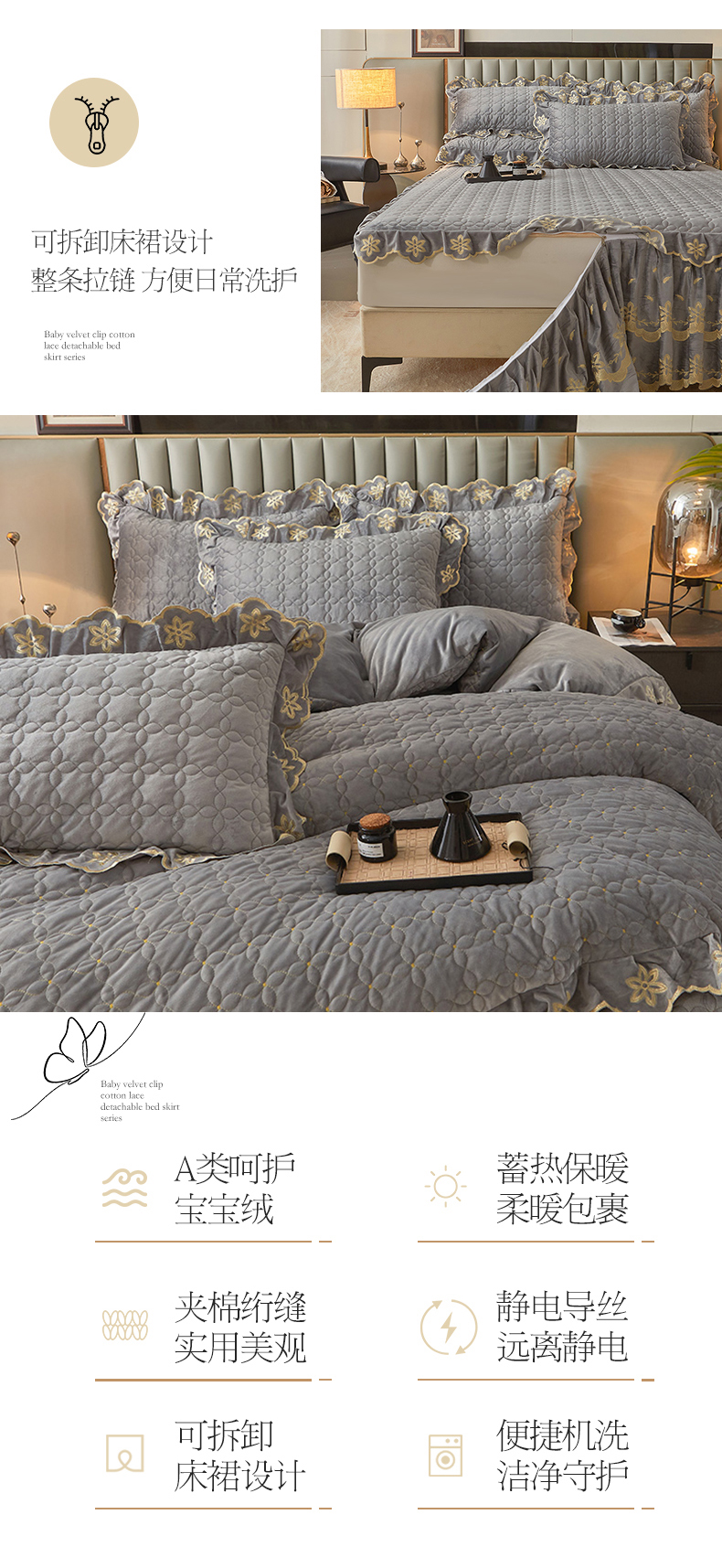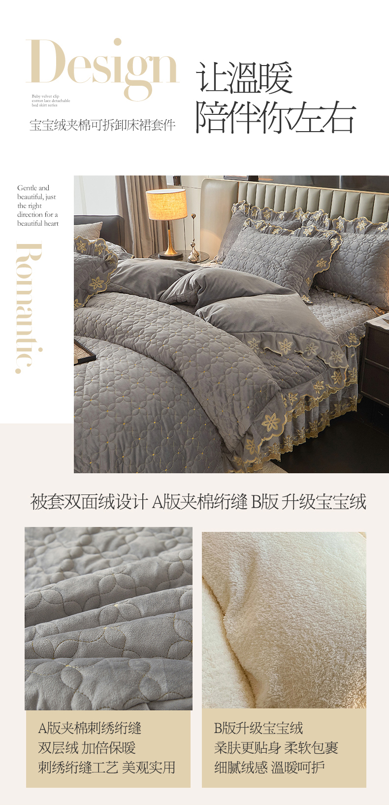 当前位置: 91家纺网 > 商品网购 > 床品套件 > 四件套 > 牛奶绒四件套 > 锦格 2024新款浪漫宝宝绒夹棉可拆洗床裙四件套 盛世芳华 梦灰