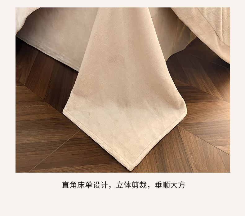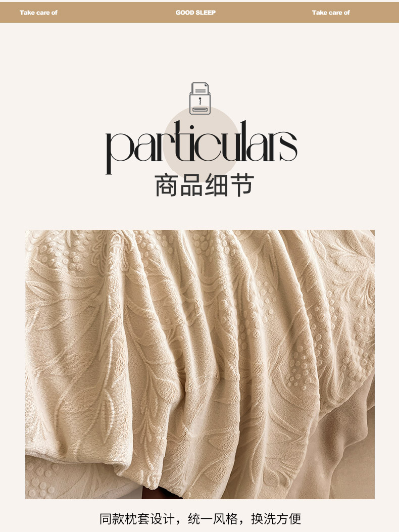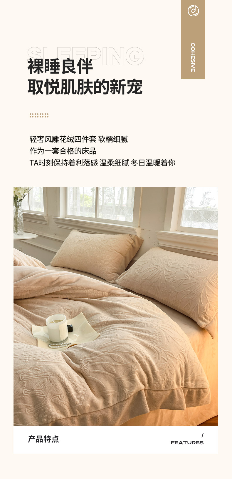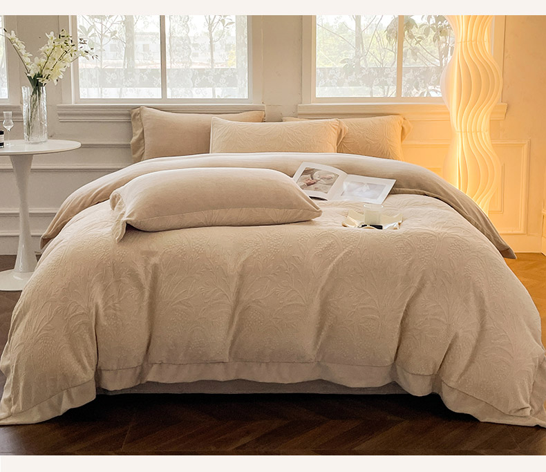 商品名称:2024新款A类雕花绒牛奶绒四件套宝宝绒婴儿绒床单被套保暖套件新品-米鹿提 淡雅米