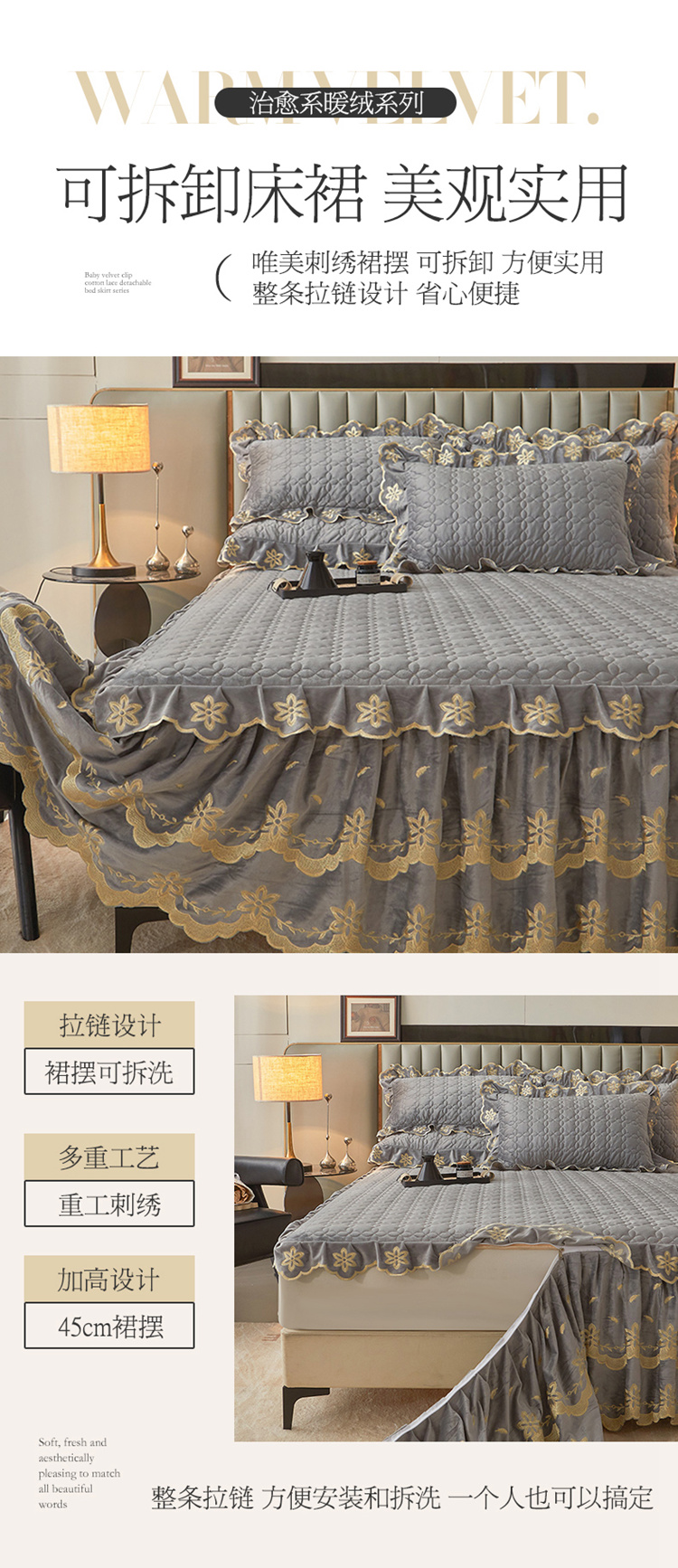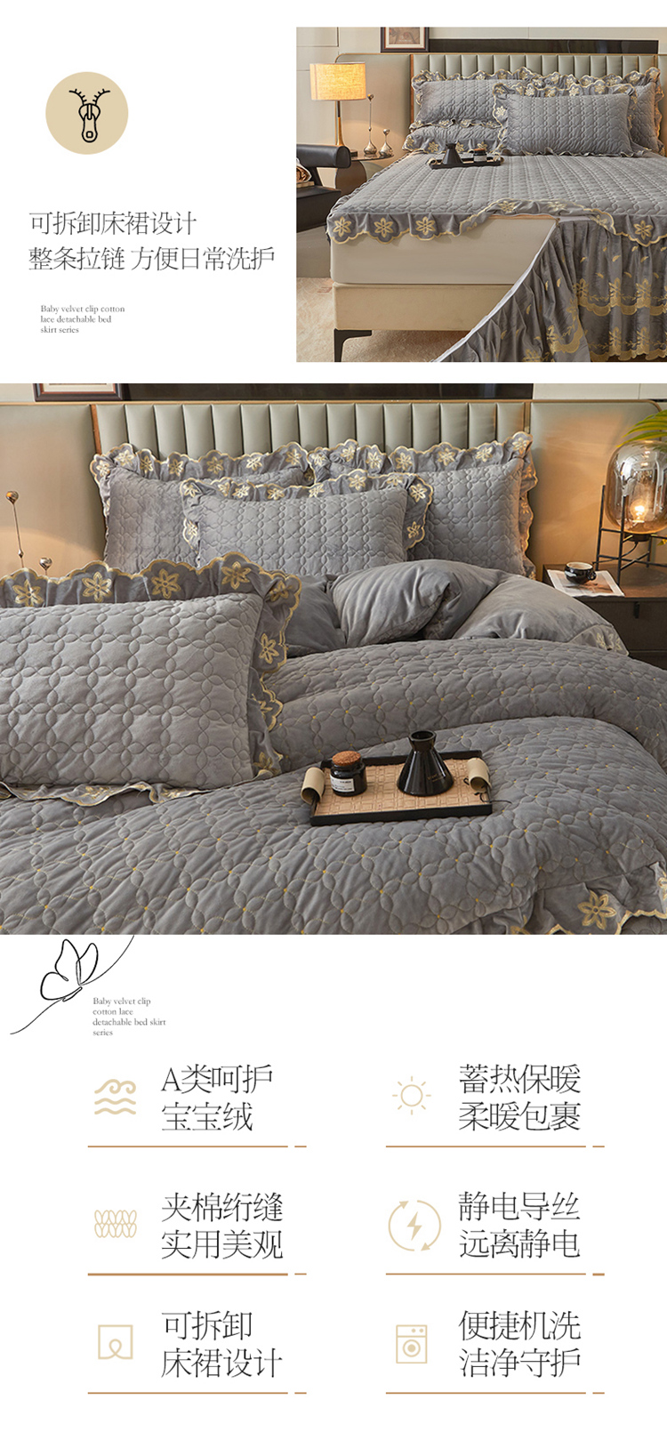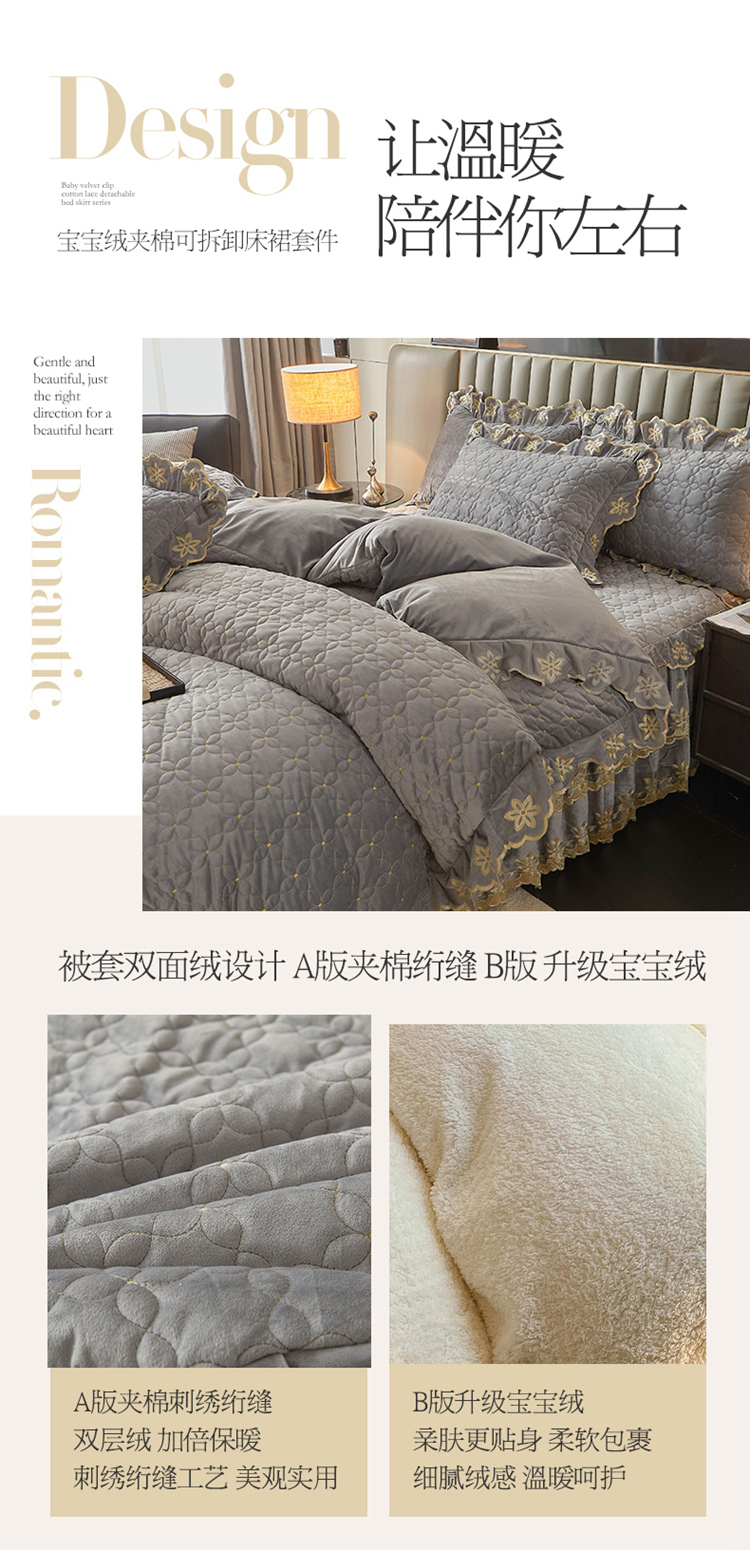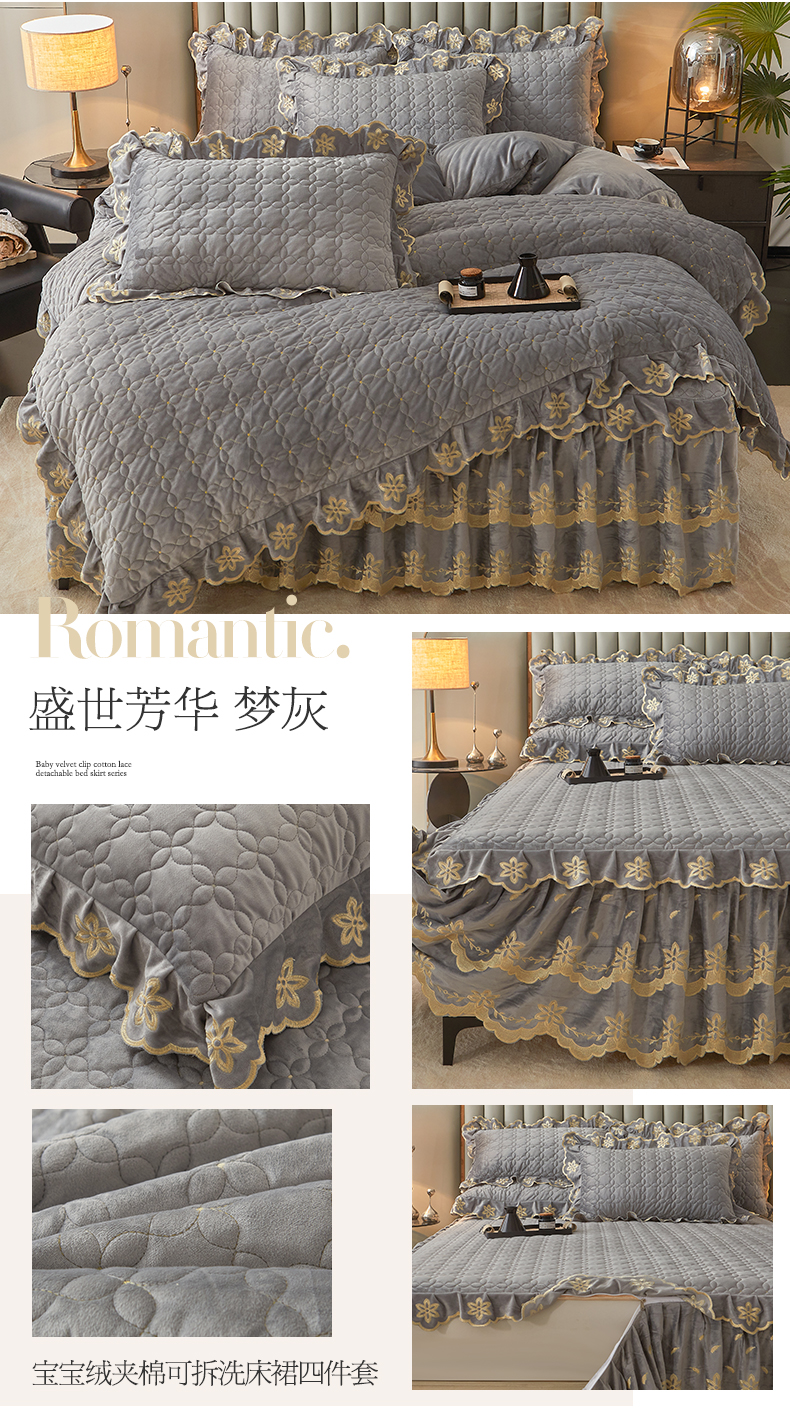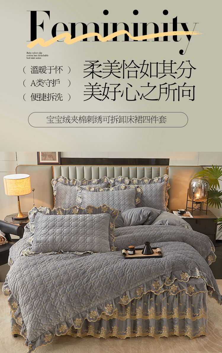 当前位置: 91家纺网 > 商品网购 > 床品套件 > 四件套 > 其它四件套 > 虹星家纺 2024新款可拆卸宝宝绒夹棉床裙三四件套-盛世芳华 盛世芳华 梦灰