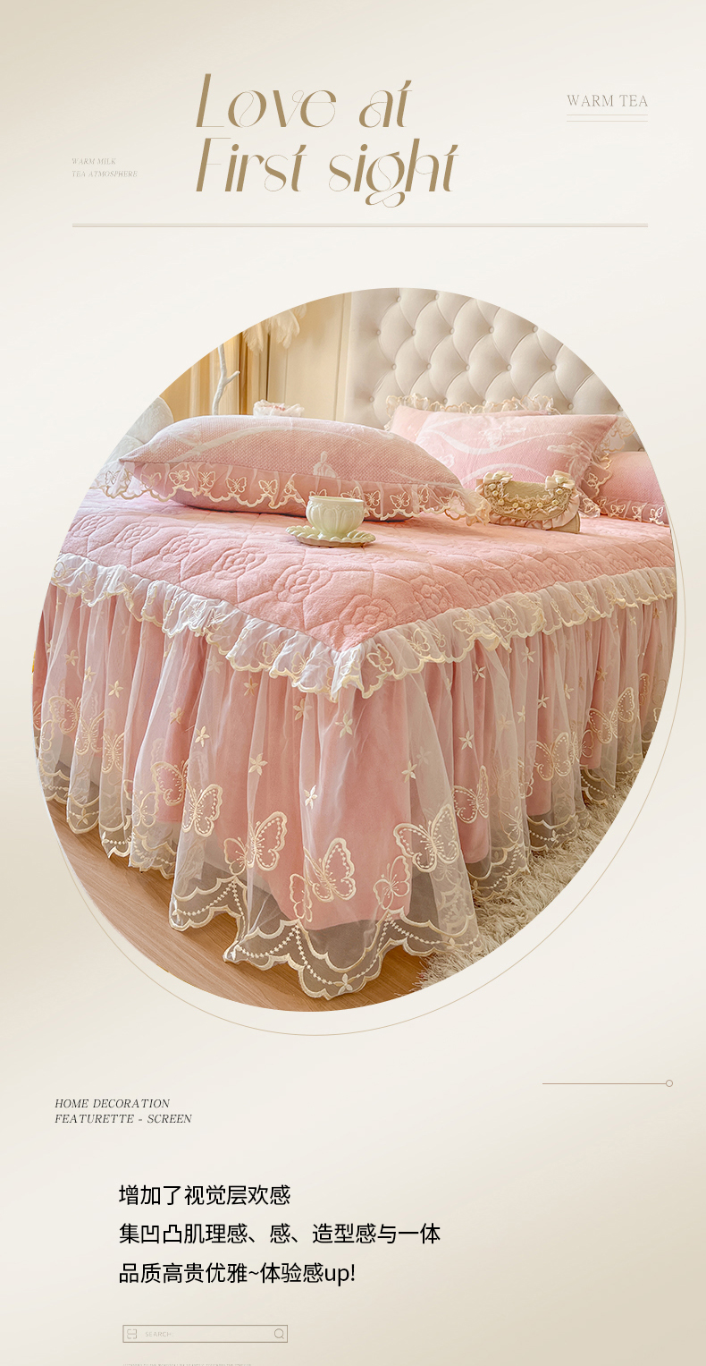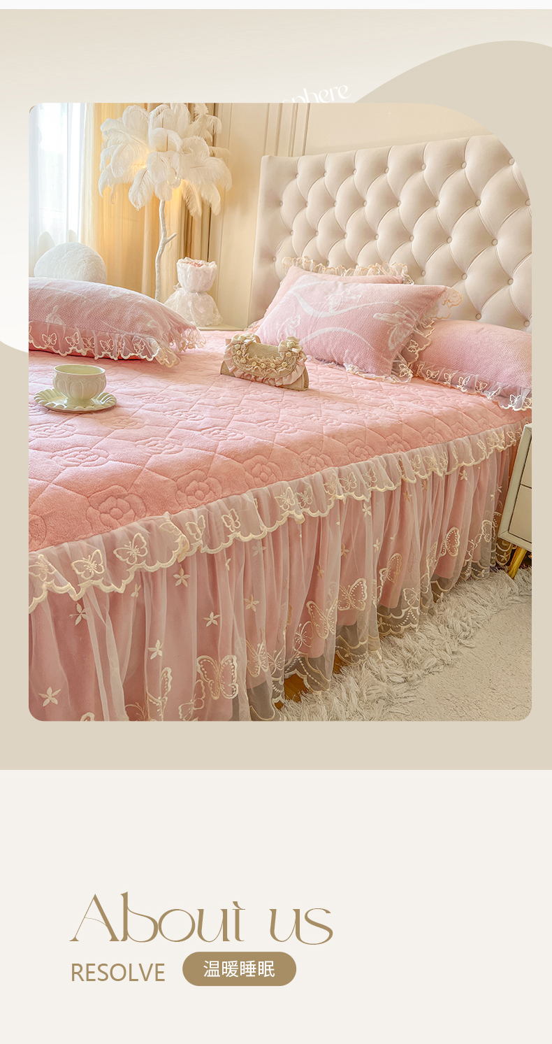 • 91家纺网 家纺一手货源 找家纺 麒豆豆 2024新款雕花绒床裙三件套-蝴蝶梦境 樱粉