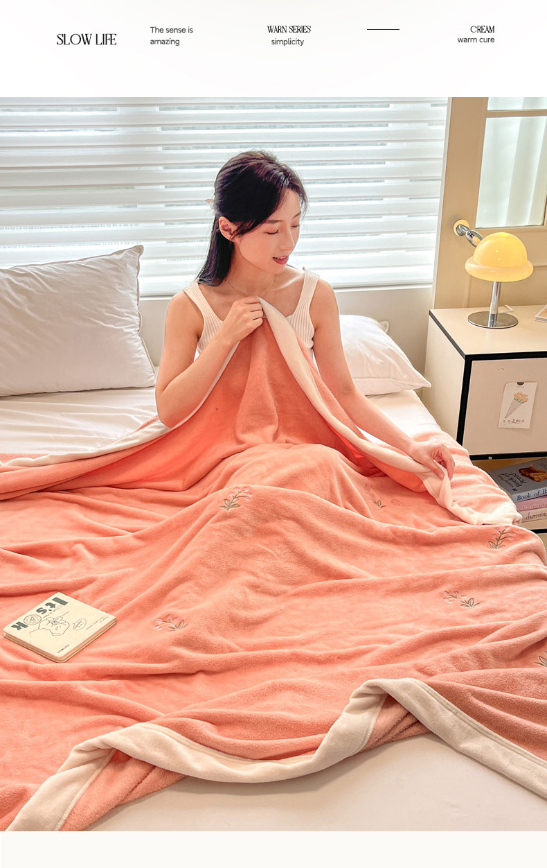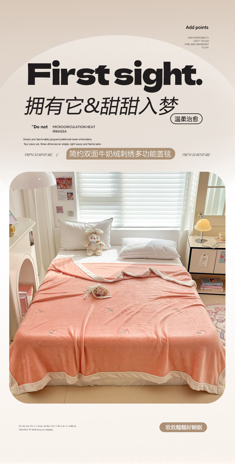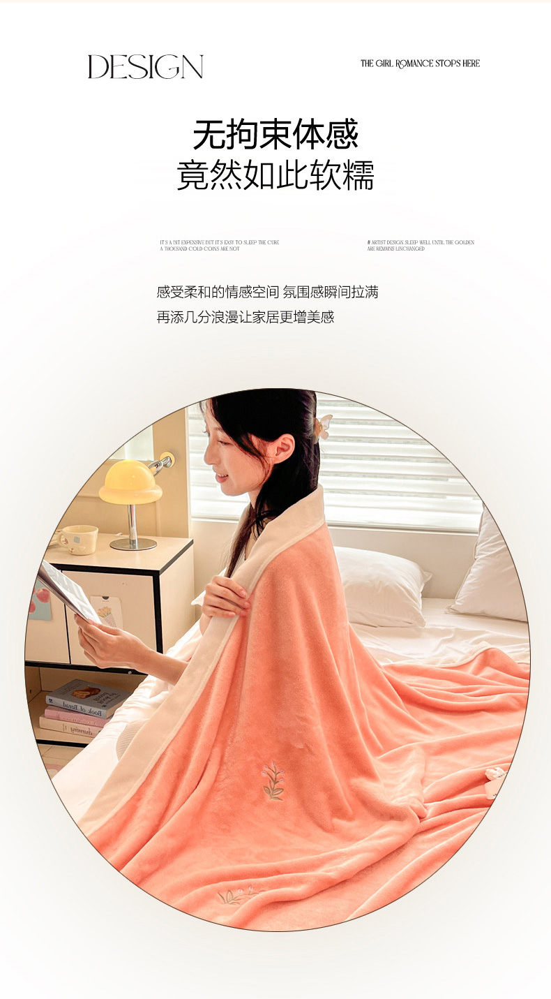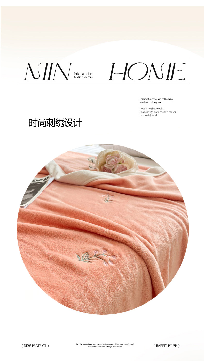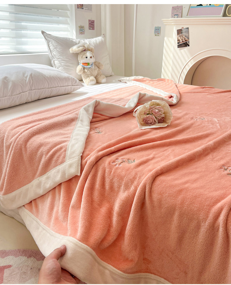 商品名称:慕尚 2025新款简约双面牛奶绒刺绣多功能盖毯-郁金香 可爱花-橘