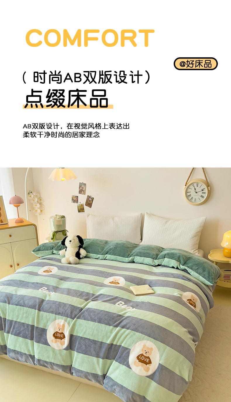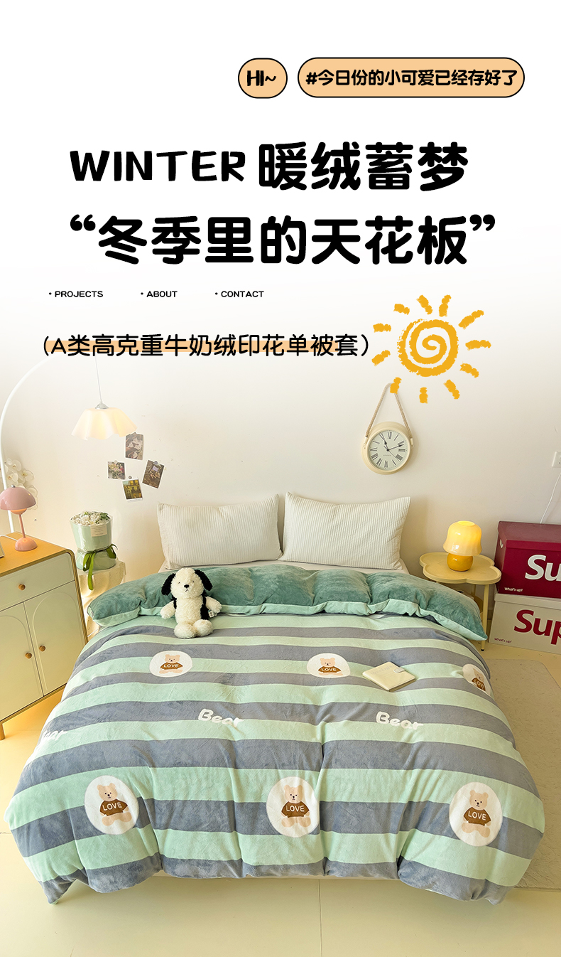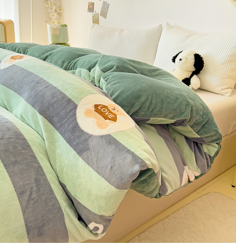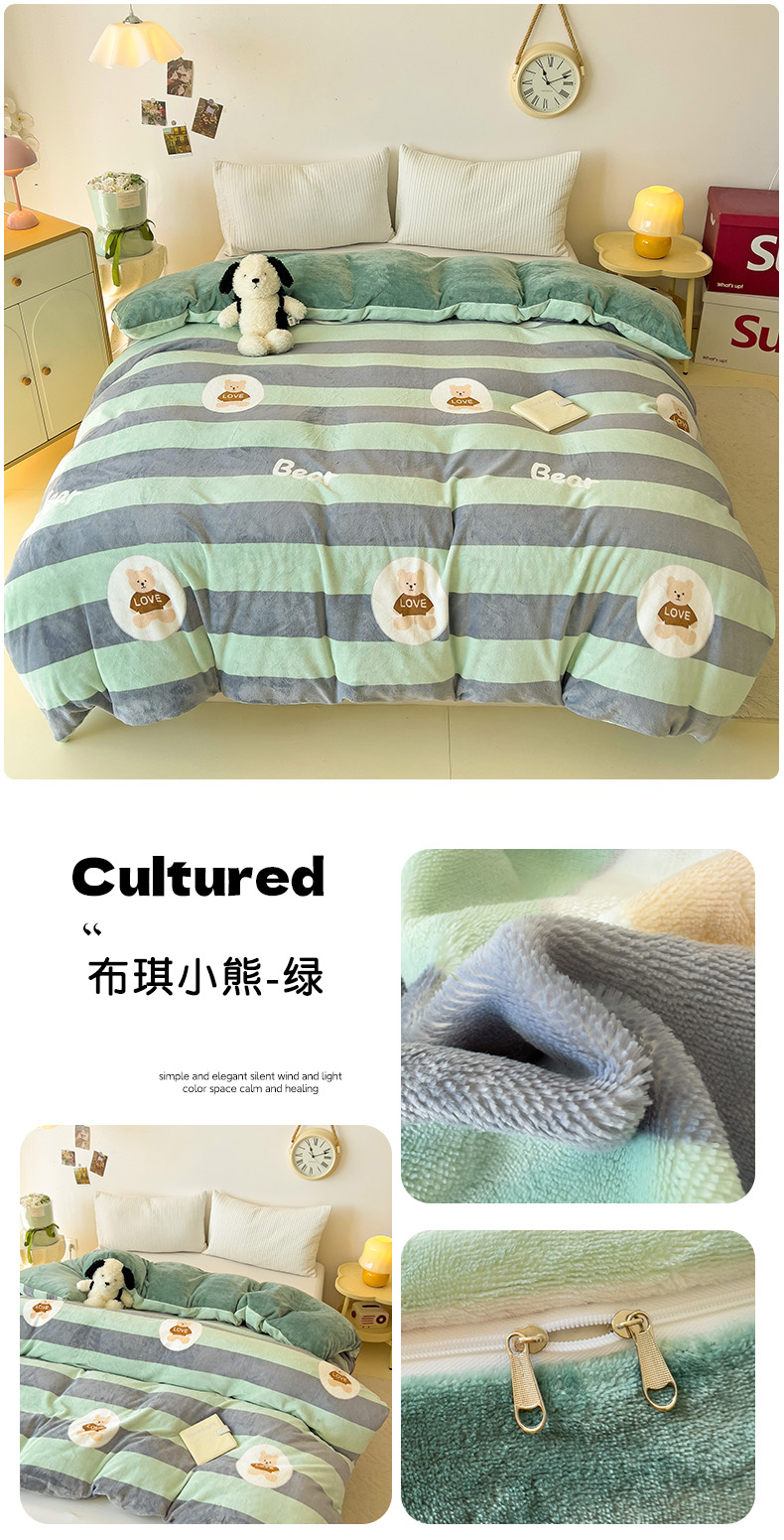 • 91家纺网 家纺一手货源 找家纺 大柏树 2025新款A类高克重亲肤舒适牛奶绒印花四件套-单被套可定制 布琪小熊-绿