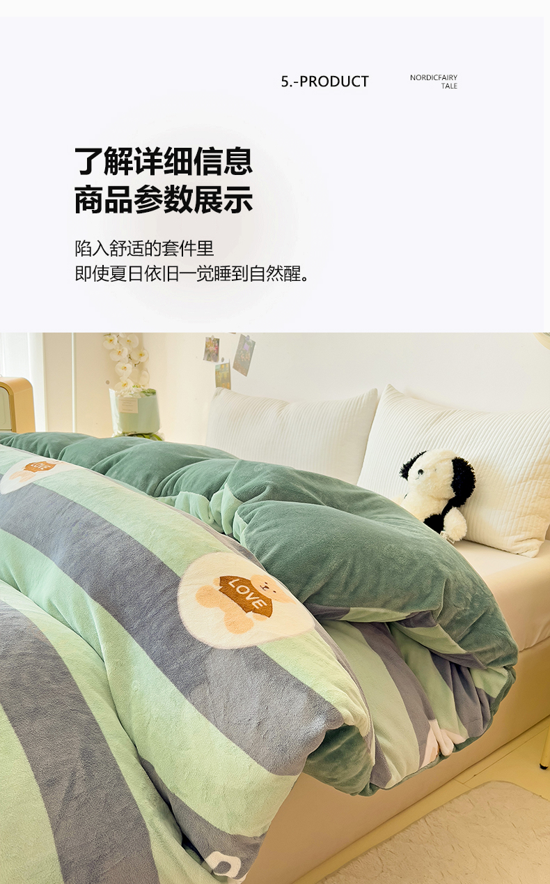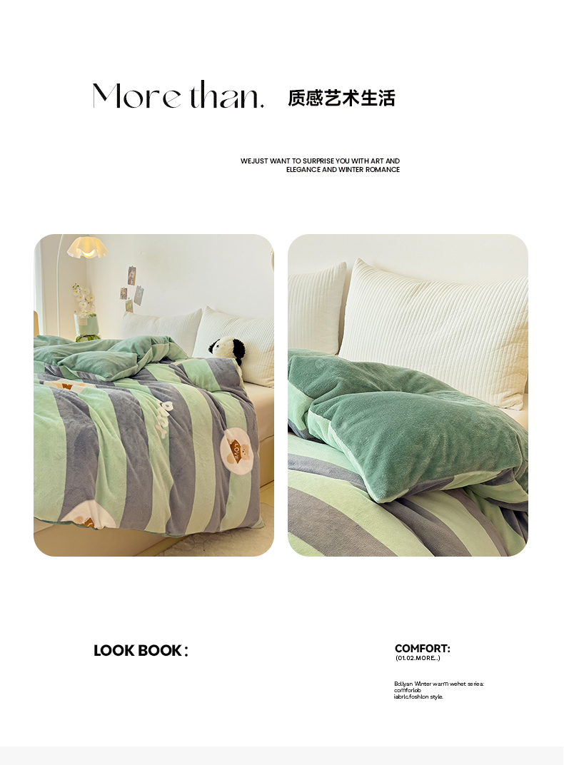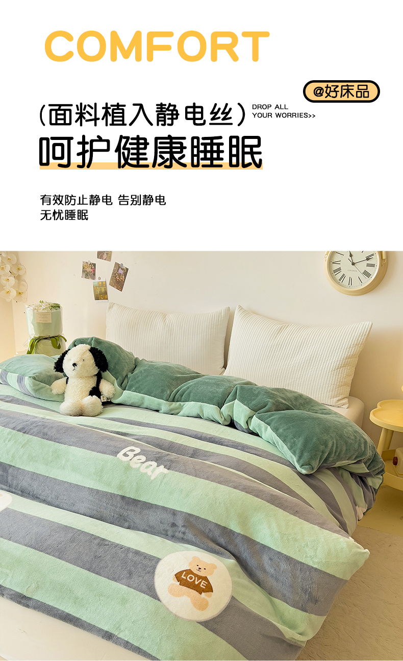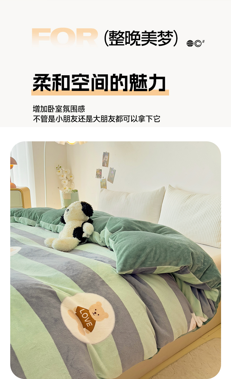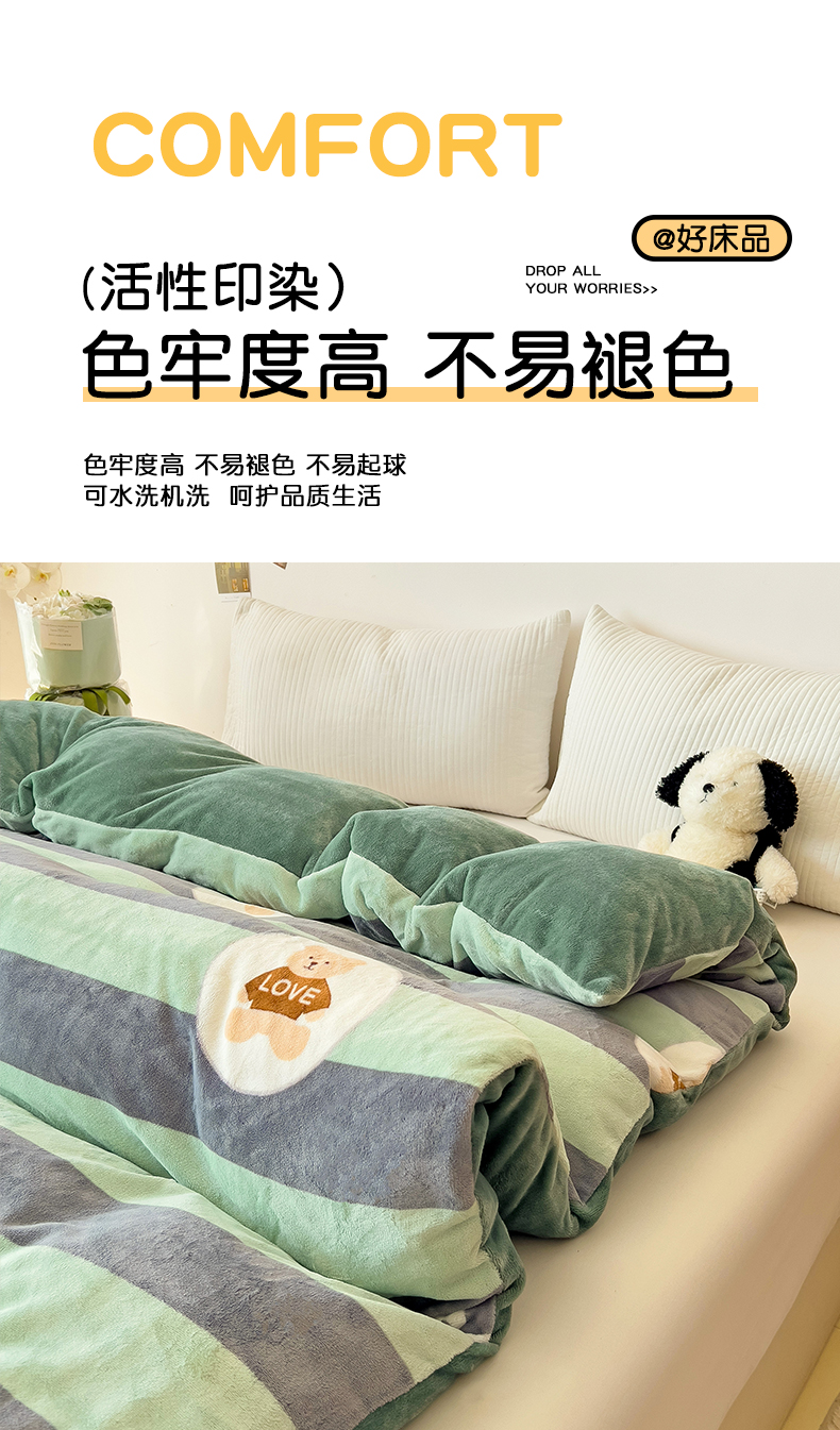 • 91家纺网 家纺一手货源 找家纺 大柏树 2025新款A类高克重亲肤舒适牛奶绒印花四件套-单被套可定制 布琪小熊-绿