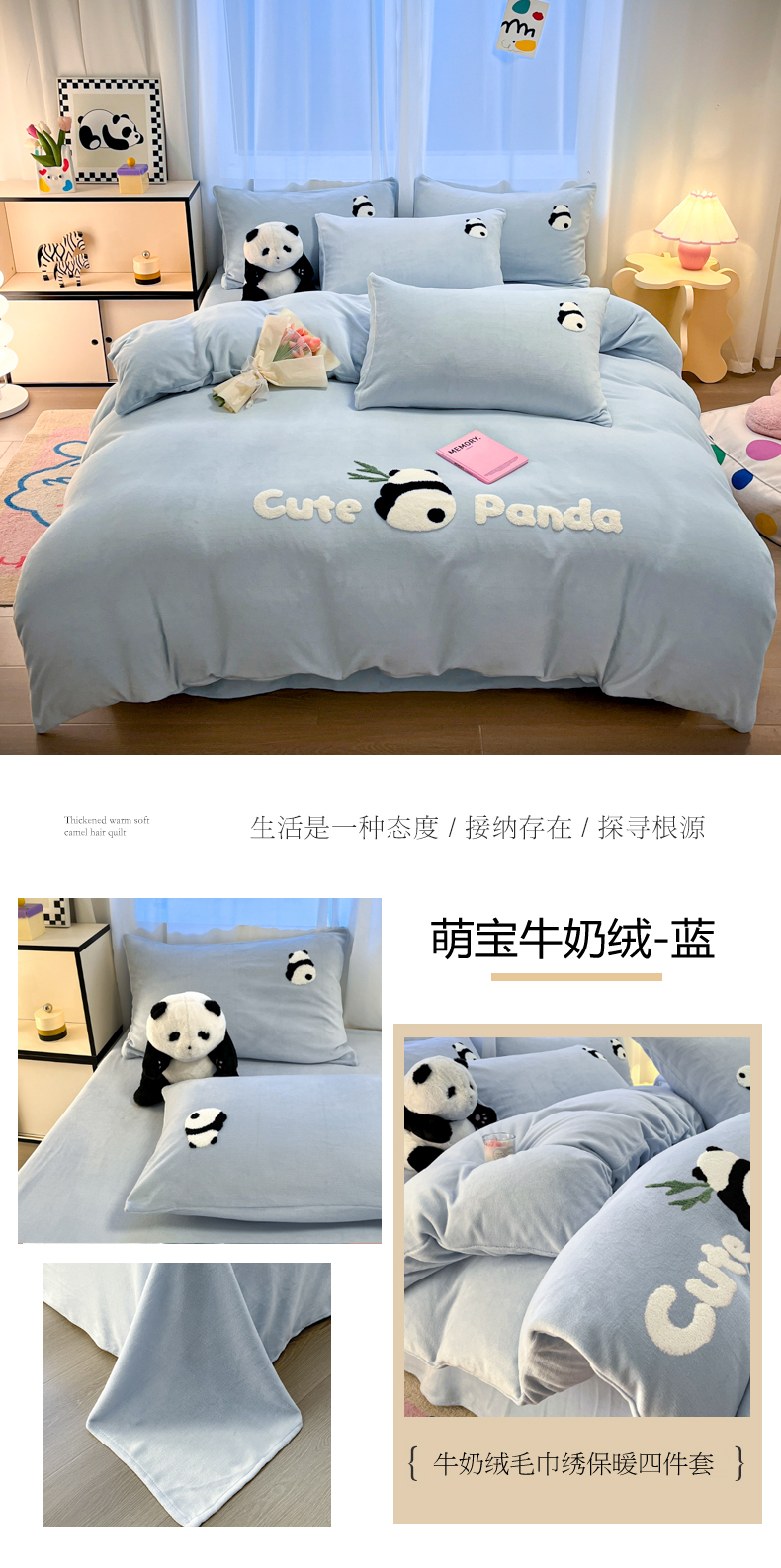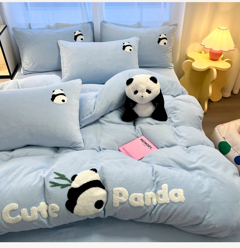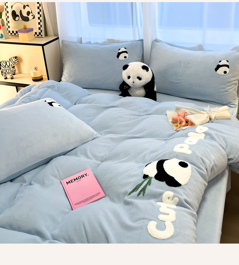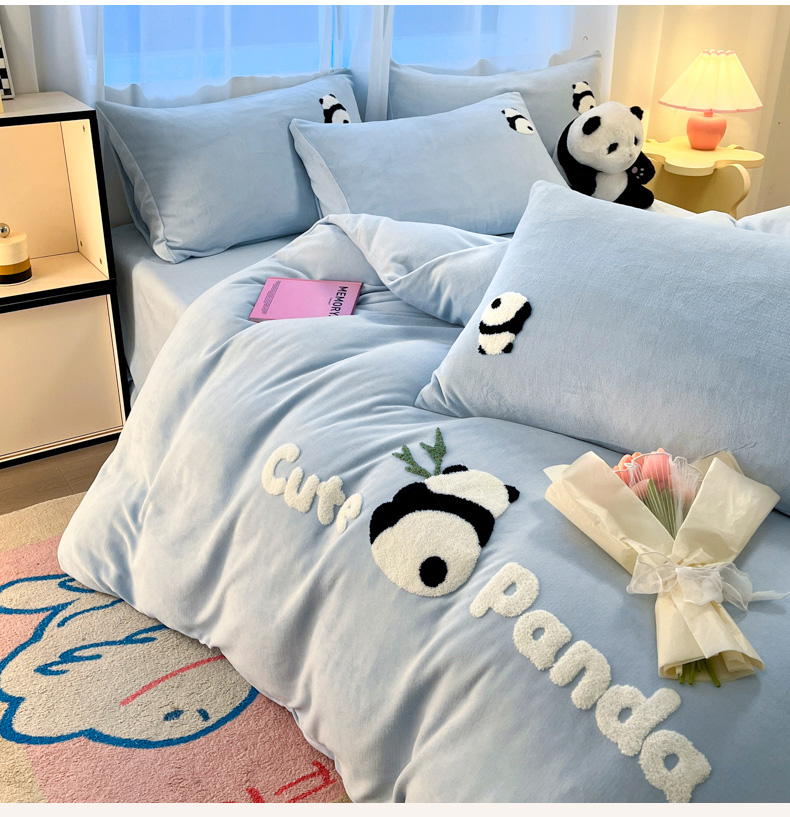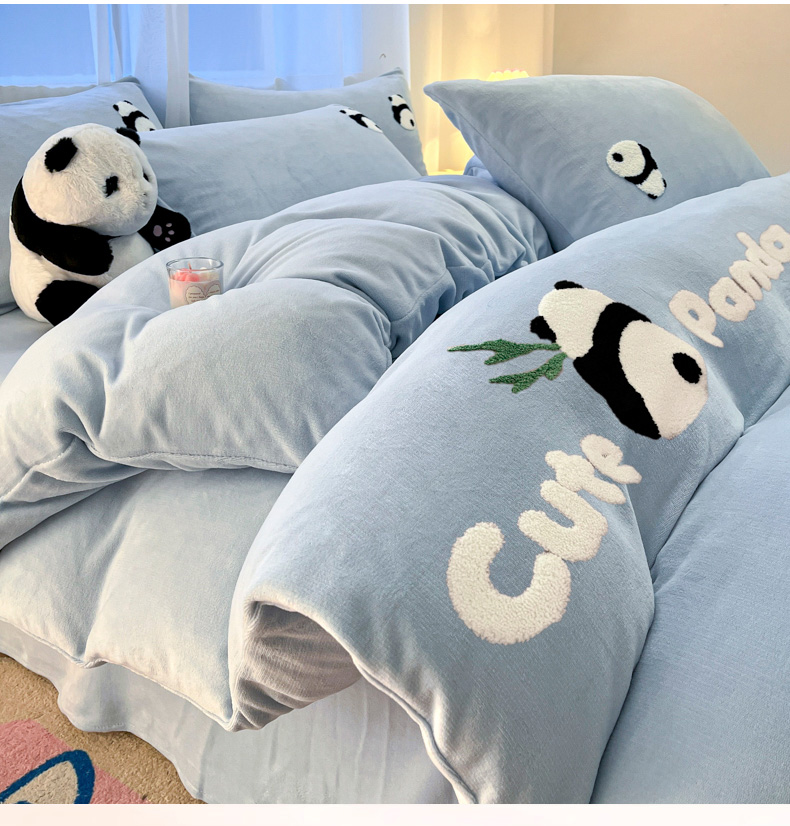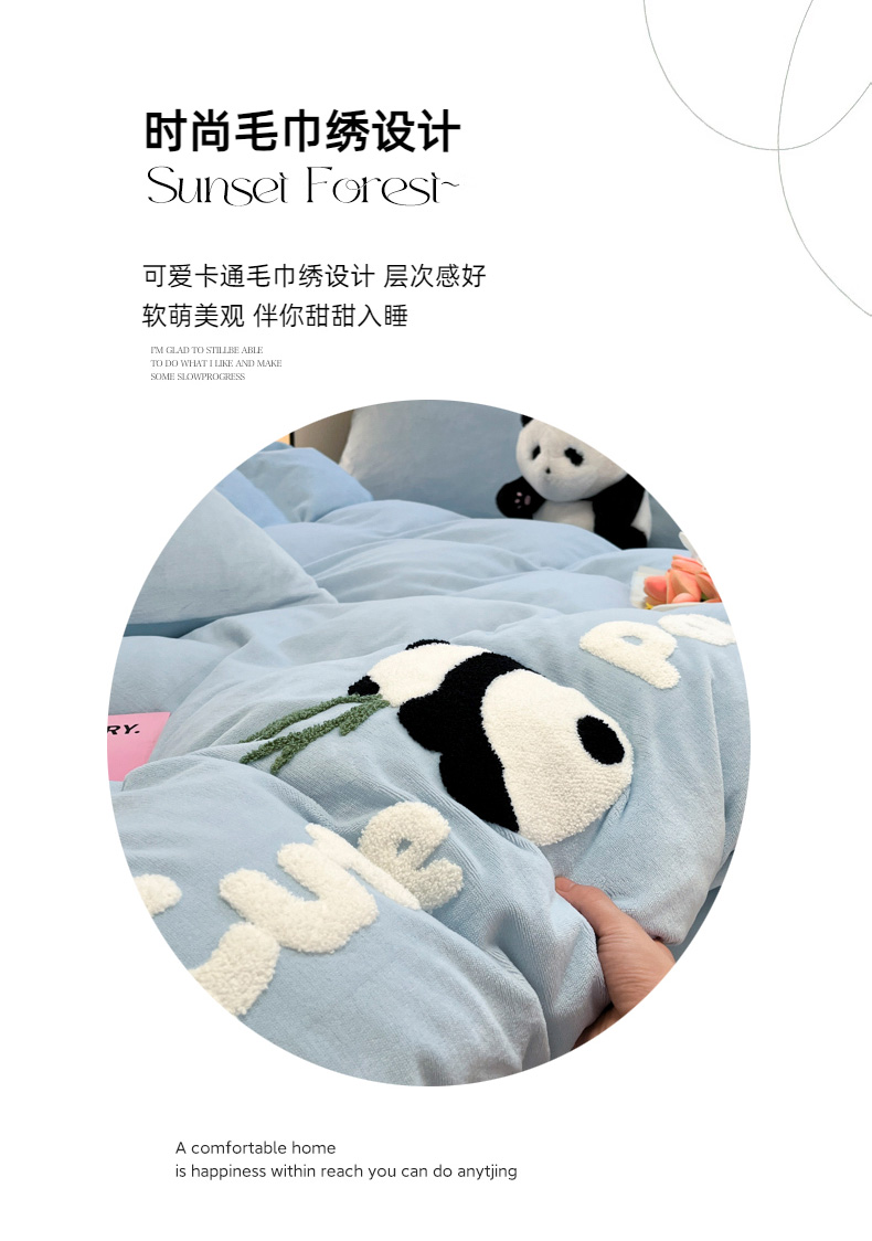 葡萄家 2024新款卡通牛奶绒毛巾绣可爱熊猫保暖四件套提供买家秀 萌宝牛奶绒-蓝