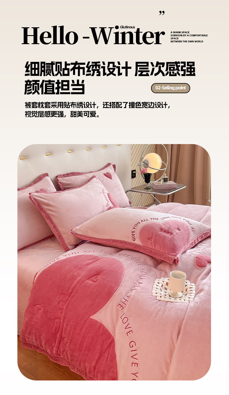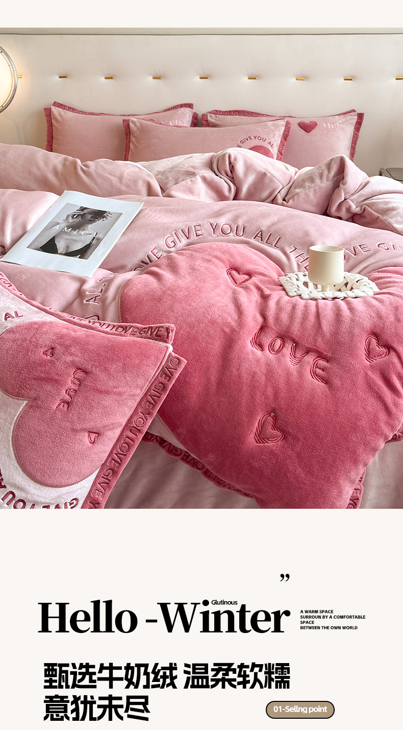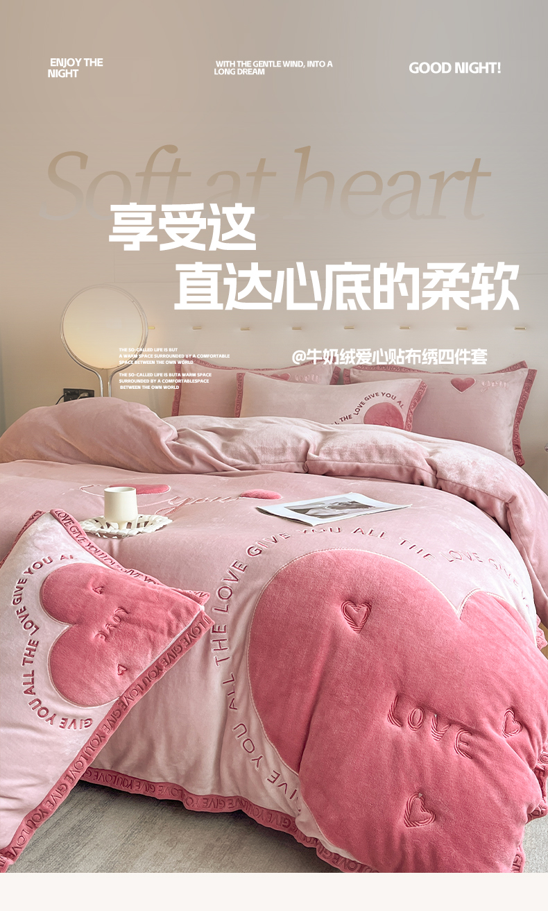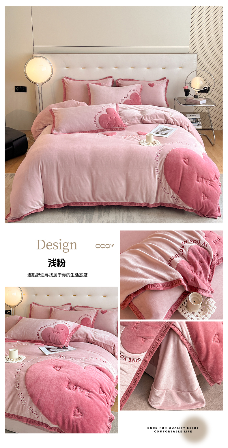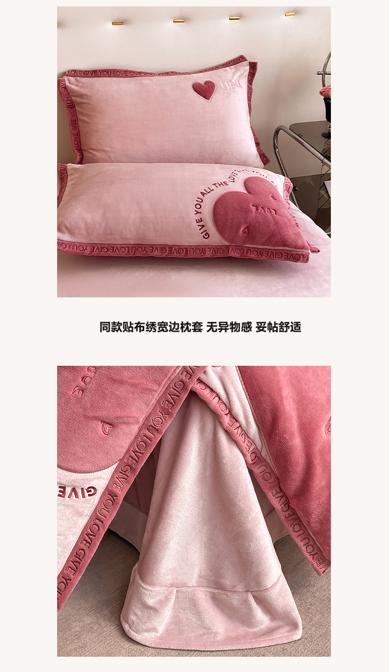 商品名称:博纳家纺 2024新款牛奶绒贴布绣四件套-爱心love baby 浅粉