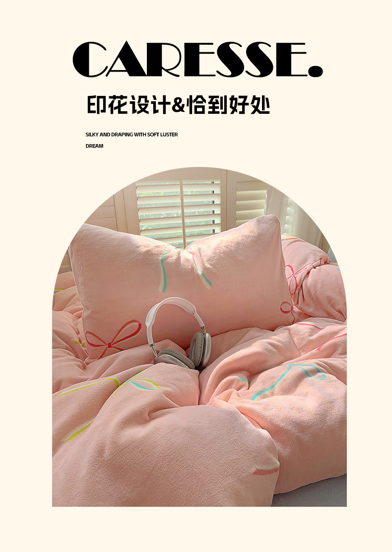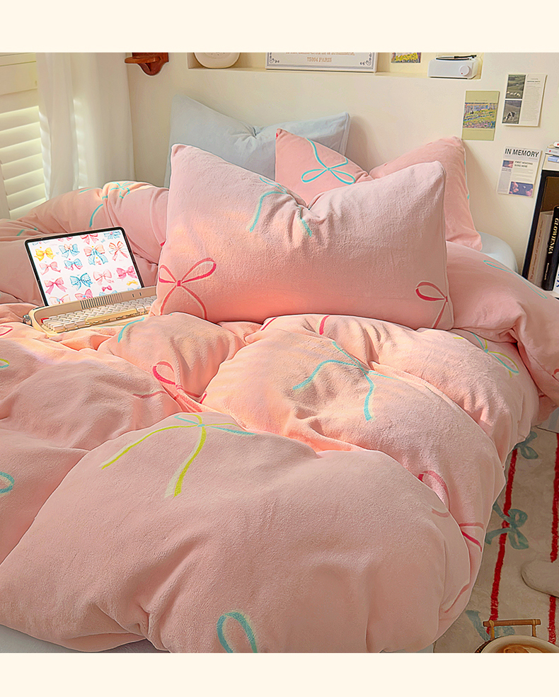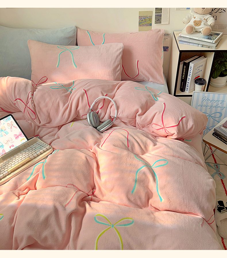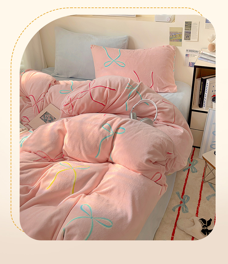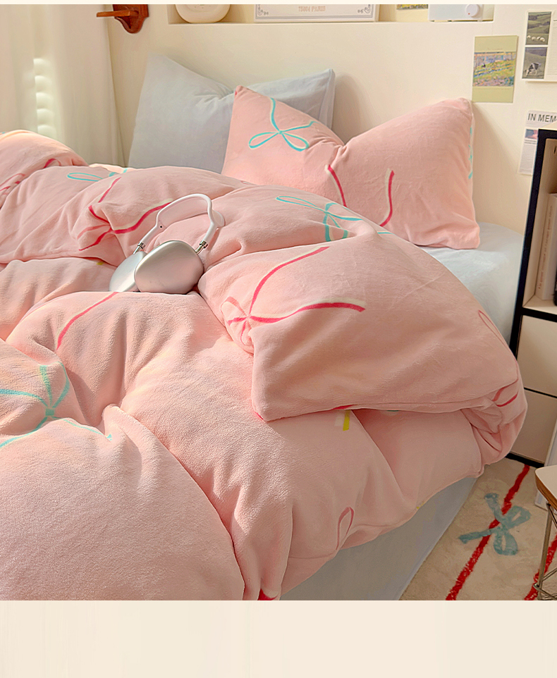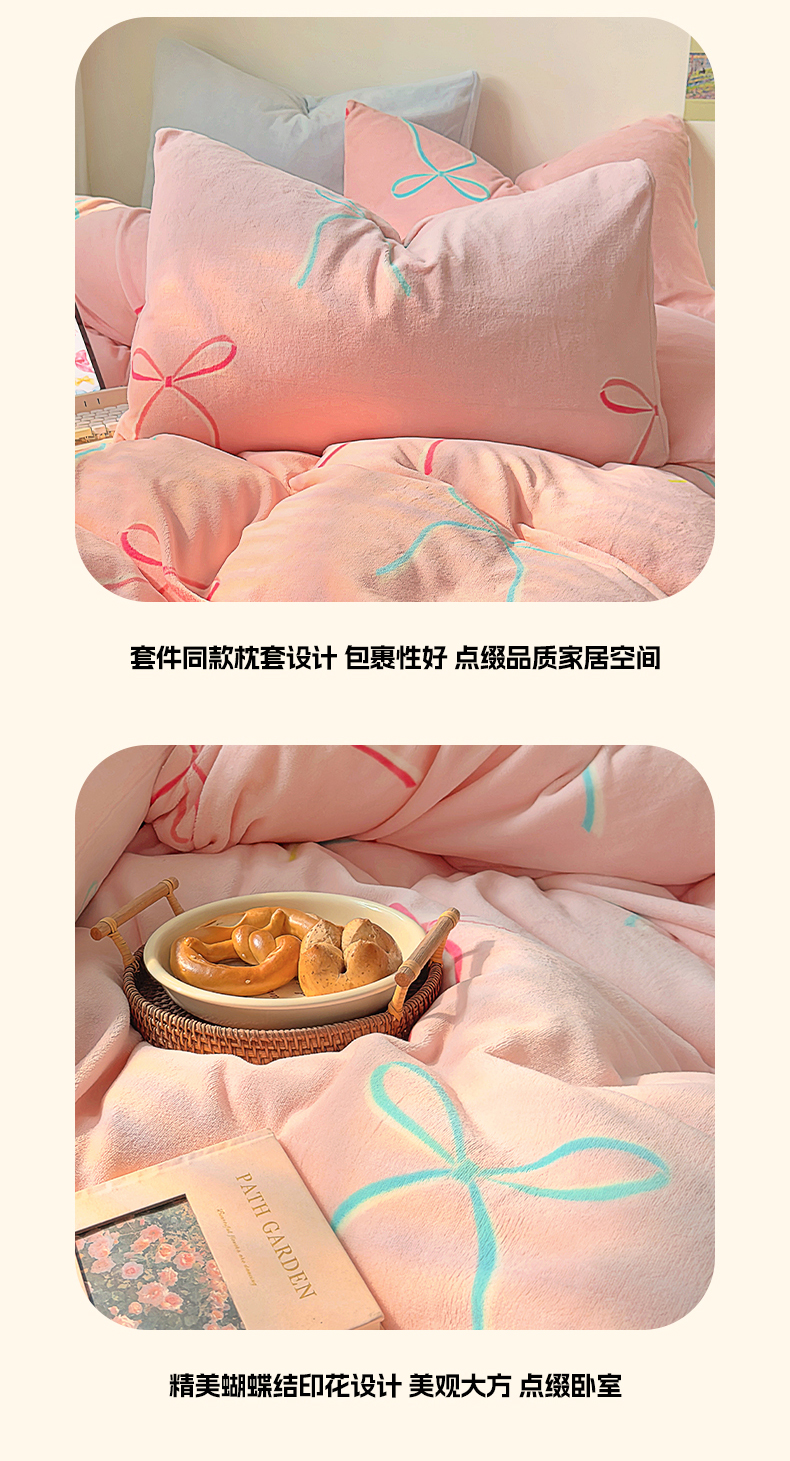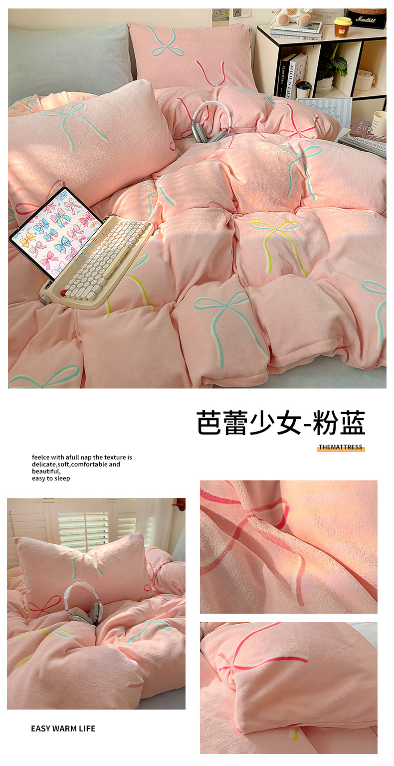 山茶家纺 2024新款高克重牛奶绒印花四件套-蝴蝶结系列 芭蕾少女-粉蓝