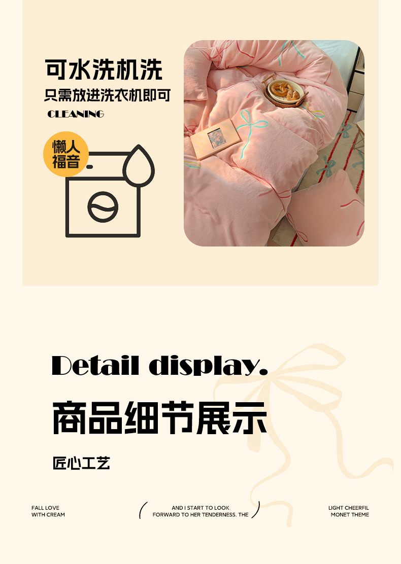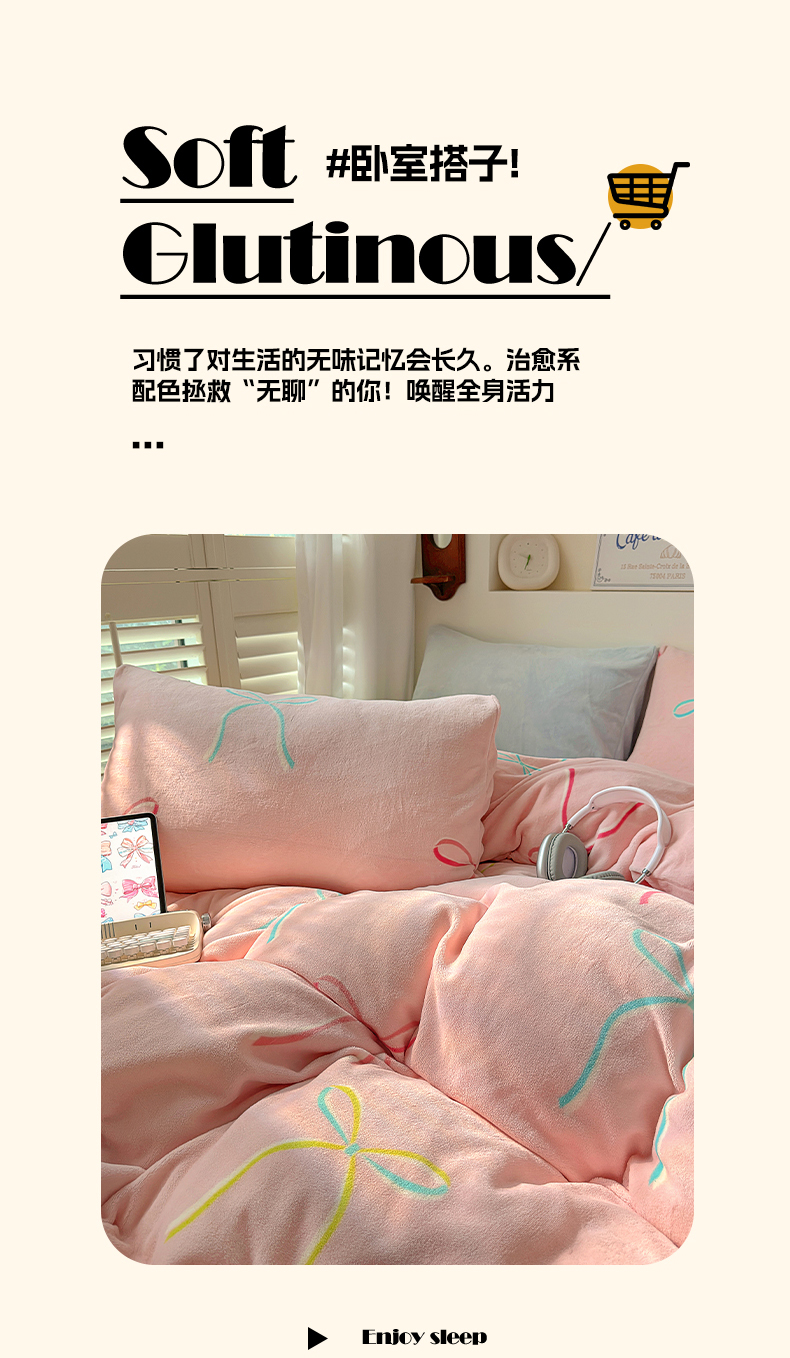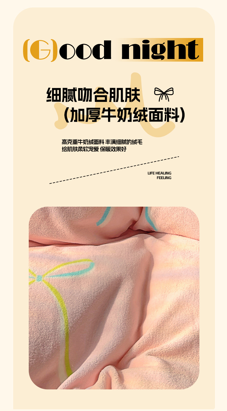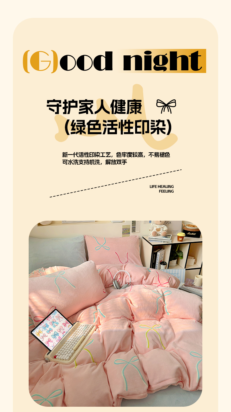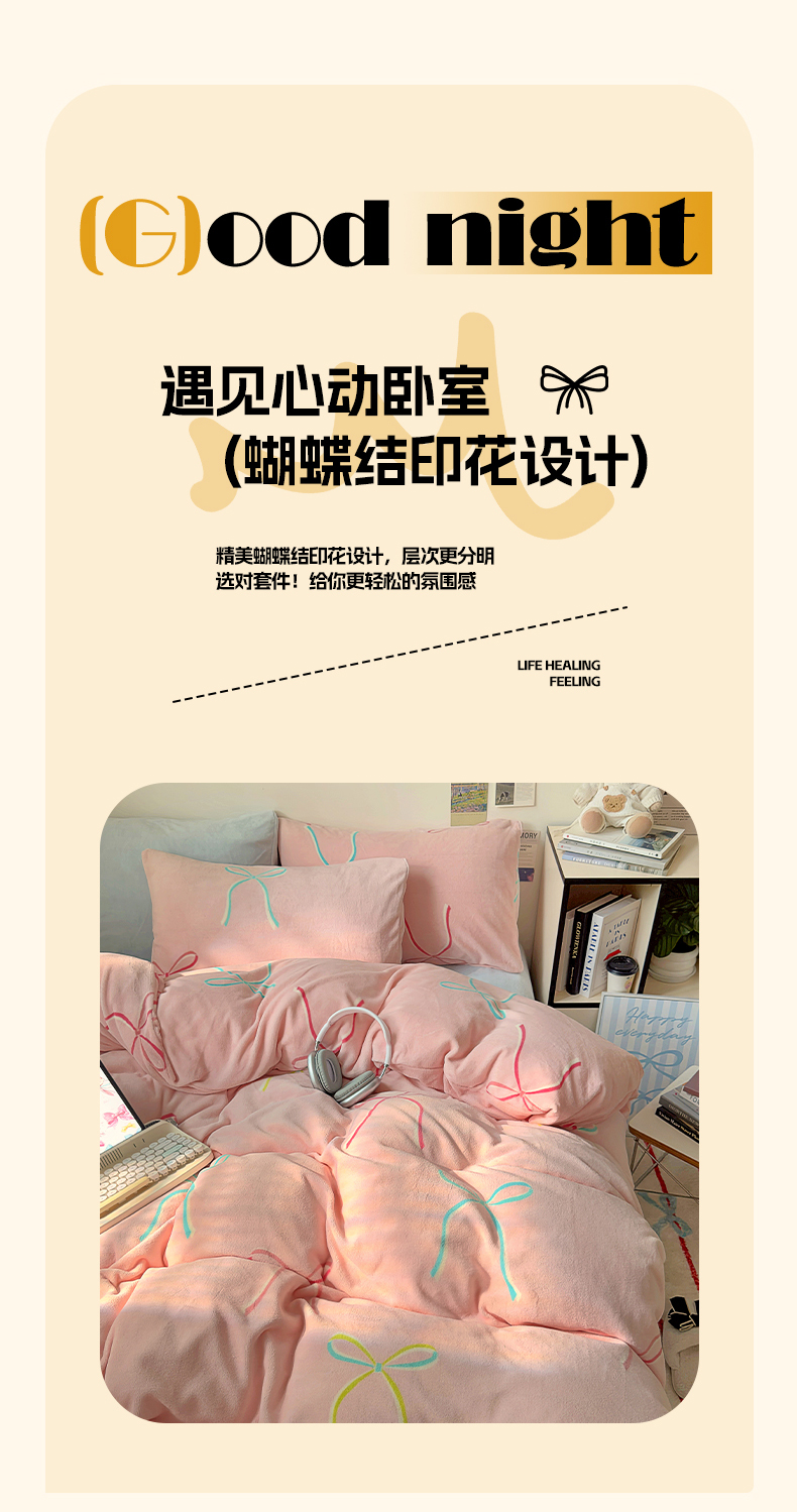 山茶家纺 2024新款高克重牛奶绒印花四件套-蝴蝶结系列 芭蕾少女-粉蓝