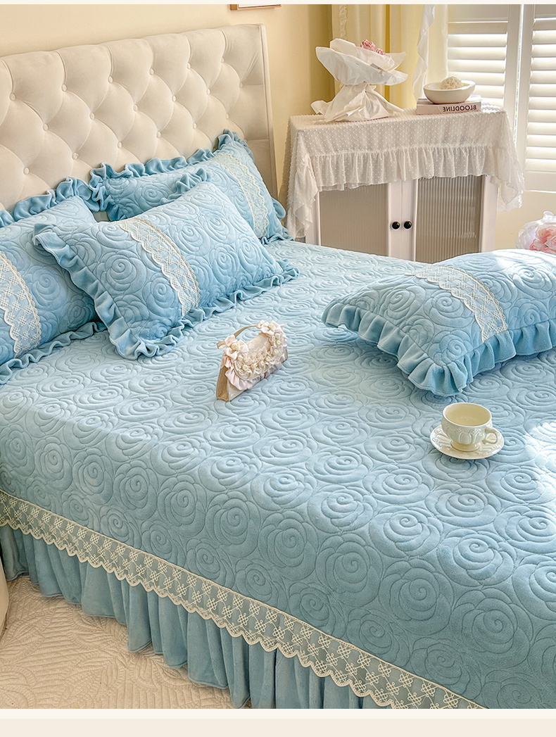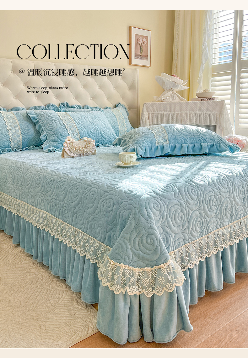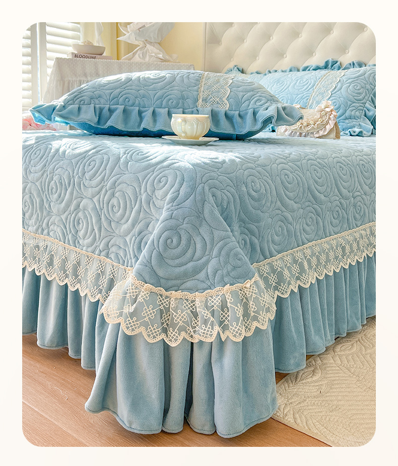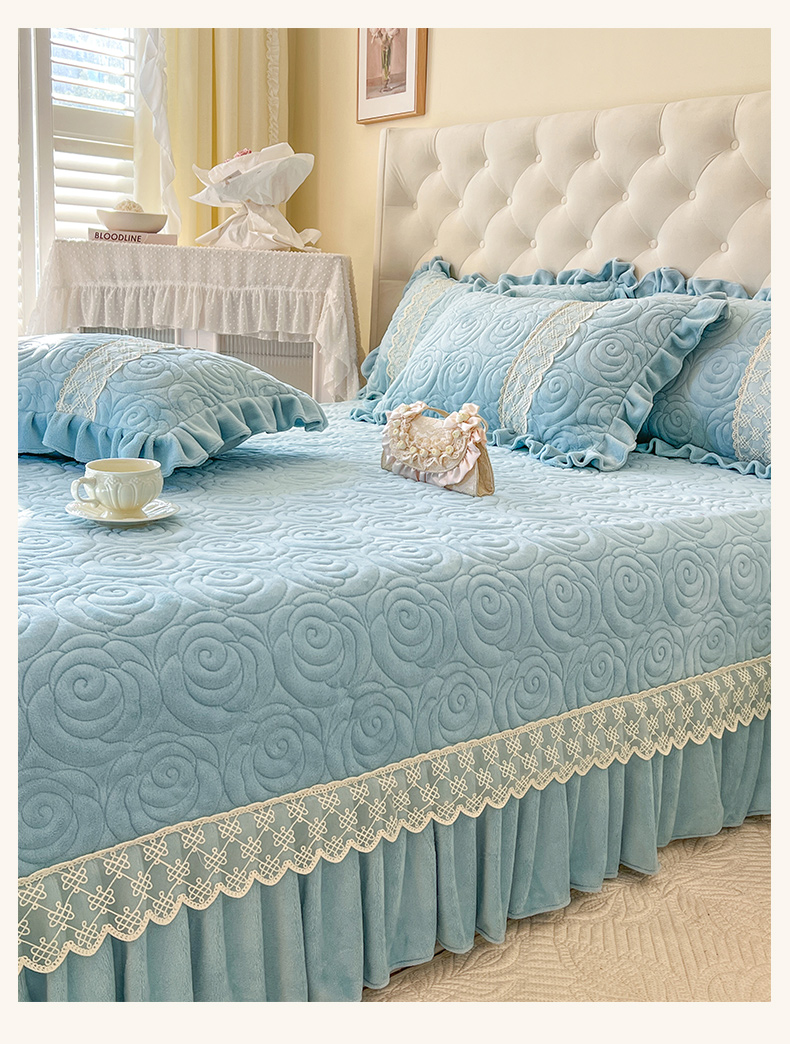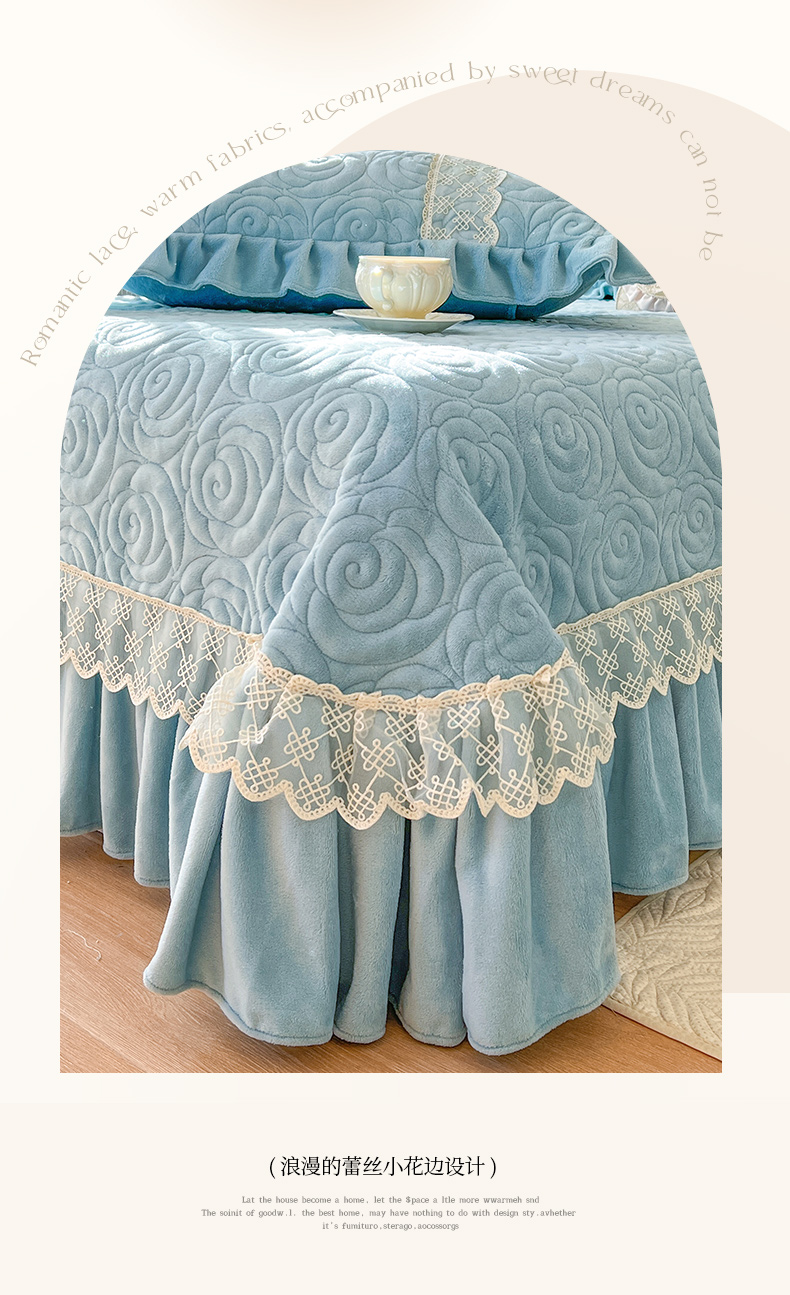 商品名称:恋尚 2024新款高克重牛奶绒夹棉蕾丝花边单床盖--朵拉 朵拉-天空蓝