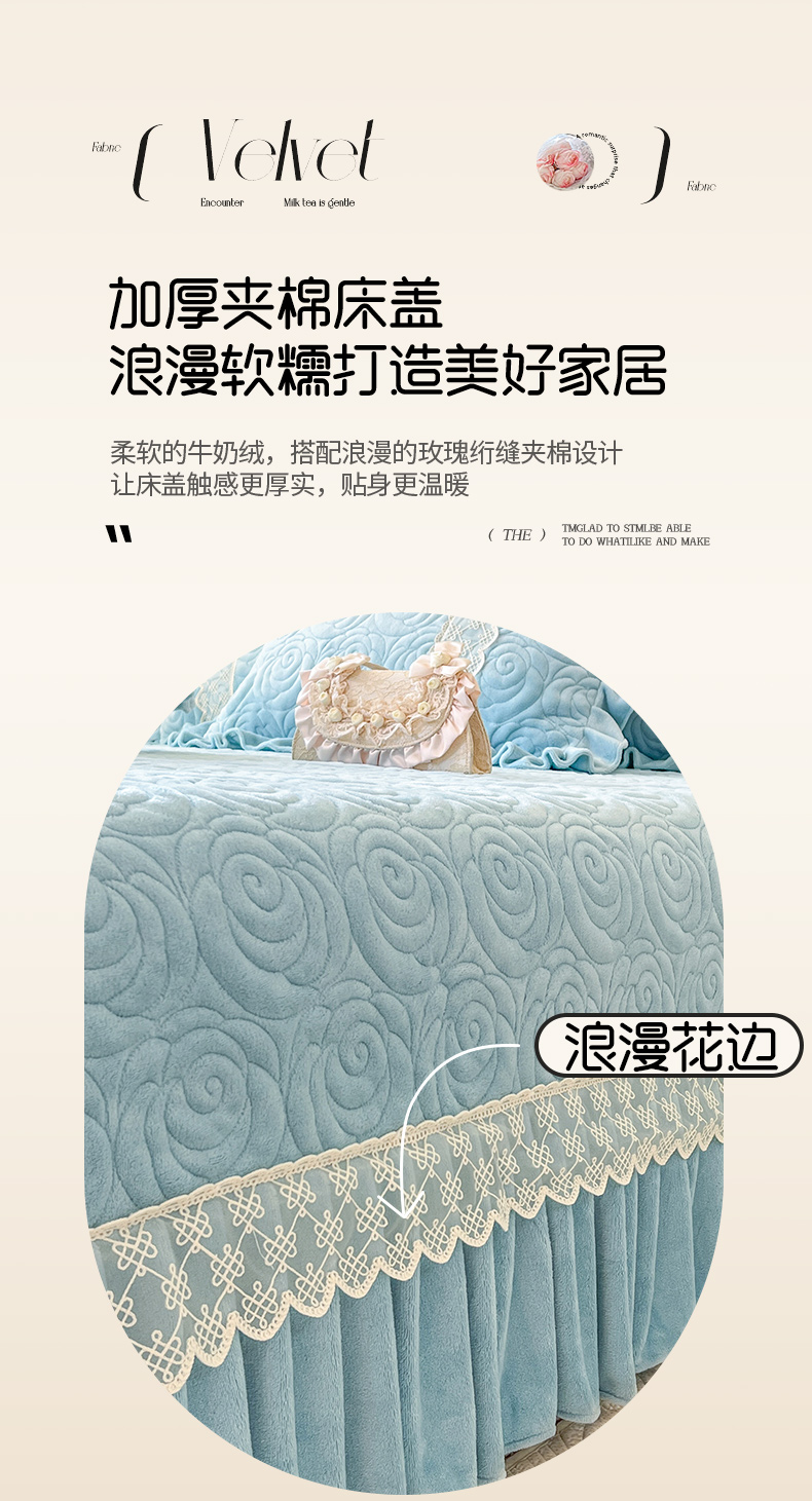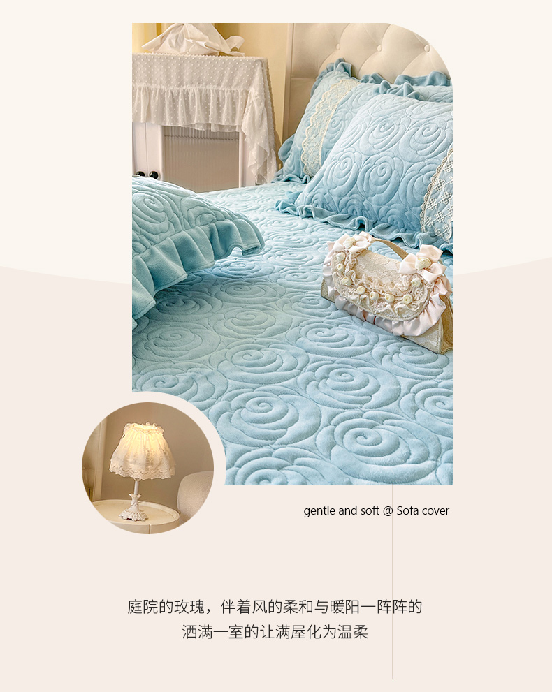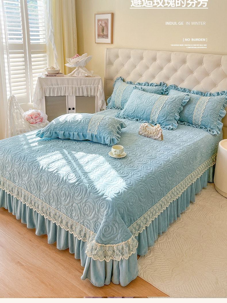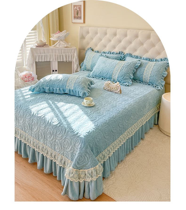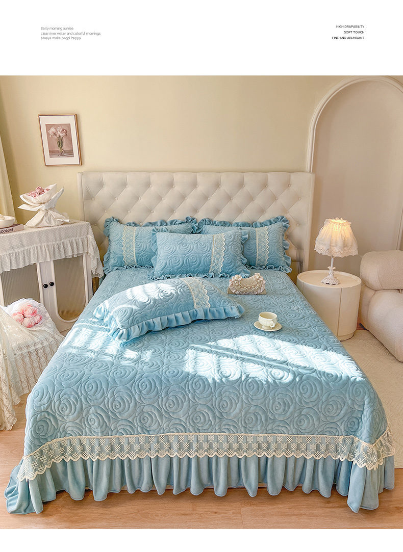 商品名称:恋尚 2024新款高克重牛奶绒夹棉蕾丝花边单床盖--朵拉 朵拉-天空蓝