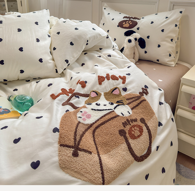 (总)曼之夏 2025新款全棉纯棉40支学生季卡通印花四件套,椰蓝小腊肠,茶茶狗,格子猫,嗨皮狗,开心屋,可爱多,可可汪,玛奇朵,奶昔小熊,泡芙小象,曲奇小狗,趣味熊,甜甜圈,甜心猫咪,童画,小狗日记,樱桃熊仔