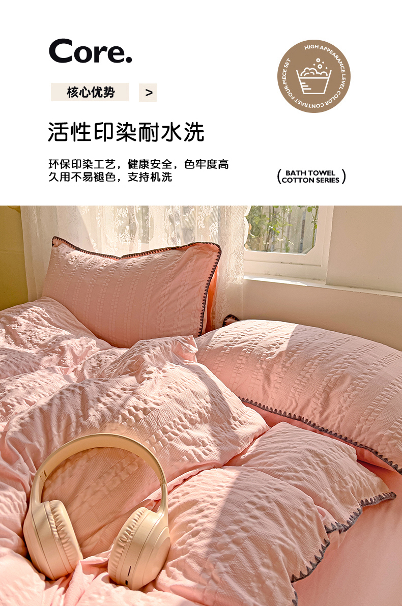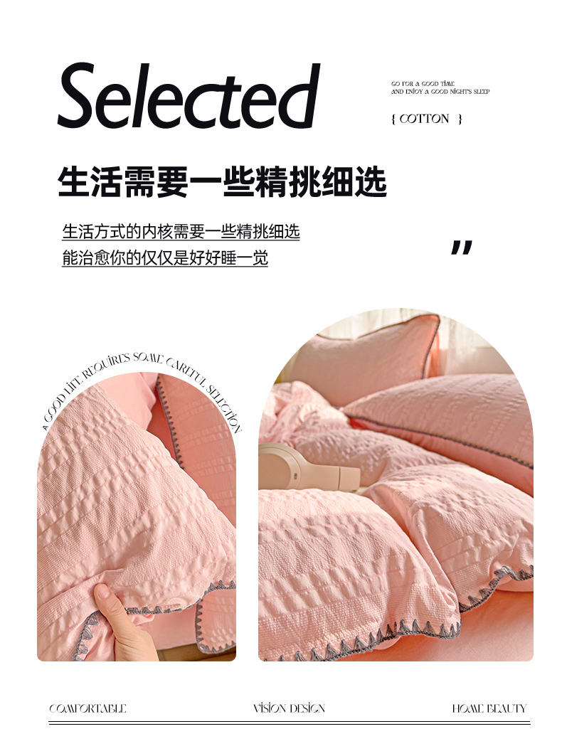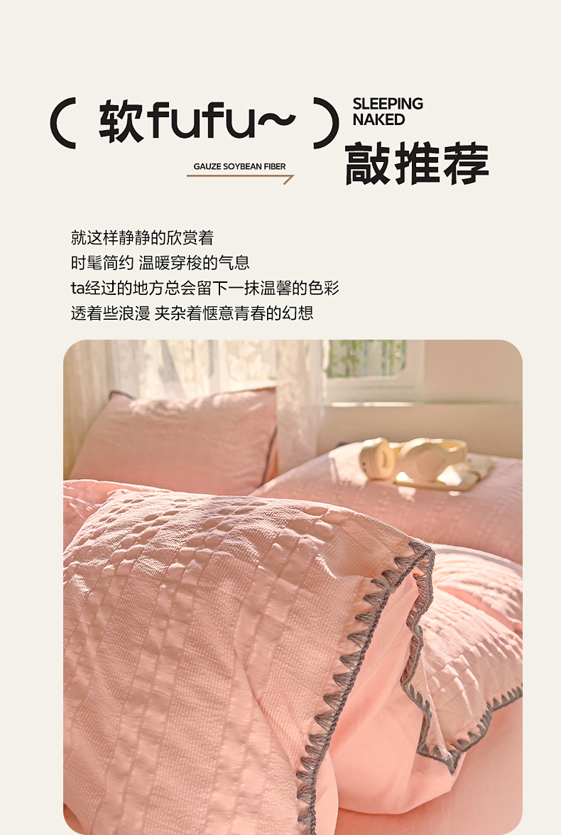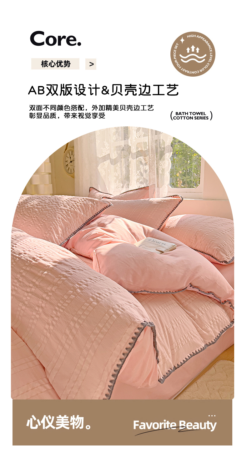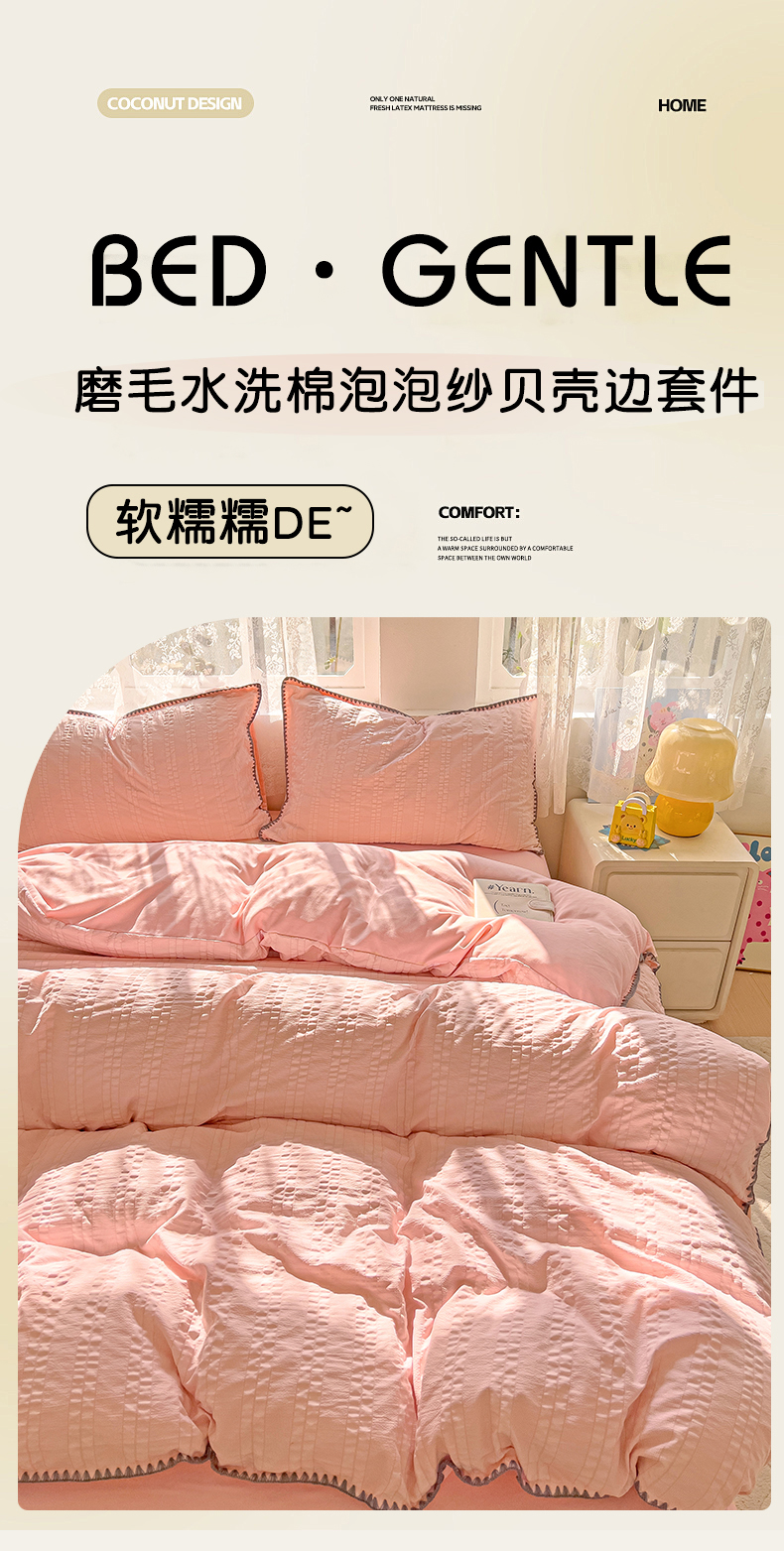 商品名称:娜娜 2025新款磨毛水洗棉泡泡纱贝壳边四件套 泡泡纱-藕粉