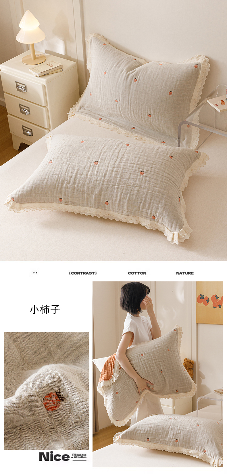 当前位置: 91家纺网 > 商品网购 > 床上用品 > 枕巾 > 麻依 2025新款棉花糖枕巾全棉四层纱布双层花边 小柿子