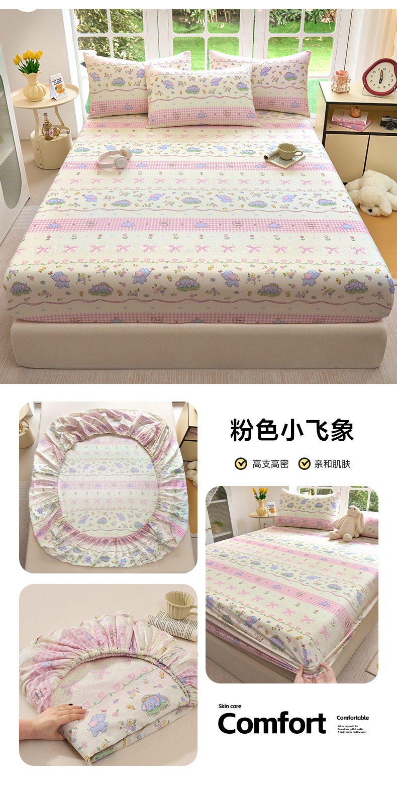 木堇家居 2025新款春夏全棉小清新卡通床单床笠枕套单品系列-床笠系列 7 粉色小飞象