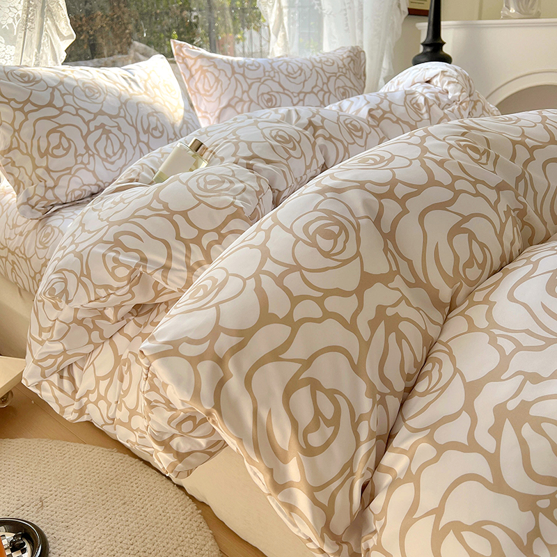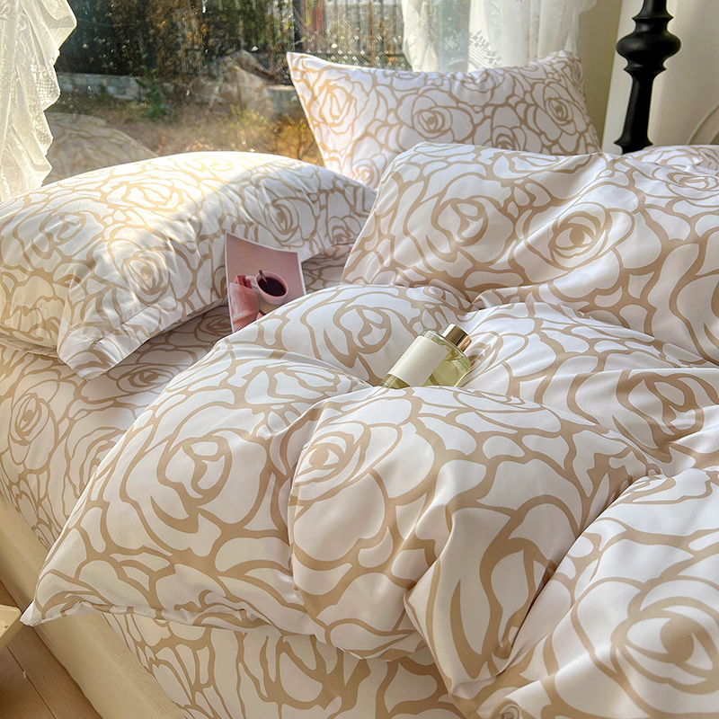 耀悦家纺 2025新款水洗真丝四件套简约印花小清新欧式ins新中式冰丝四件套 玫瑰风情