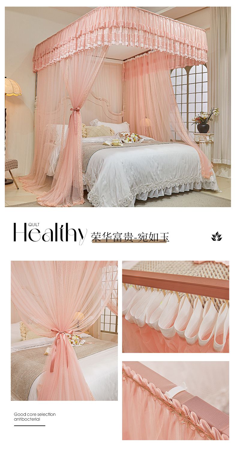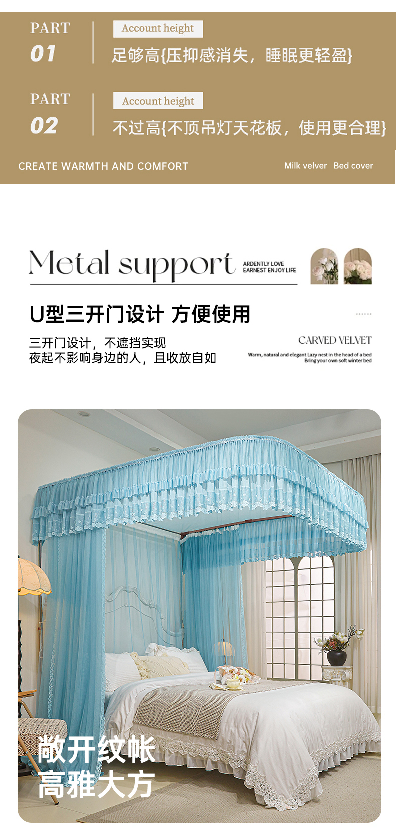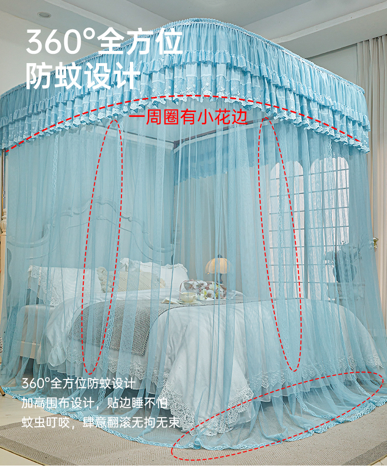 (总)2025新款双层花边全包围床笠款三开门蚊帐-幽梦星辰,奶黄,藕玉,颜淡蓝
