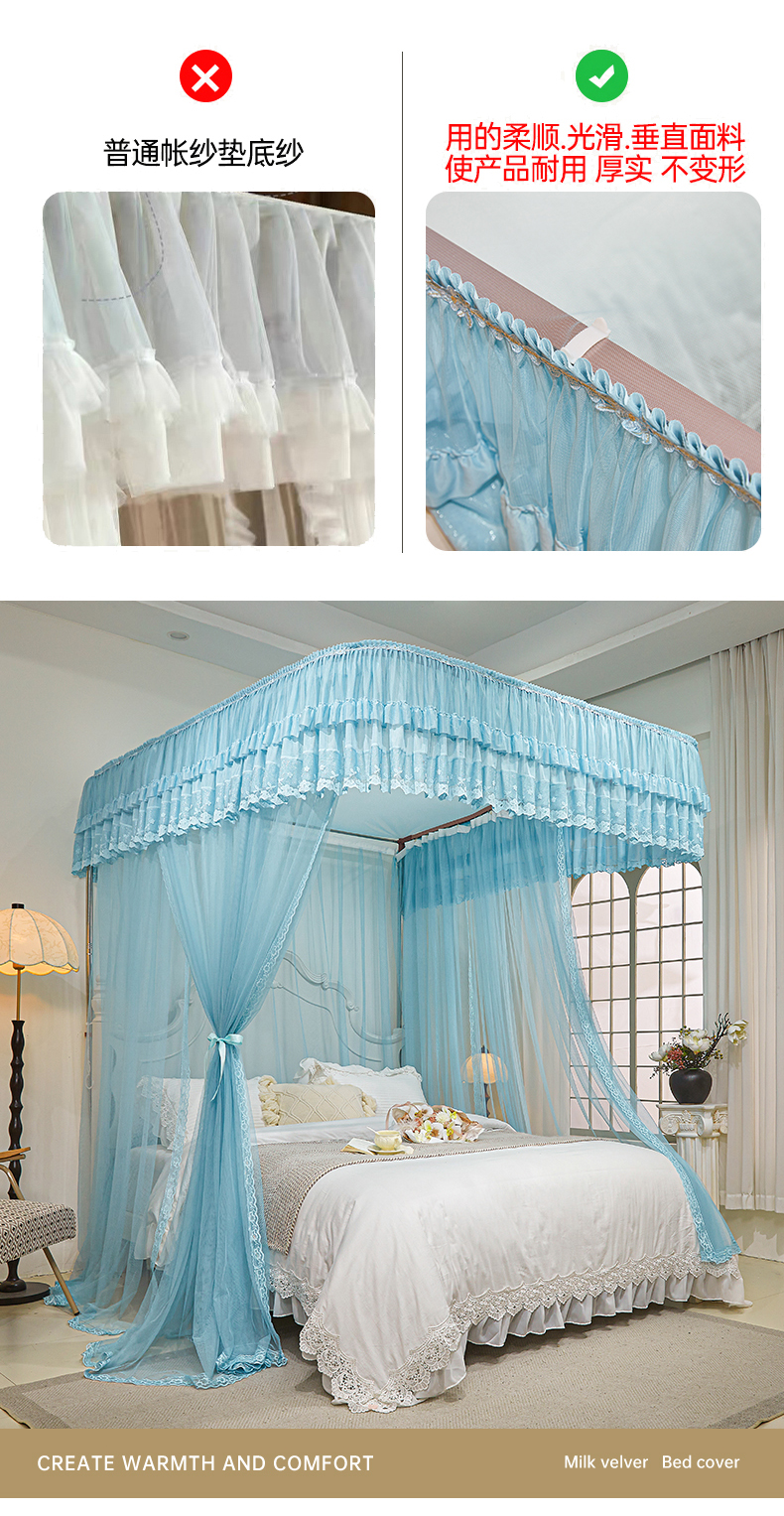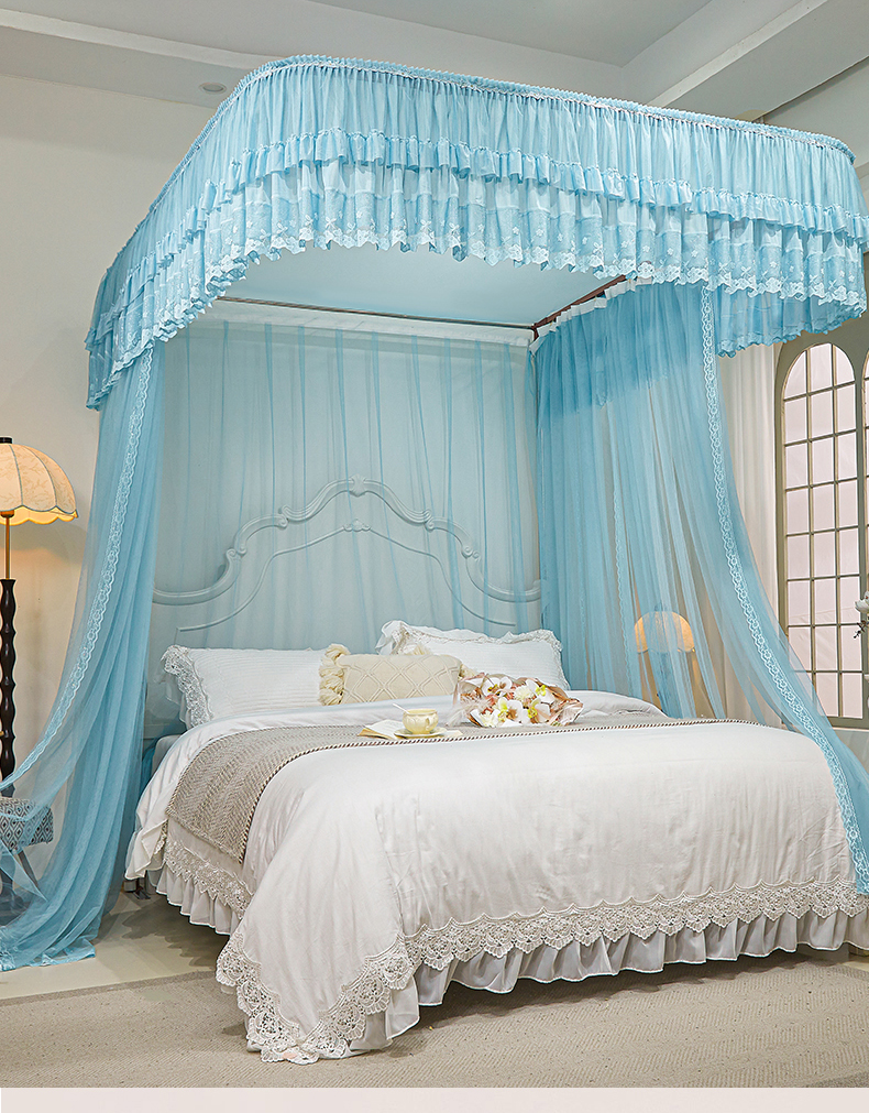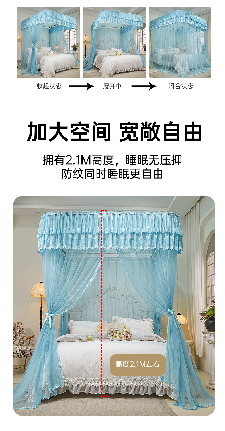 (总)2025新款双层花边全包围床笠款三开门蚊帐-幽梦星辰,奶黄,藕玉,颜淡蓝