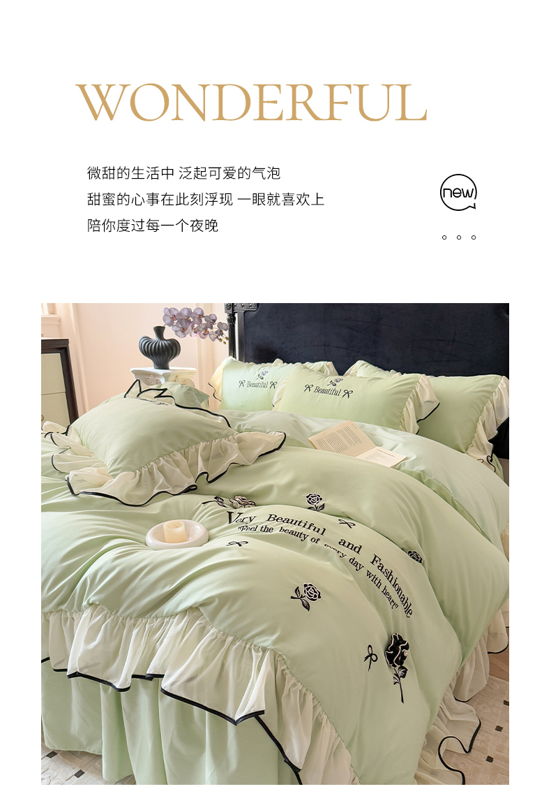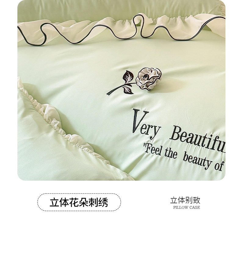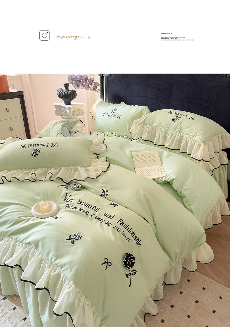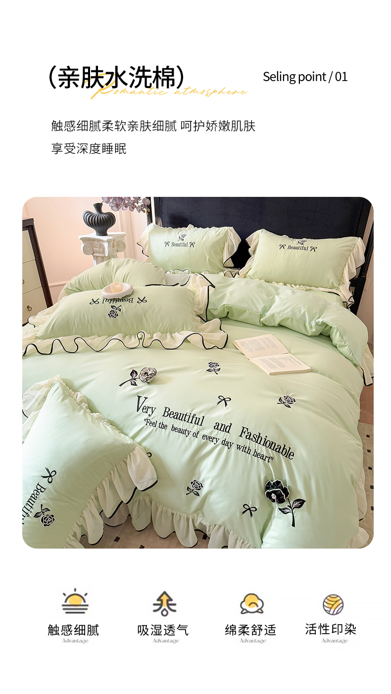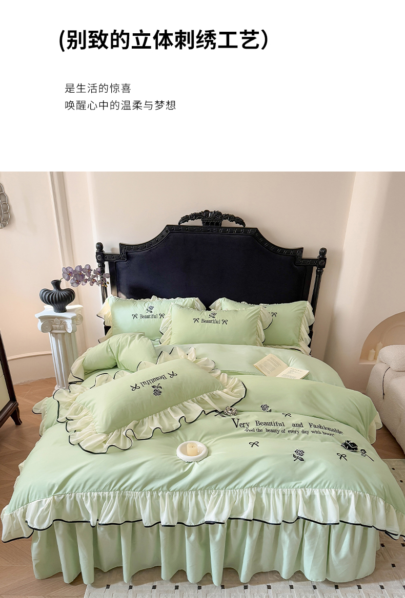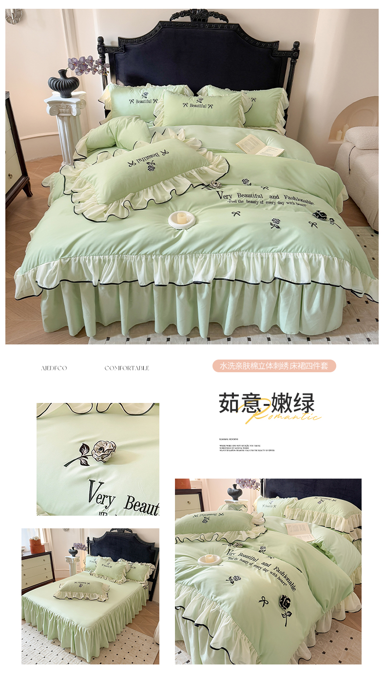 当前位置: 91家纺网 > 商品网购 > 床品套件 > 四件套 > 水洗棉四件套 > 富盛家纺 2025新款水洗亲肤棉刺绣床裙款四件套公主风四件套 茹意—嫩绿