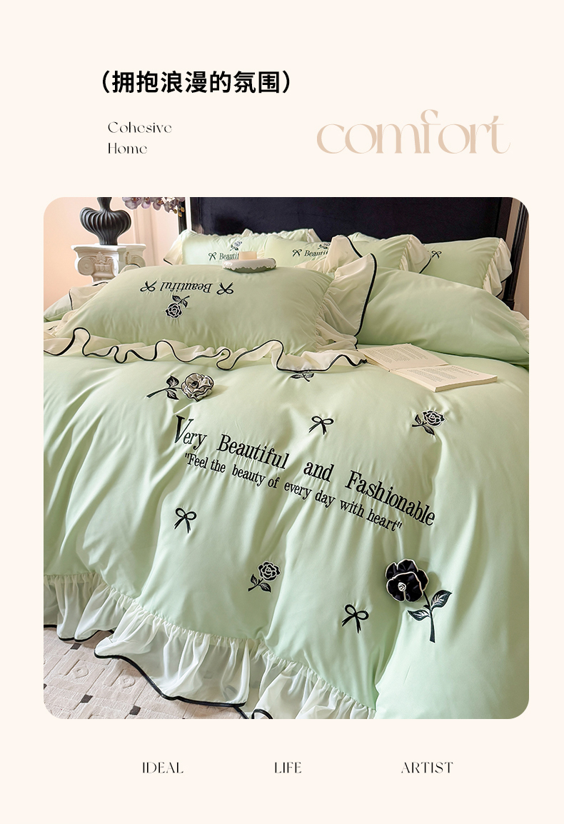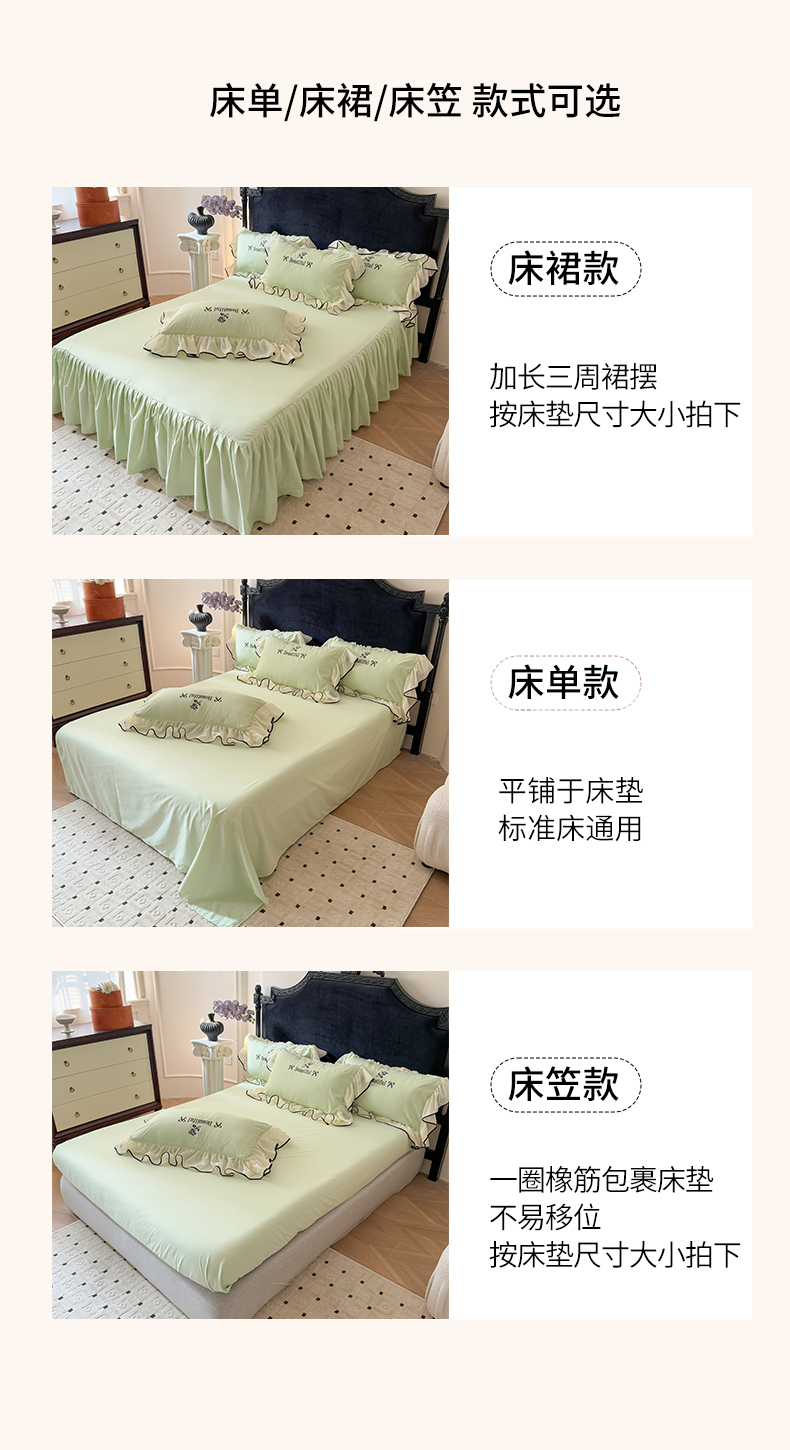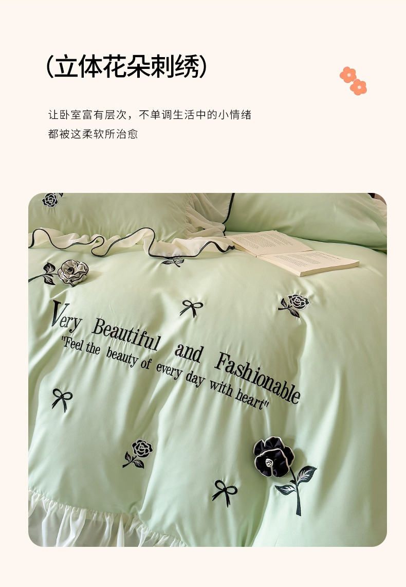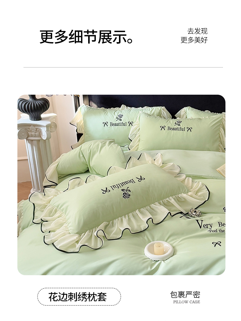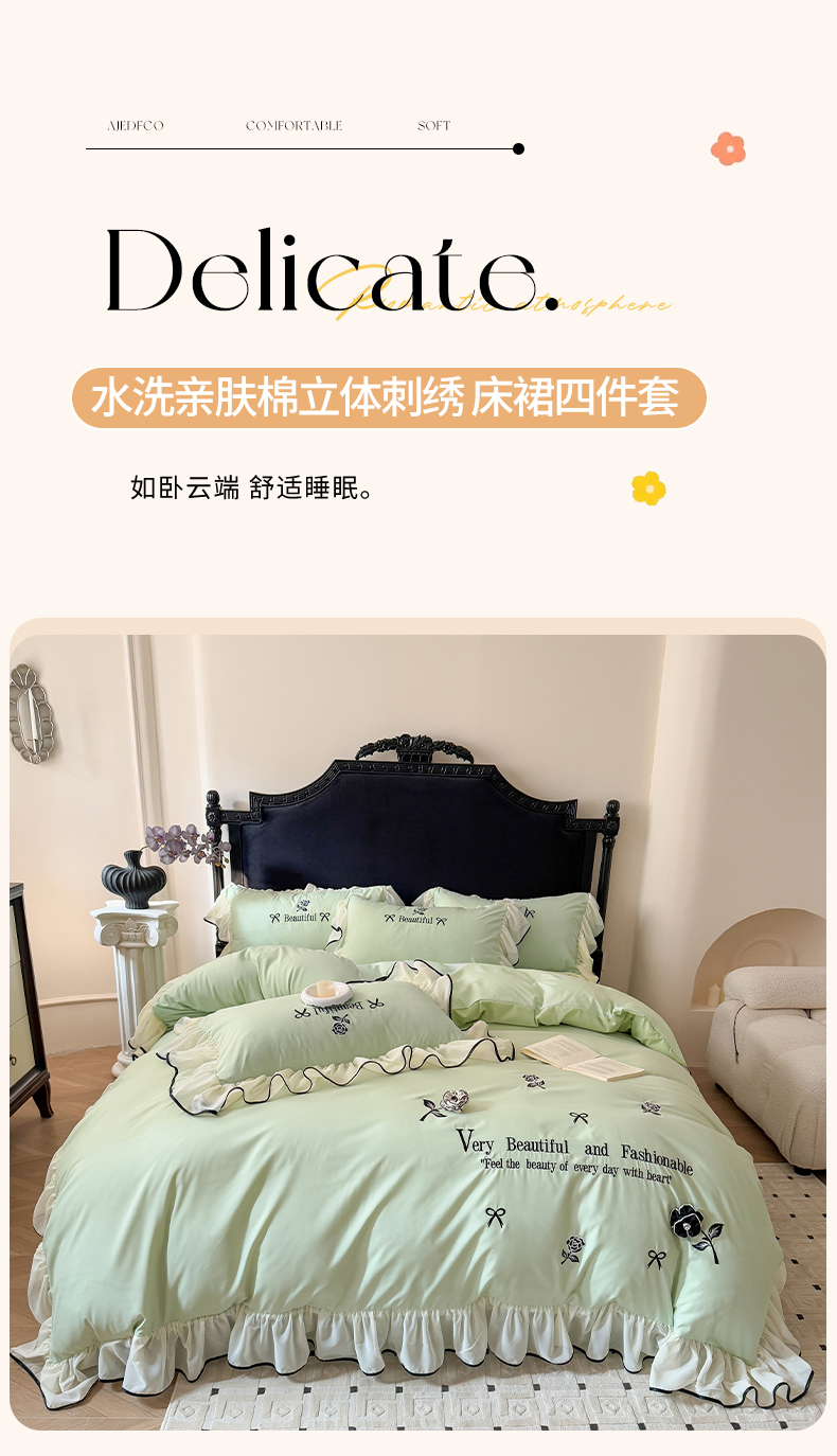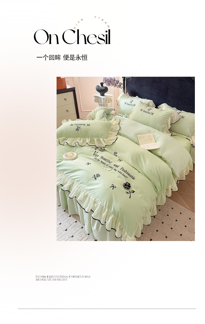 当前位置: 91家纺网 > 商品网购 > 床品套件 > 四件套 > 水洗棉四件套 > 富盛家纺 2025新款水洗亲肤棉刺绣床裙款四件套公主风四件套 茹意—嫩绿