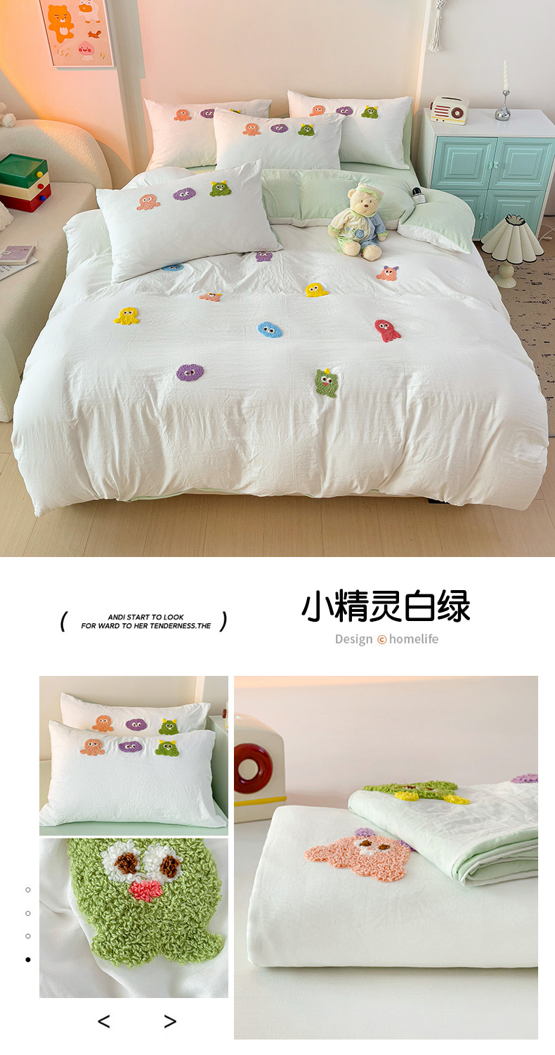 当前位置: 91家纺网 > 商品网购 > 床品套件 > 四件套 > 毛巾绣四件套 > 韩巢家纺 2025超柔水洗棉毛巾绣床上用品四件套-小精灵系列(提供卖家秀 ) 小精灵白绿