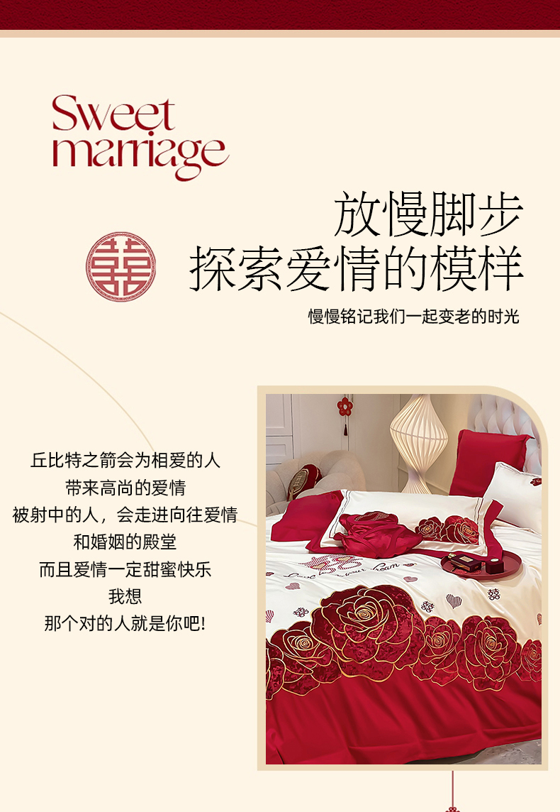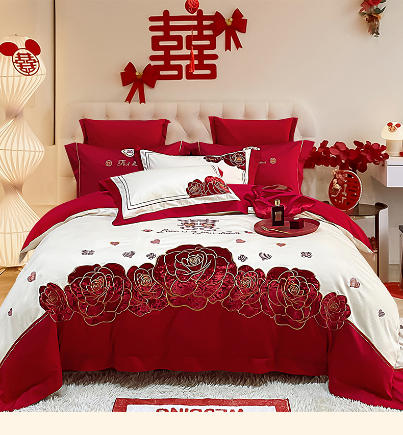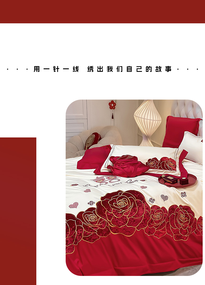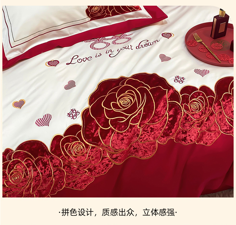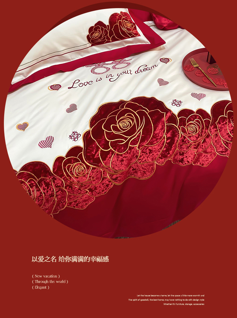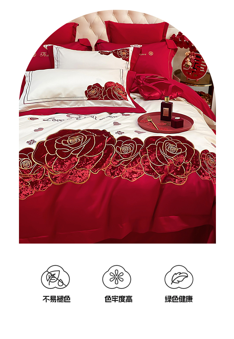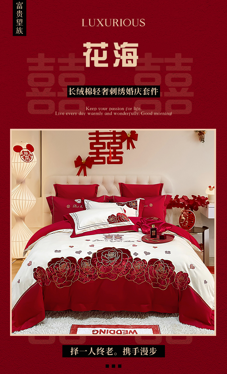 当前位置: 91家纺网 > 商品网购 > 床品套件 > 四件套 > 婚庆四件套 > 千禧家纺 2025新款双面长绒棉轻奢工艺款刺绣婚庆套件 花海