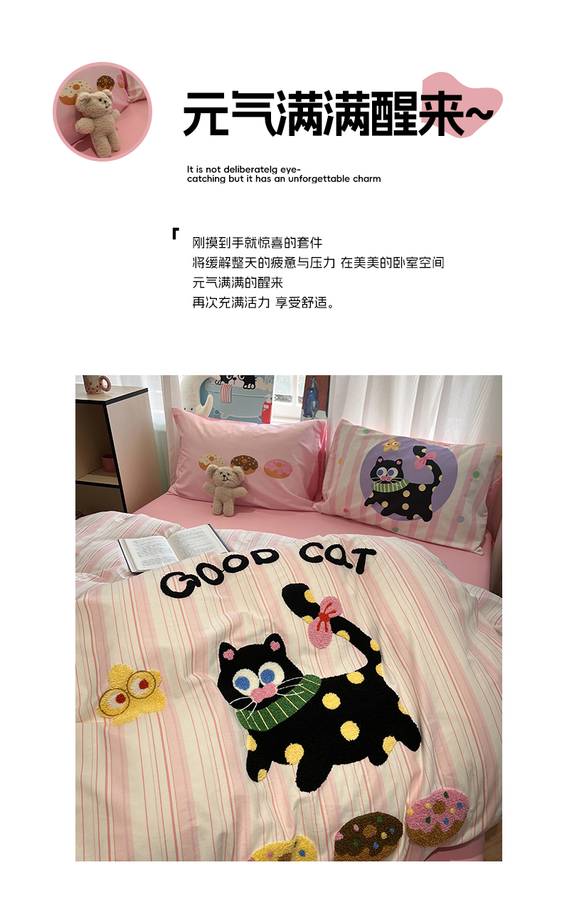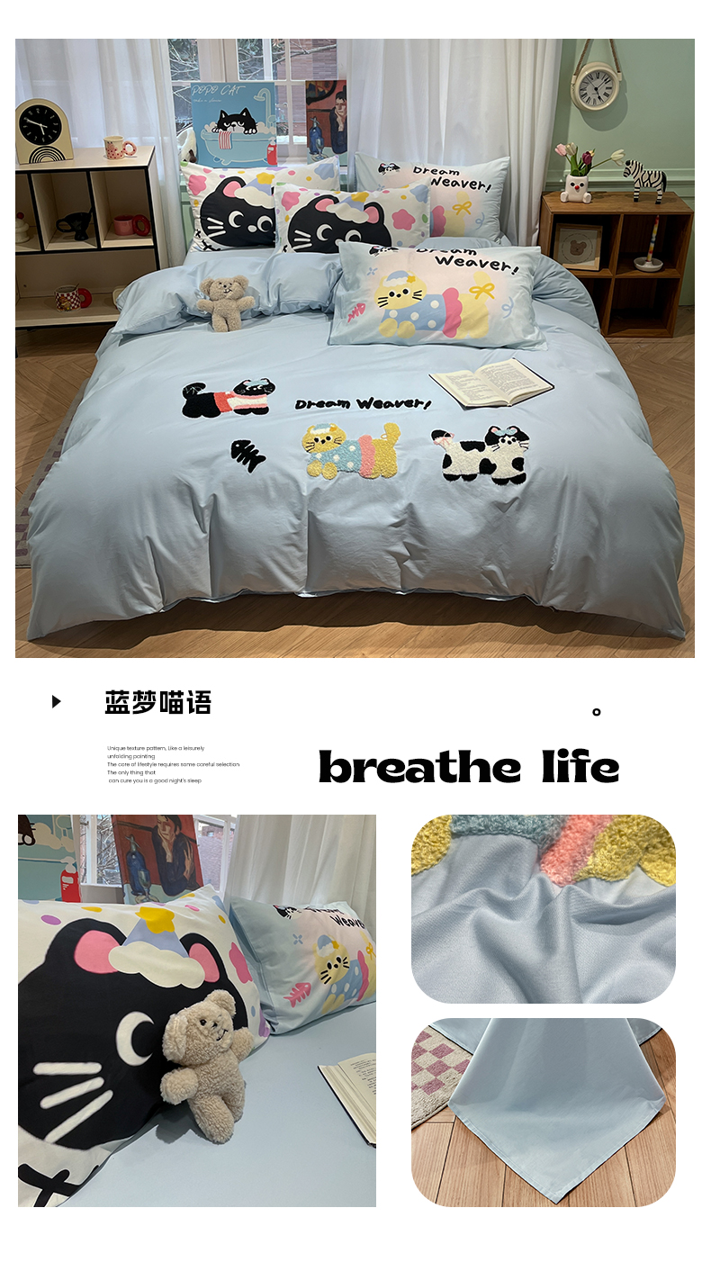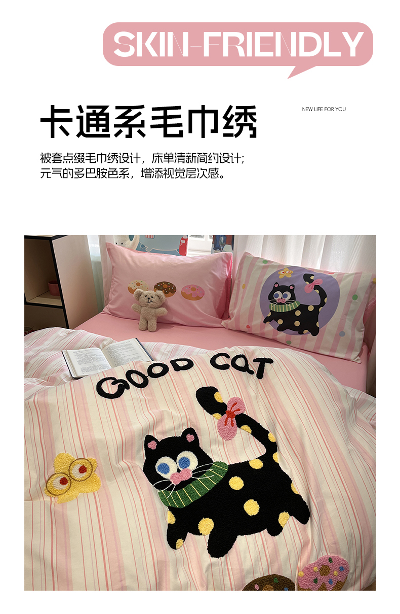 (总)蓝邻家纺 2024新款全棉磨毛卡通刺绣款四件套毛巾绣系列,安妮,汉堡先生,南极舞者,瑞瑞-绿,瑞瑞-米咖,心愿树