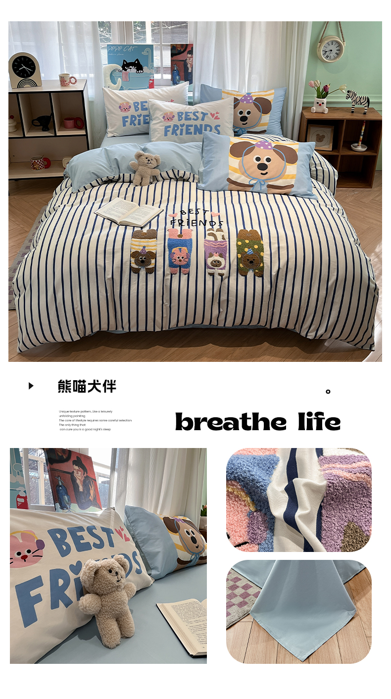 (总)蓝邻家纺 2024新款全棉磨毛卡通刺绣款四件套拼色刺绣系列,绅士熊-蓝,绅士熊-咖,淑女熊-蓝