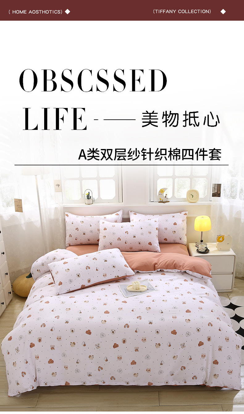(总)织写 2025新款A类双层纱针织棉四件套床单四件套床单四件套小清新四件套,初享时光-咖,初享时光-蓝,春意盎然,动物乐园,狗狗家族,红色樱桃,蝴蝶结-咖,蝴蝶结-绿,花开烂漫,浪漫物语,琉璃,森林物语,宛然,乡间漫步,小草莓,小狗点点,小熊宝贝,紫色浪漫