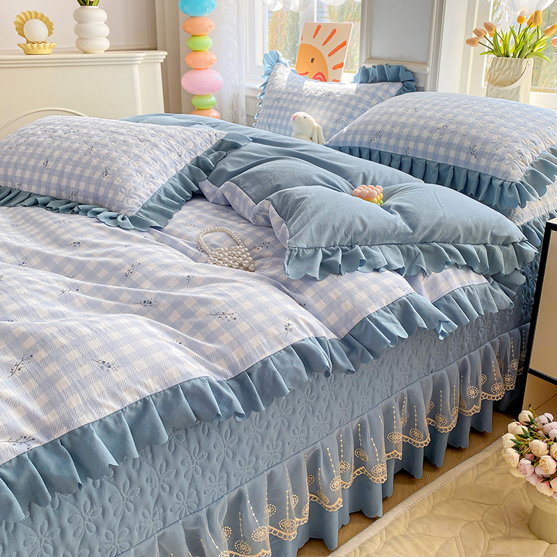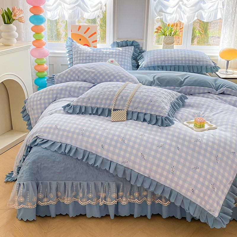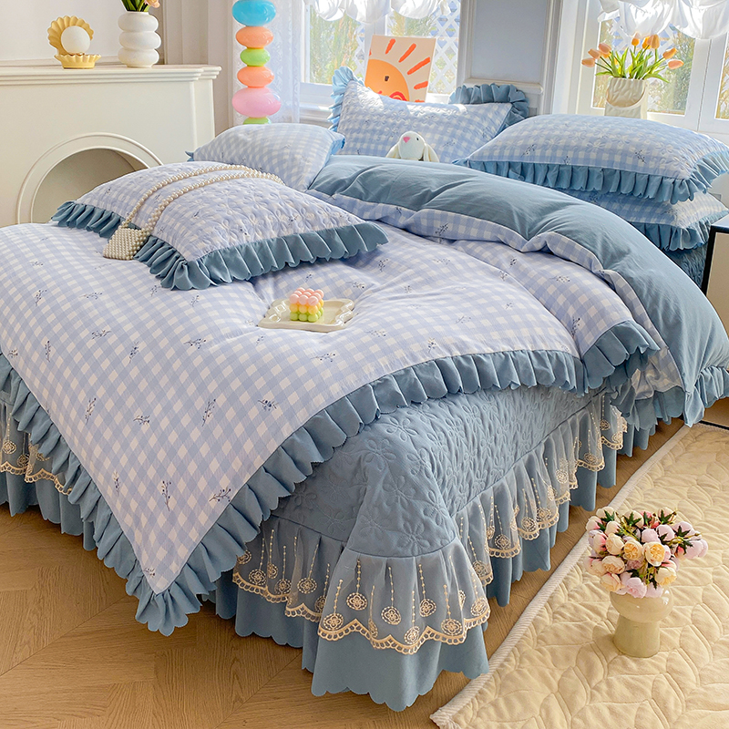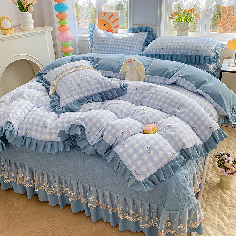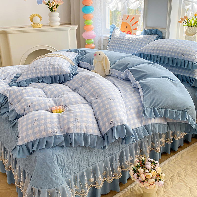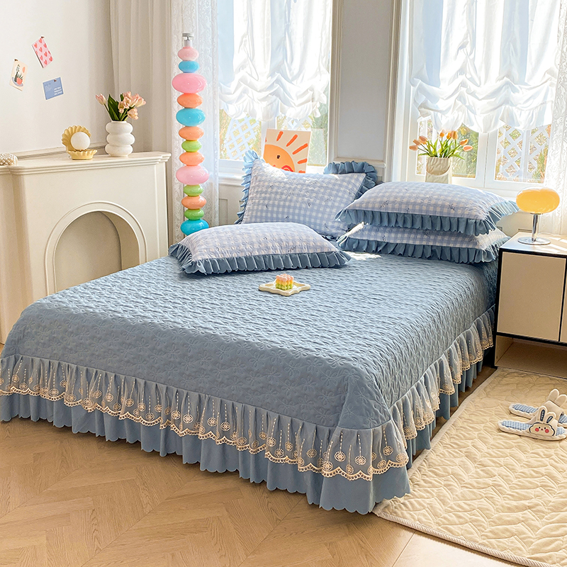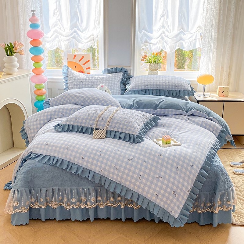 提花大世界 2025直播热款A类针织棉双层纱夹棉床盖床裙花边单件三件四件套 蓝色格调