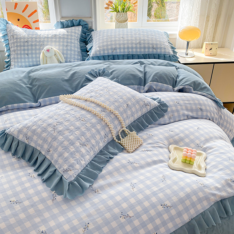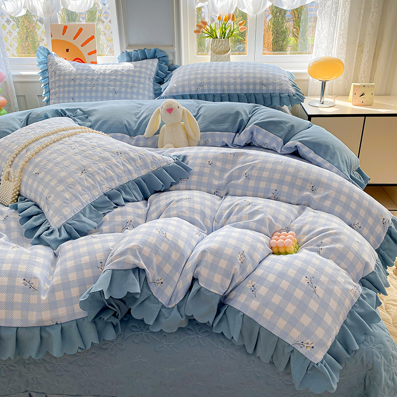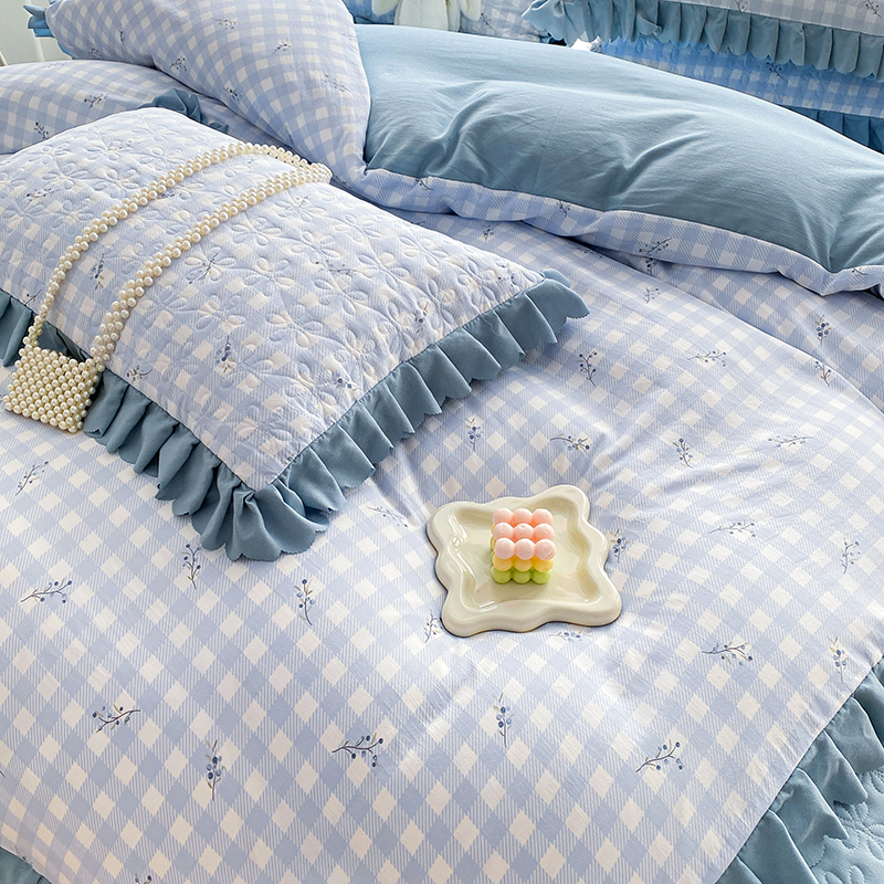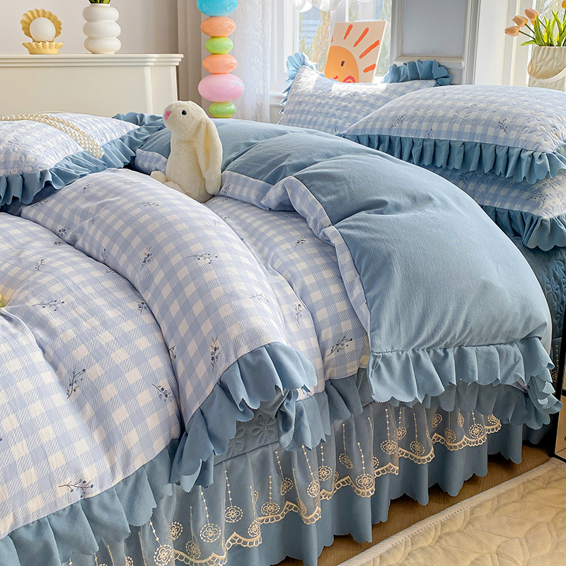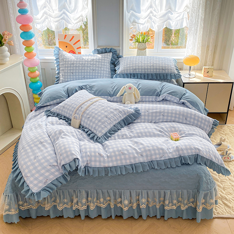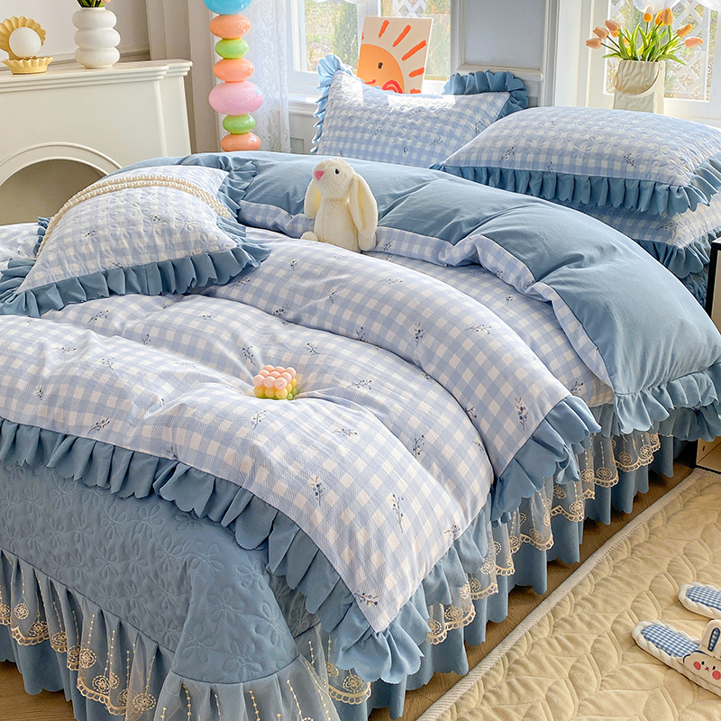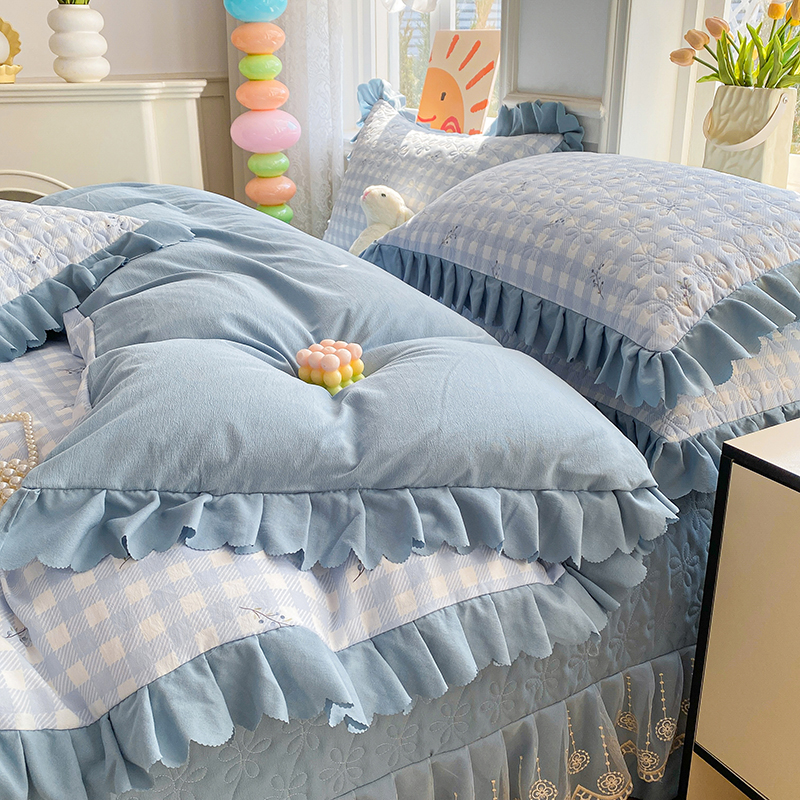提花大世界 2025直播热款A类针织棉双层纱夹棉床盖床裙花边单件三件四件套 蓝色格调