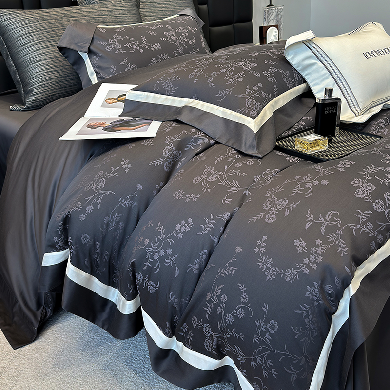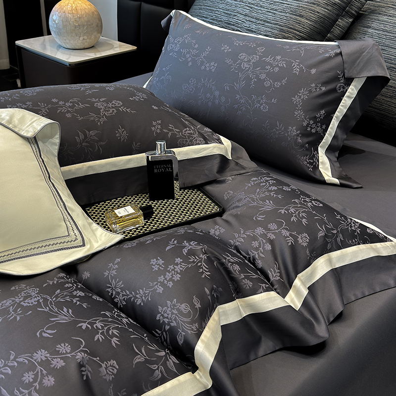 商品名称:若未家居 LOVEWE HOUSE 2025新款兰精天丝棉轻奢提花双拼撞色工艺套件四件套-春晓 春晓-夜幕灰