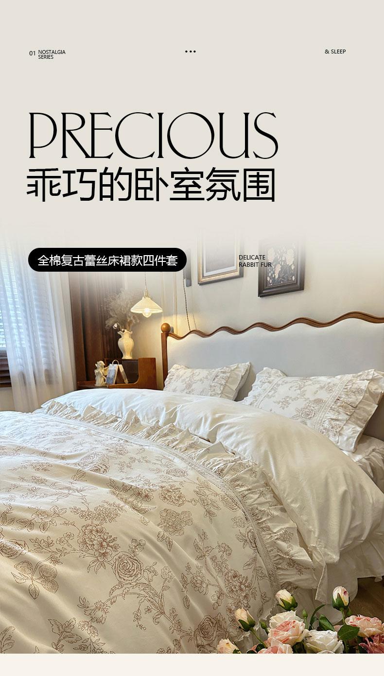 惯盈家纺 2025新款皮草绒兔绒牛奶绒复古法式蕾丝床裙款四件套-墨间花叙(含买家秀)米咖,米咖